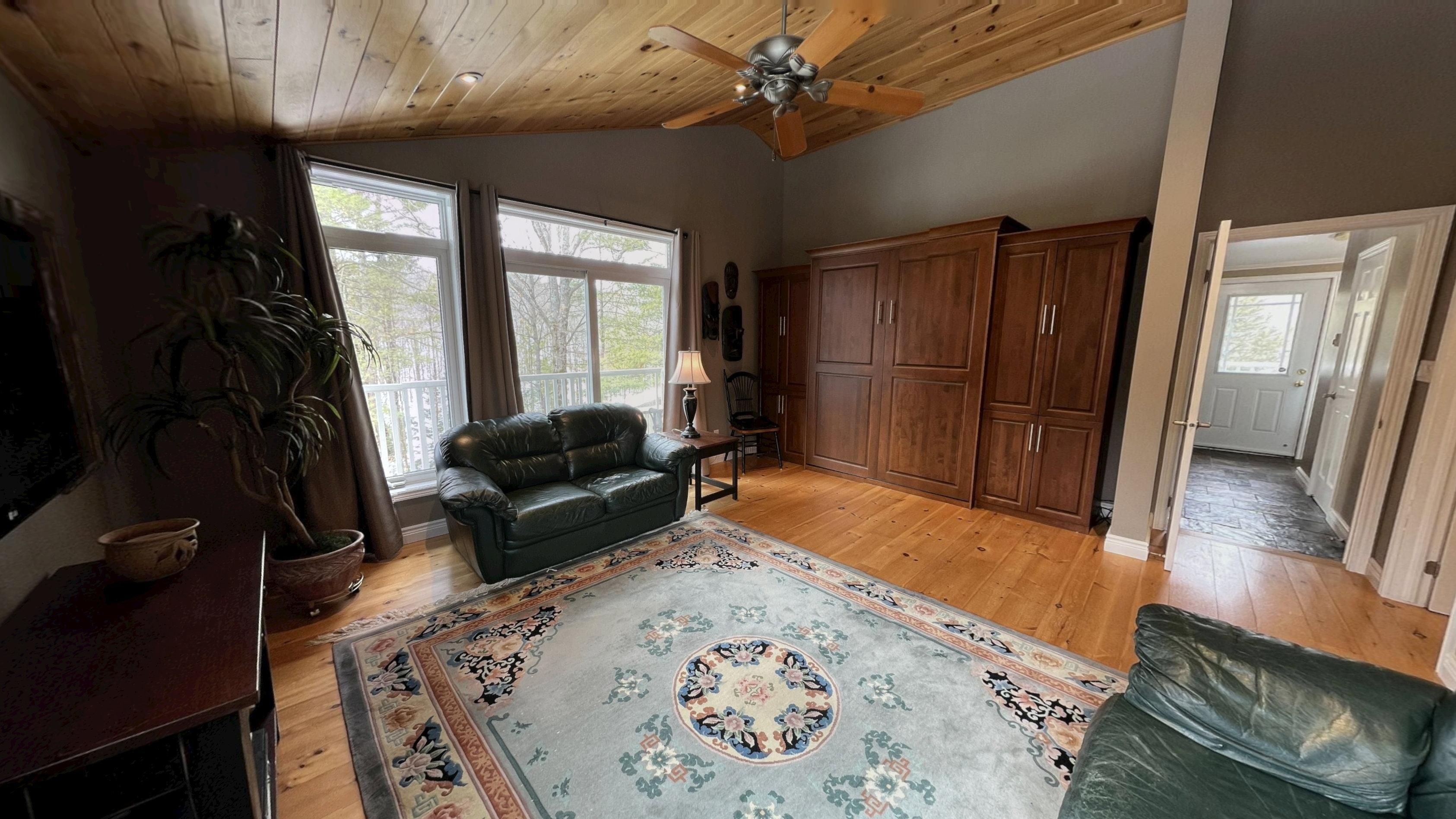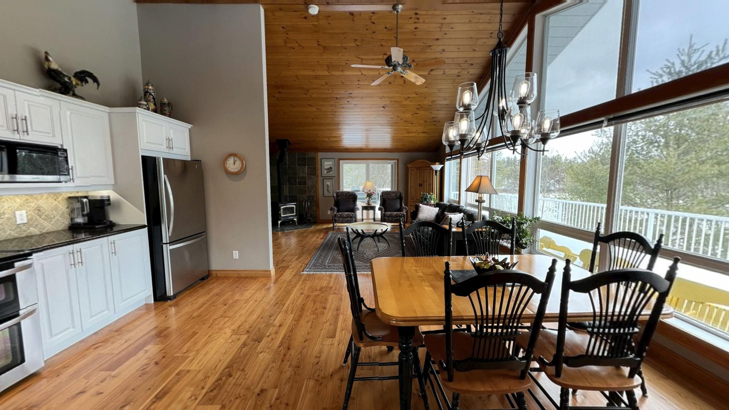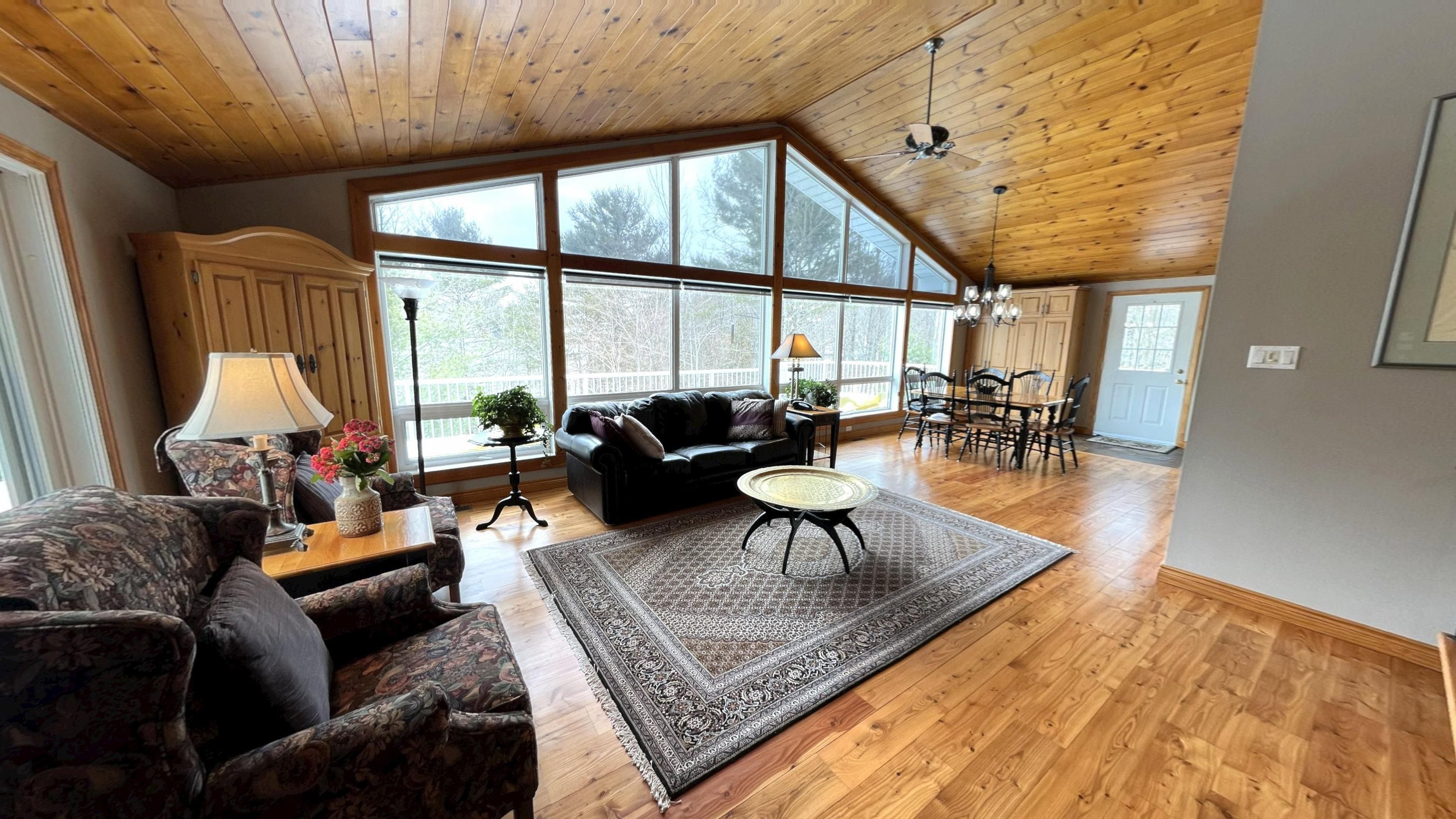 • Open-concept great room featuring cathedral pine ceilings and lake views.