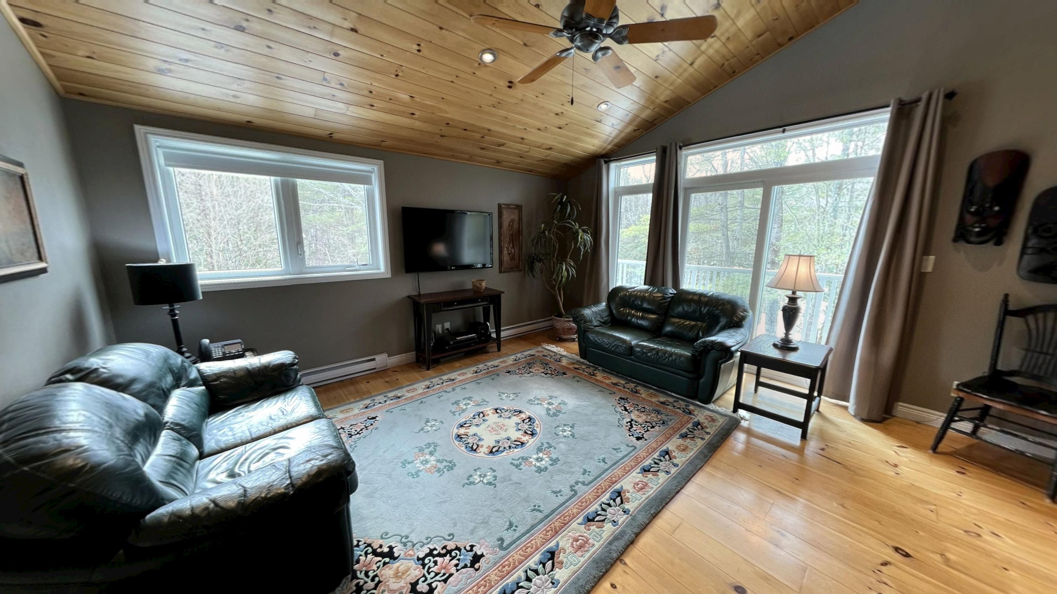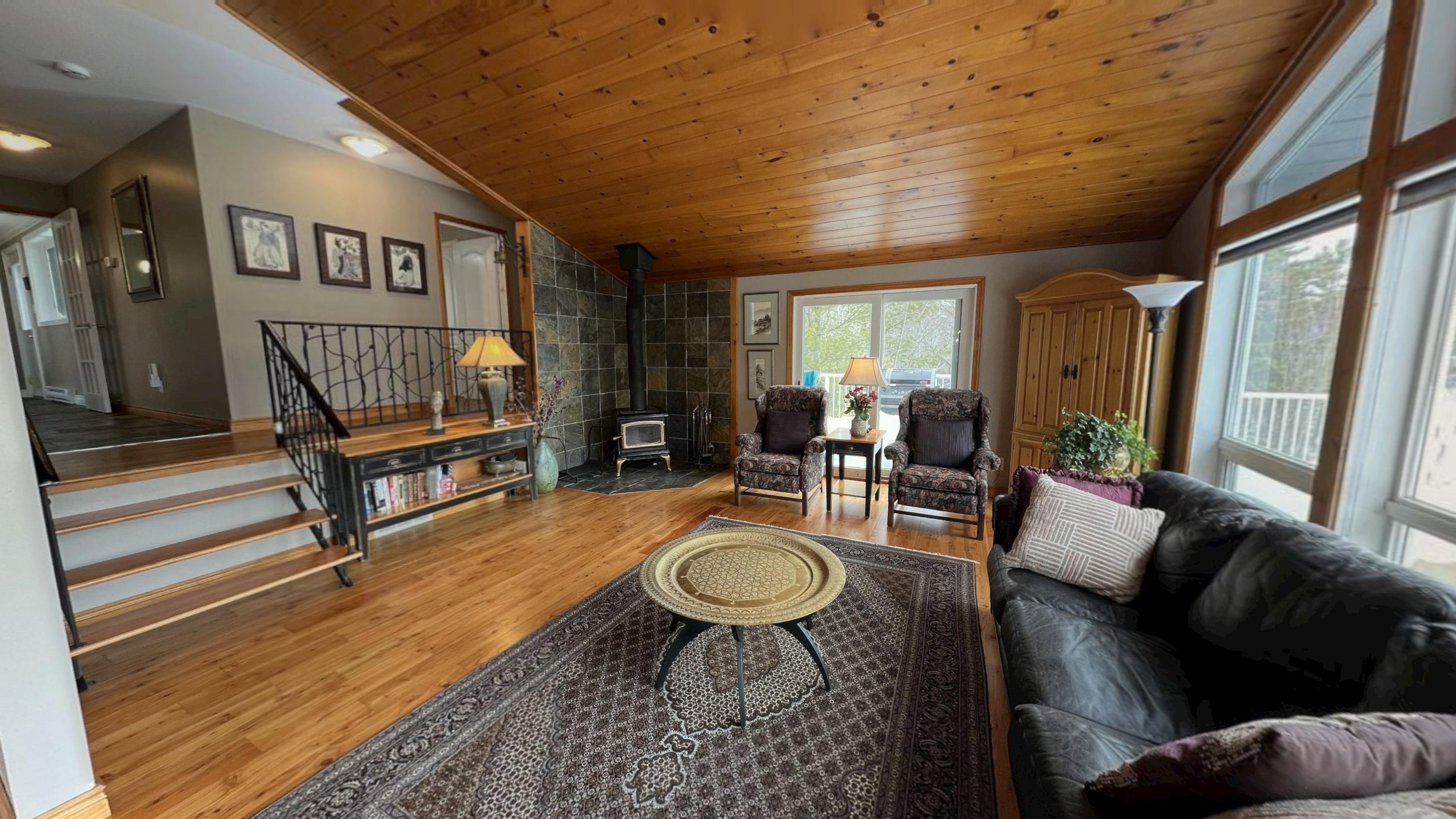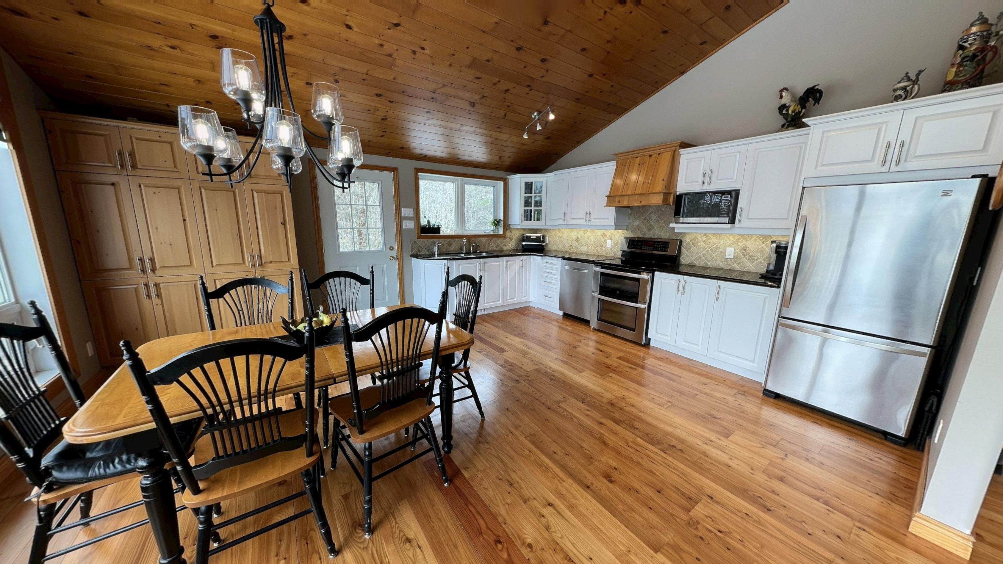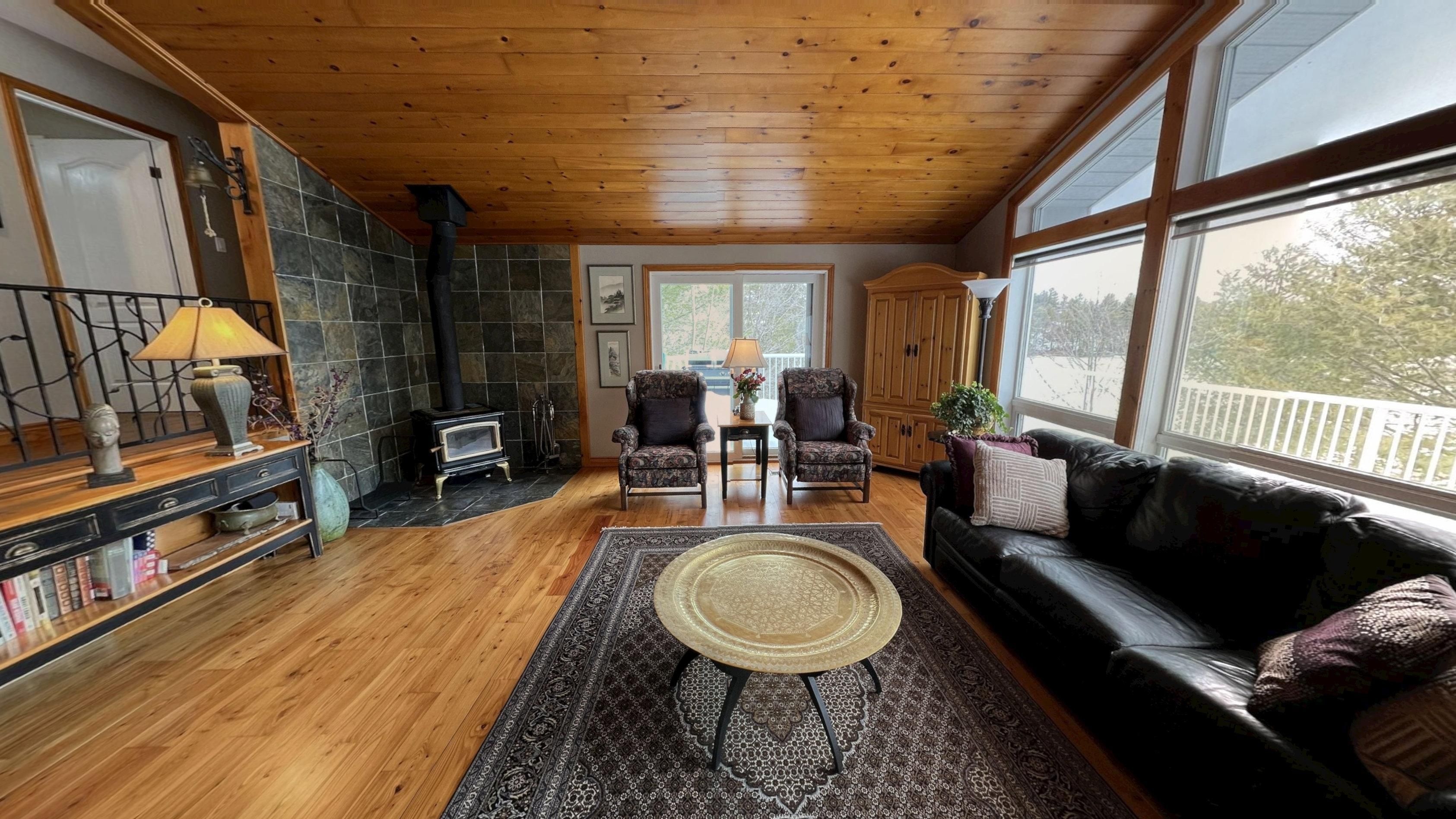 • Open-concept great room featuring cathedral pine ceilings and lake views.