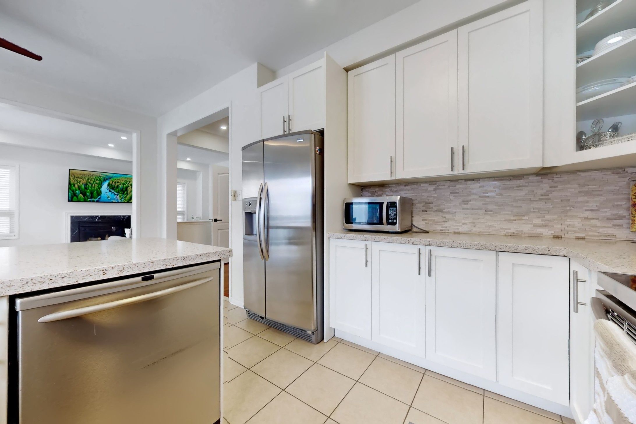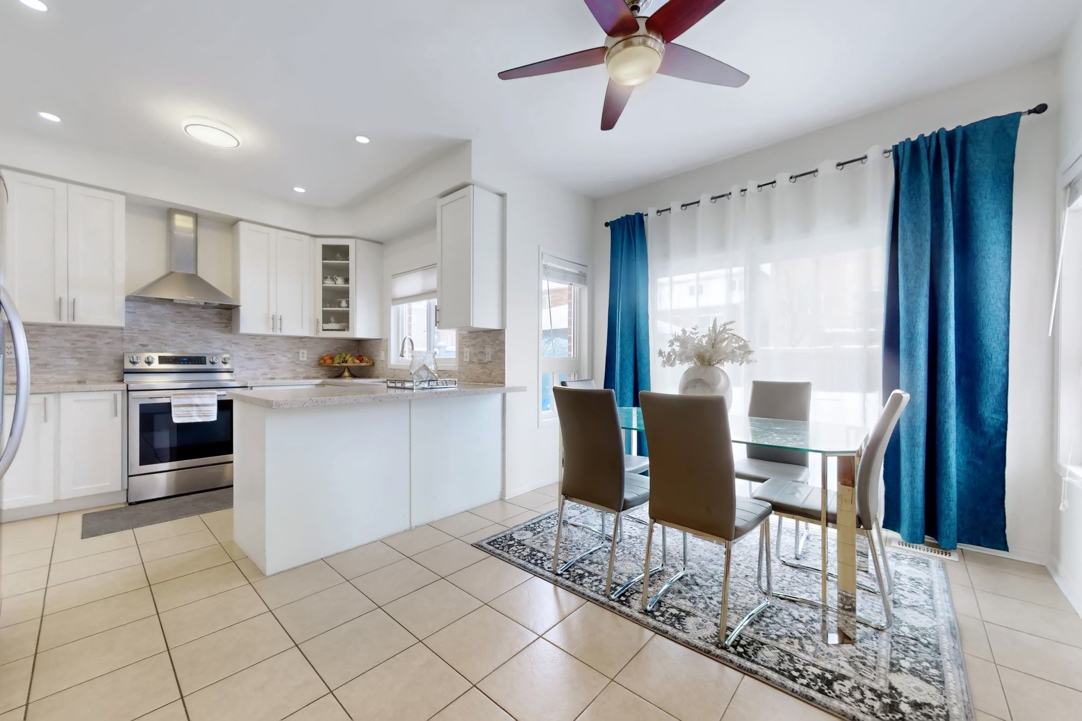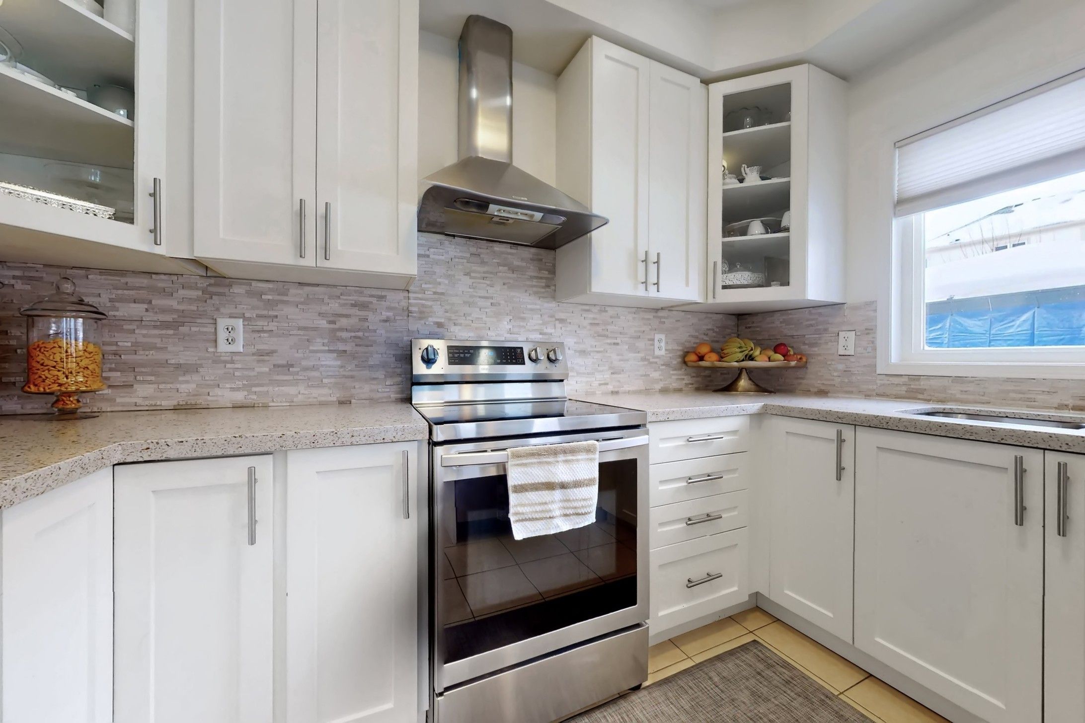 • Bright modern kitchen with quartz countertops and breakfast bar.
