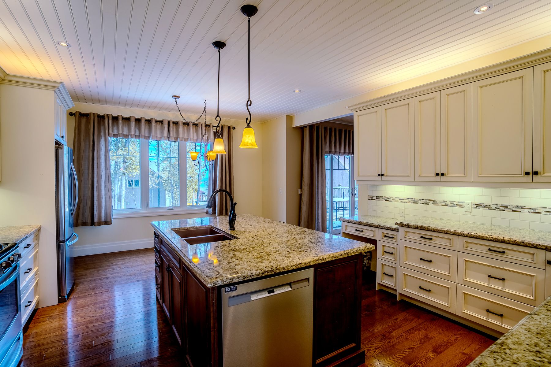 • Gourmet chef's kitchen with granite countertops and modern appliances.