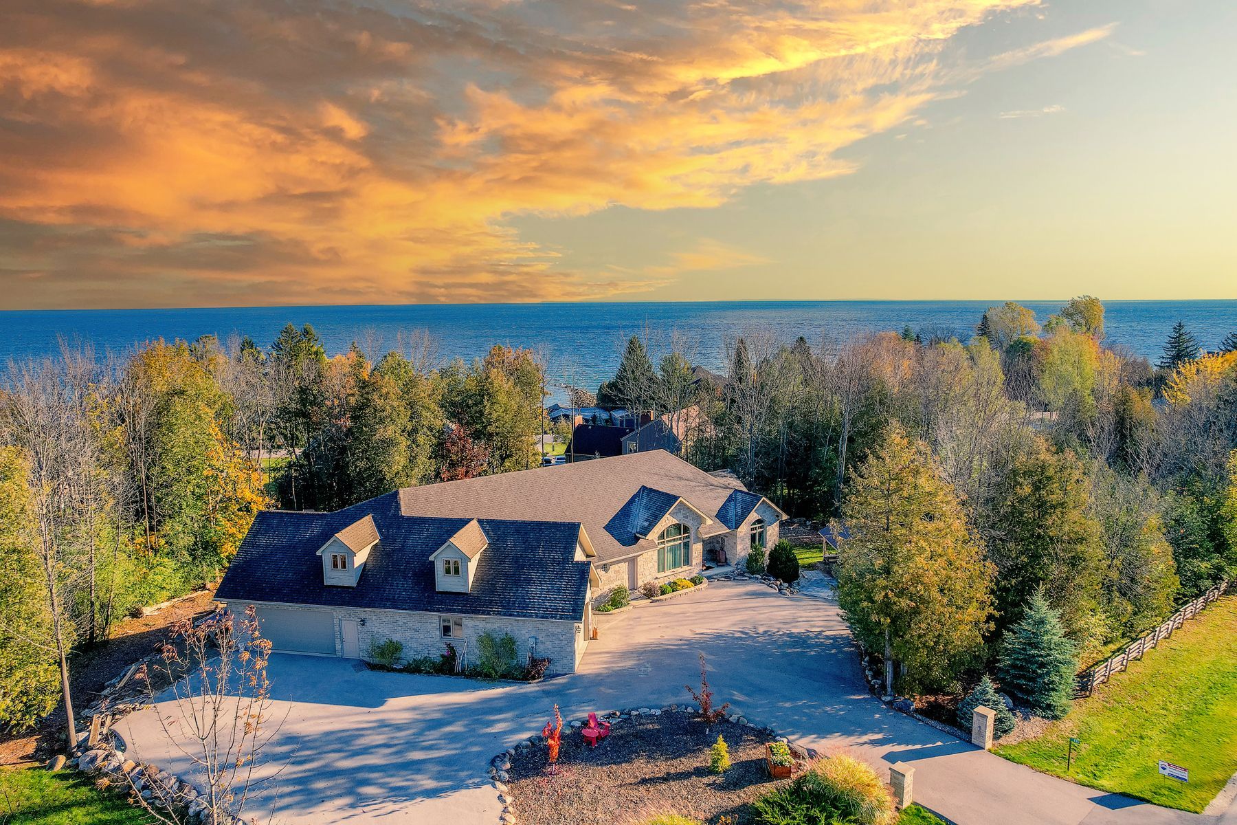 Welcome to this exceptional 4,588 sq ft custom-built home, ideally situated on a private 0. 89-acre (+/-) cul-de-sac in one of meaford's most desirable neighbourhoods. Offering 5 bedrooms and 3. 5 bathrooms, this beautifully designed residence blends timeless curb appeal with comfort and functionality. The exterior impresses with professional landscaping, split rail fencing, dual stone-pillared driveways, and a striking stone and brick façade with steep rooflines and expansive windows. Inside, the main level features 9-foot ceilings, wide hallways, oak hardwood and ceramic flooring, and vaulted tongue-and-groove ceilings in the open-concept living, dining, and kitchen areas. A gas fireplace with custom oak built-ins creates a warm focal point. The chef's kitchen showcases custom off-white cabinetry, granite countertops, dual stone sinks, a central island, tiled backsplash, and stainless-trim appliances including a gas range, hood fan, fridge with ice maker, and dishwasher. A cedar-lined three-season sunroom adds charm and flexibility, while the living room opens to a deck with panoramic georgian bay views. The finished lower level offers a spacious rec room with walk-out access, ideal for entertaining, guests, or extended family living. Two oversized, insulated, and drywalled garages provide space for up to four vehicles, a workshop, or storage-one with heated floors and the other with a unit heater. The landscaped yard includes a vegetable garden and garden shelter for outdoor enjoyment. Additional features include main-floor laundry, natural gas furnace, central air, hrv system, dual hot water heaters, central vacuum, municipal water, and an annually serviced eco-flow septic system. Built by the owner to a high standard of quality and craftsmanship, this property offers peaceful, upscale living just minutes from meaford's waterfront, golf, and amenities.