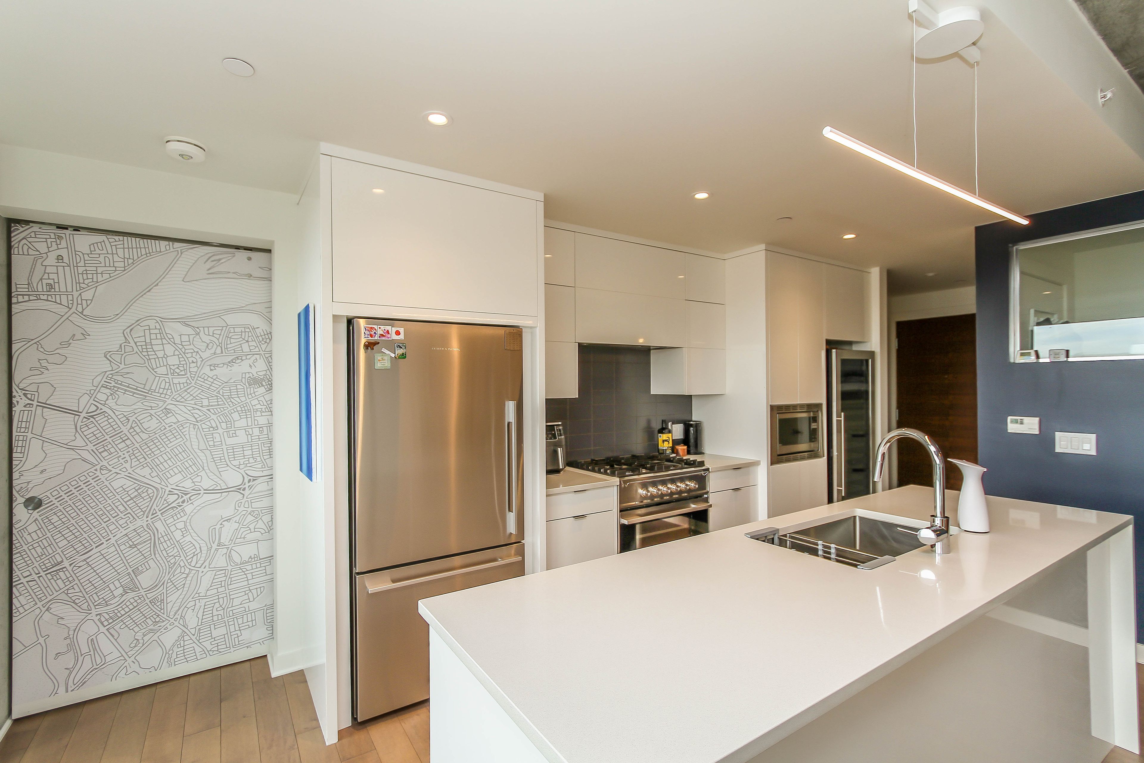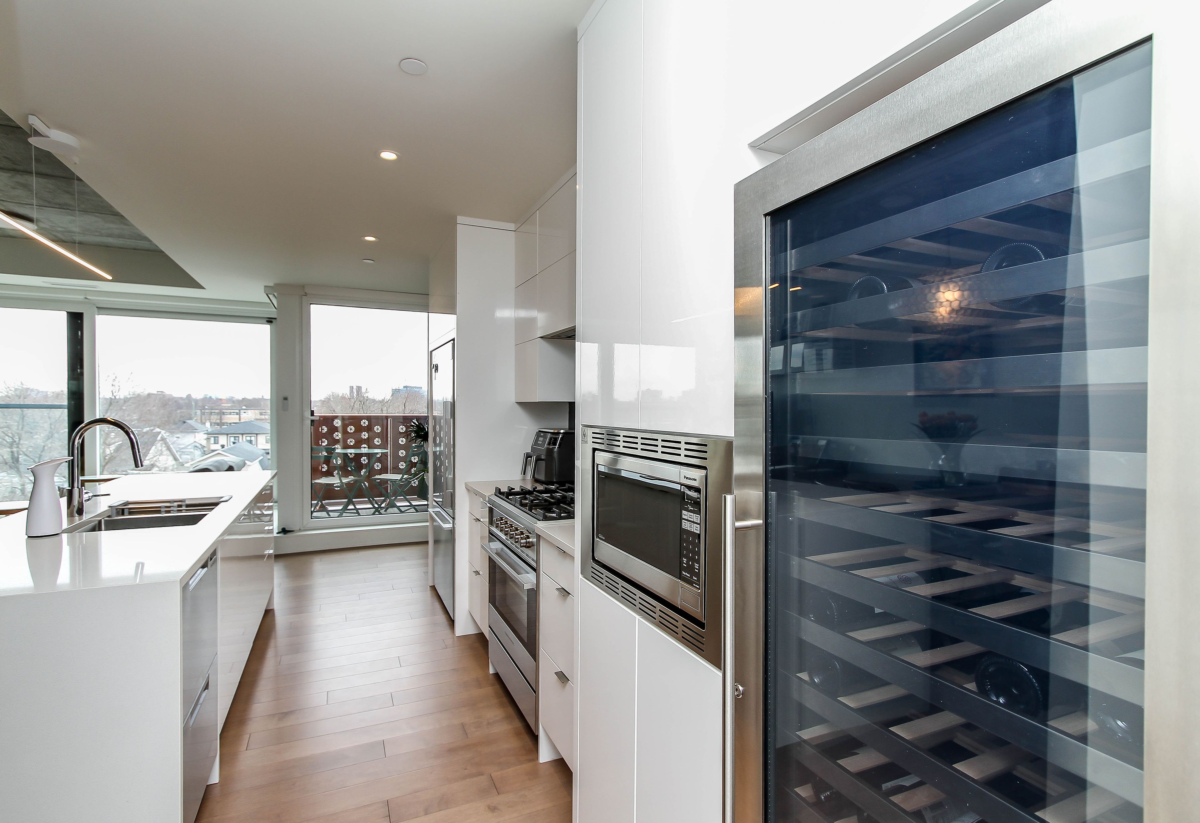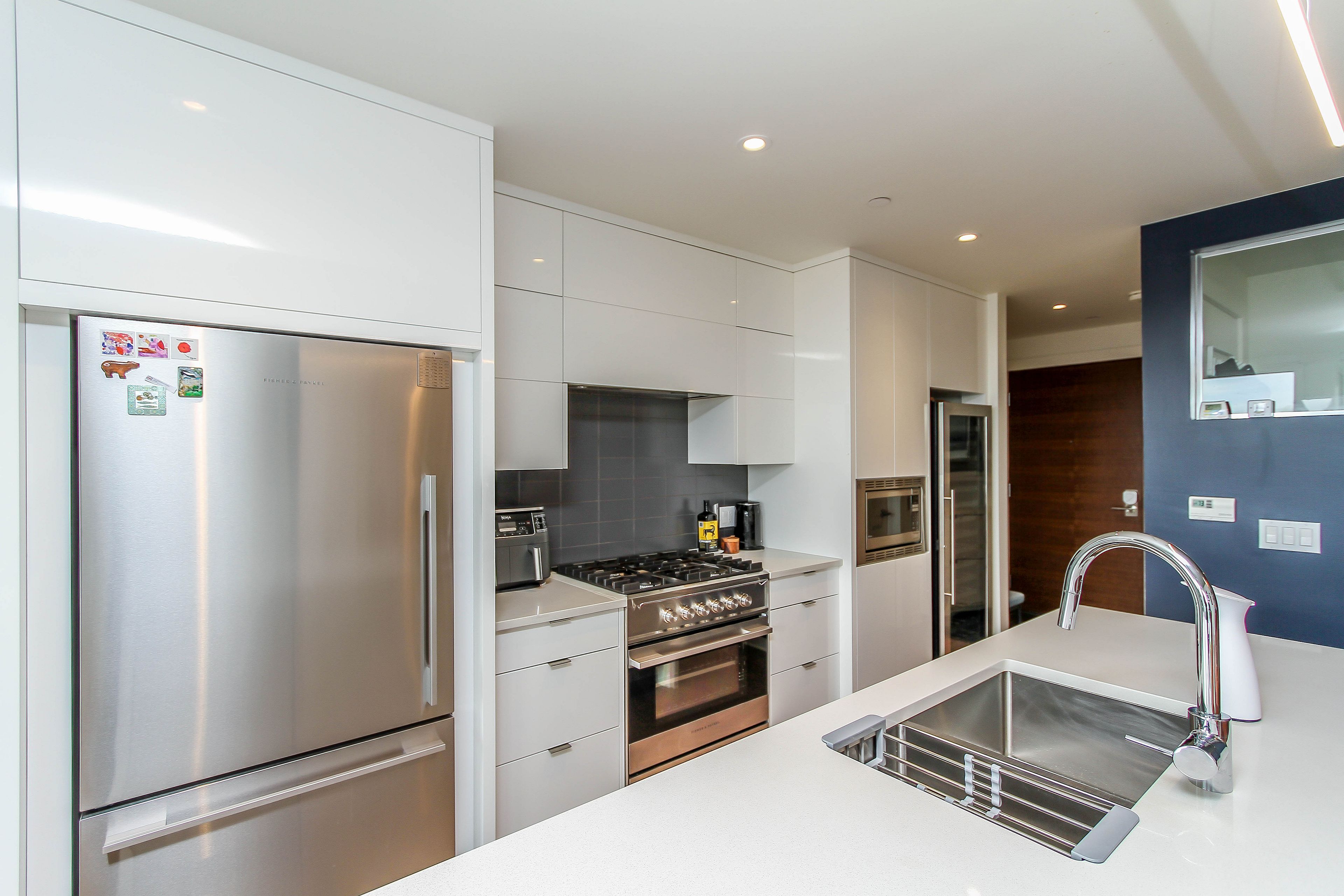 • High-end kitchen featuring quartz counters and premium appliances.