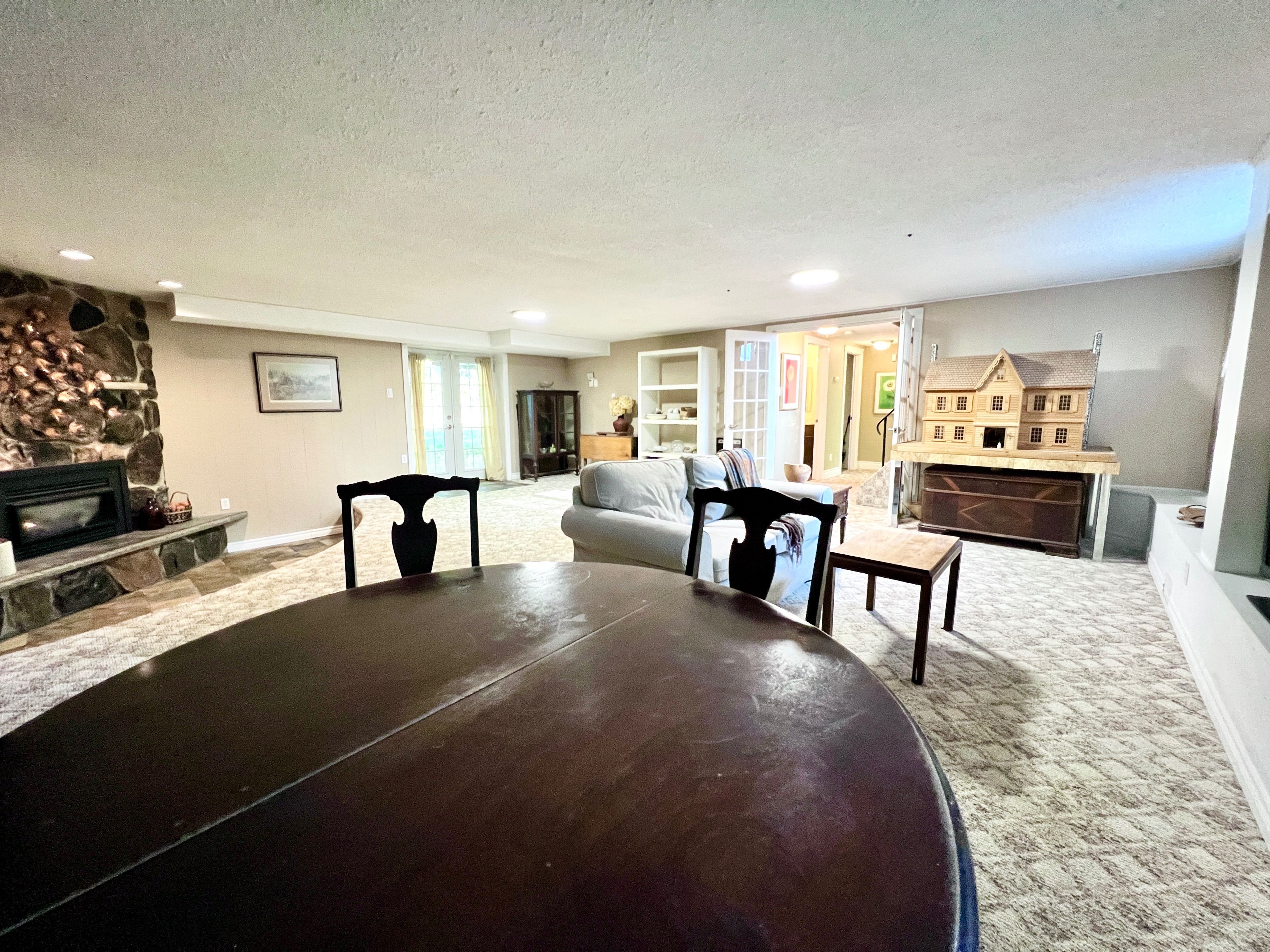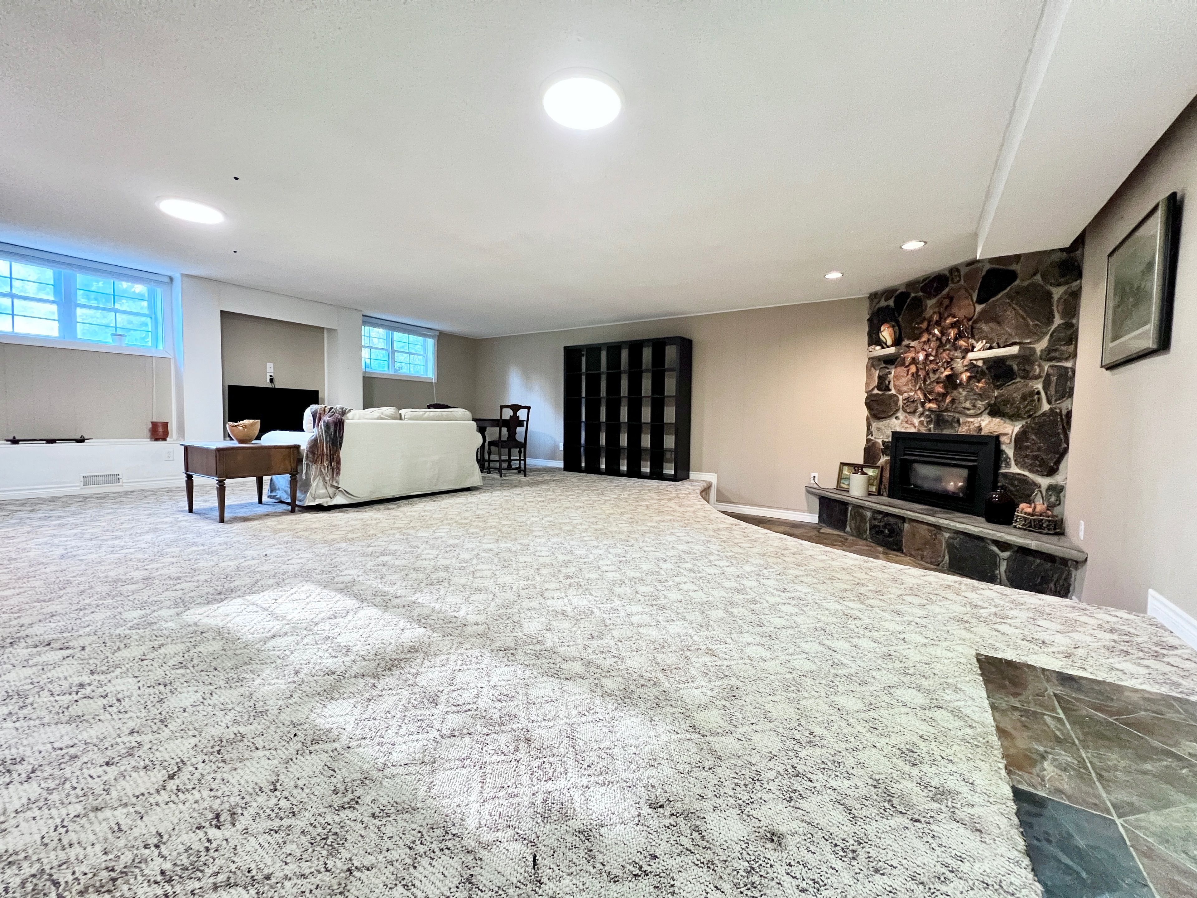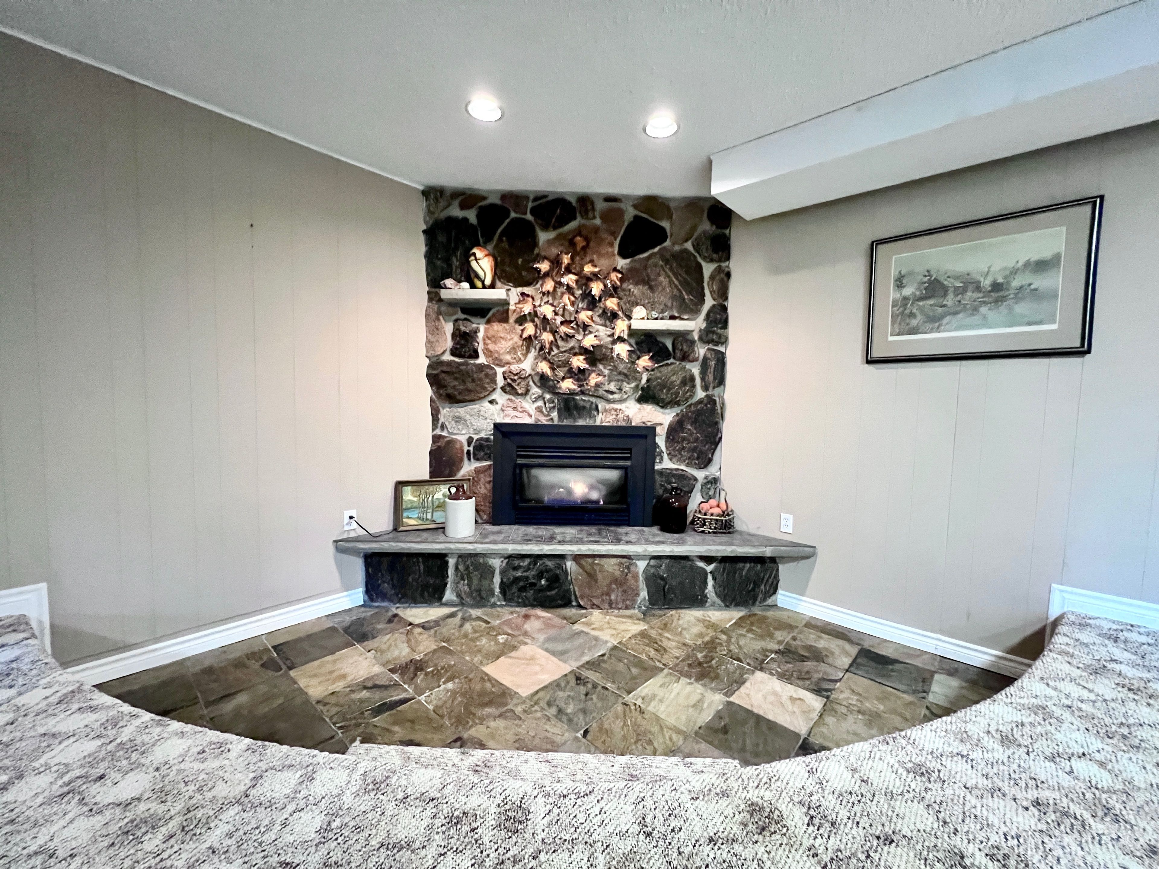 • Cozy stone fireplace perfect for entertaining or family nights in.