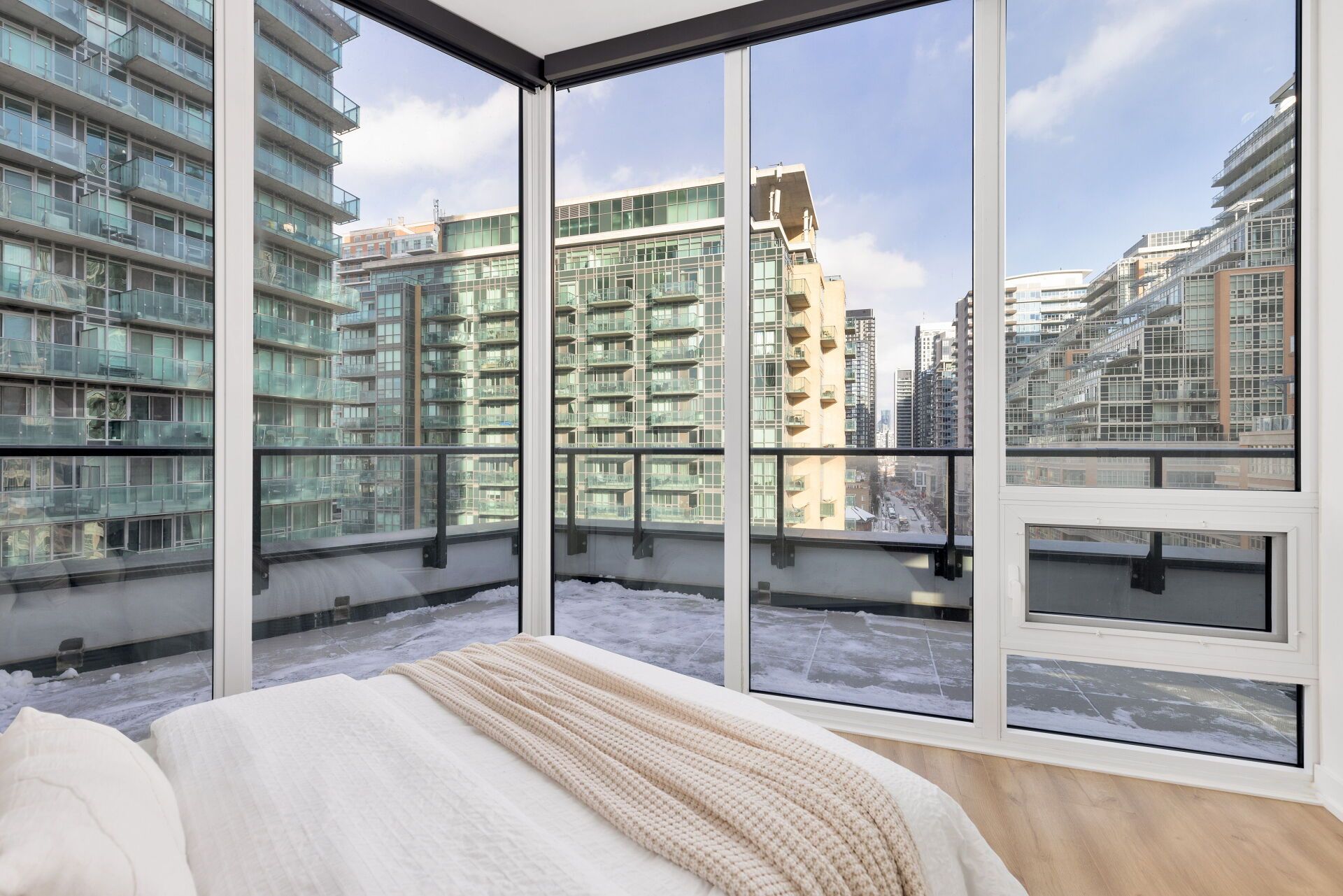 Experience the best of summer with this rare 500-square-foot wraparound terrace and gas line hookup - liberty village's premier outdoor living opportunity. This corner 3-bedroom + den residence at 135 east liberty offers breathtaking unobstructed lake views from its expansive south-east terrace, complemented by custom motorized floor-to-ceiling blinds throughout. Built in 2021, this modern suite showcases thoughtful design throughout - from 9-and-a-half-foot ceilings and floor-to-ceiling windows without bulkheads, to engineered hardwood floors and sound-attenuated windows that create a peaceful sanctuary above the city. The intelligent layout maximizes privacy with most walls unshared with neighbours. The chef's kitchen features premium finishes including quartz countertops and backsplash, custom island, stainless steel appliances (integrated fridge/dishwasher), and soft-close cabinetry. Adjacent custom bar area with beverage/wine cooler and built-in console creates the perfect entertaining space. Three generous bedrooms include a primary suite with south-facing lake views, direct terrace access, and 4-piece ensuite. The versatile second bedroom functions perfectly as a home office for work-from-home professionals. Corner third bedroom boasts eastern city views through a wall of windows. Premium building amenities (gym, party room, rooftop terrace, communal bbqs, shared workspace, concierge), one indoor parking spot, and a premium locker (close to parking space - huge bonus). Steps to trinity bellwoods, king west entertainment, liberty village dining, and waterfront trails. Easy access to gardiner/dvp, exhibition go and waterfront streetcar loop, for commuters moving to the city. Maintenance: $1,035. 32 includes heat, cac, common elements, internet and building insurance.