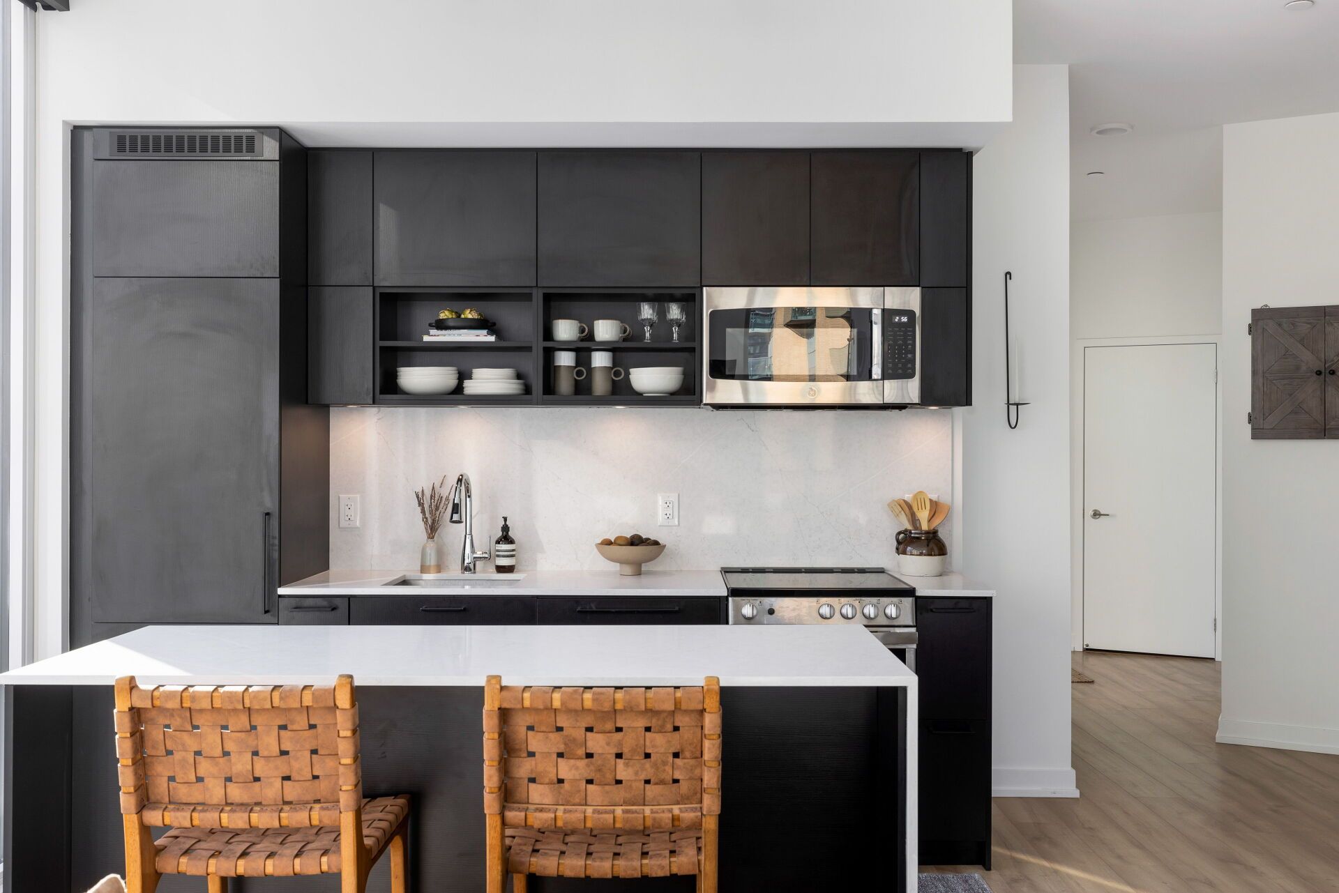 • Modern design with high ceilings, large windows, and engineered hardwood floors.