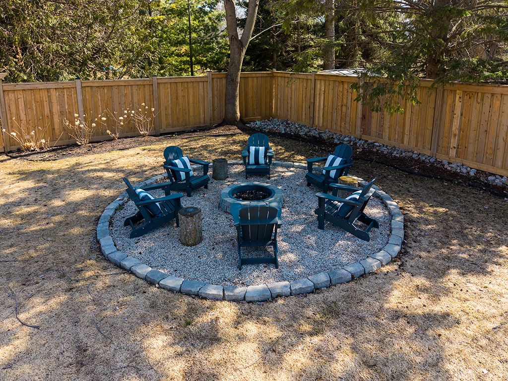 • Backyard features a hot tub, cozy fire pit, and lush landscaping.
