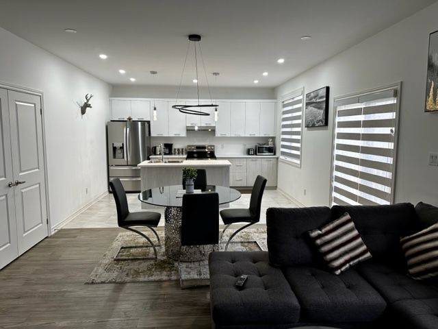 • Open-concept main floor with large windows and hardwood flooring.