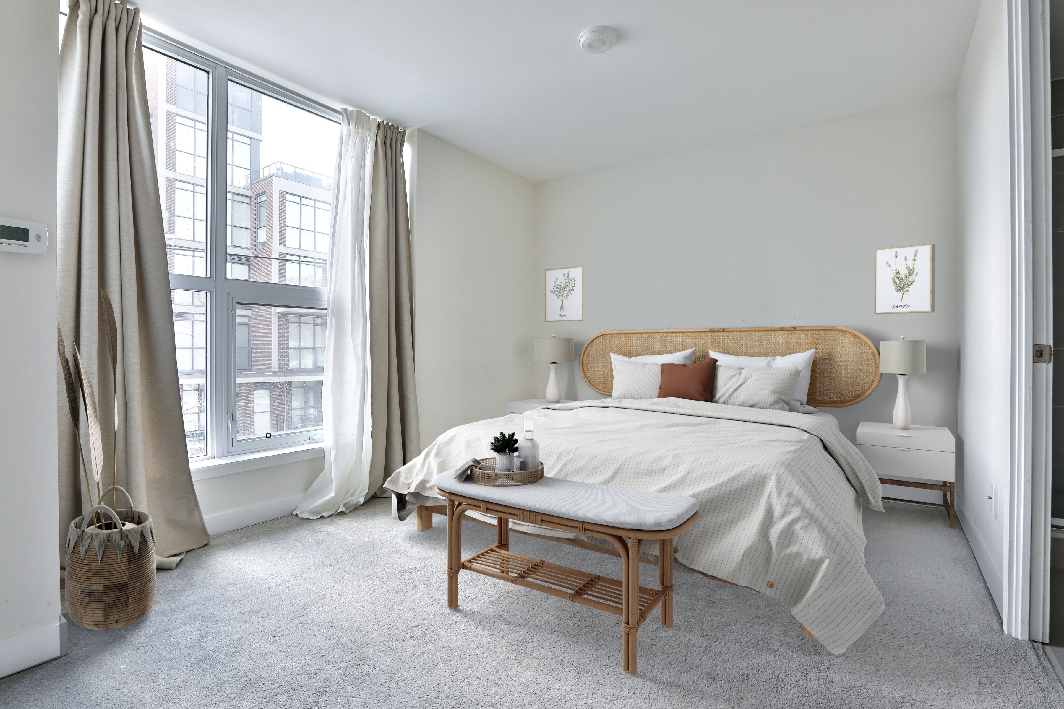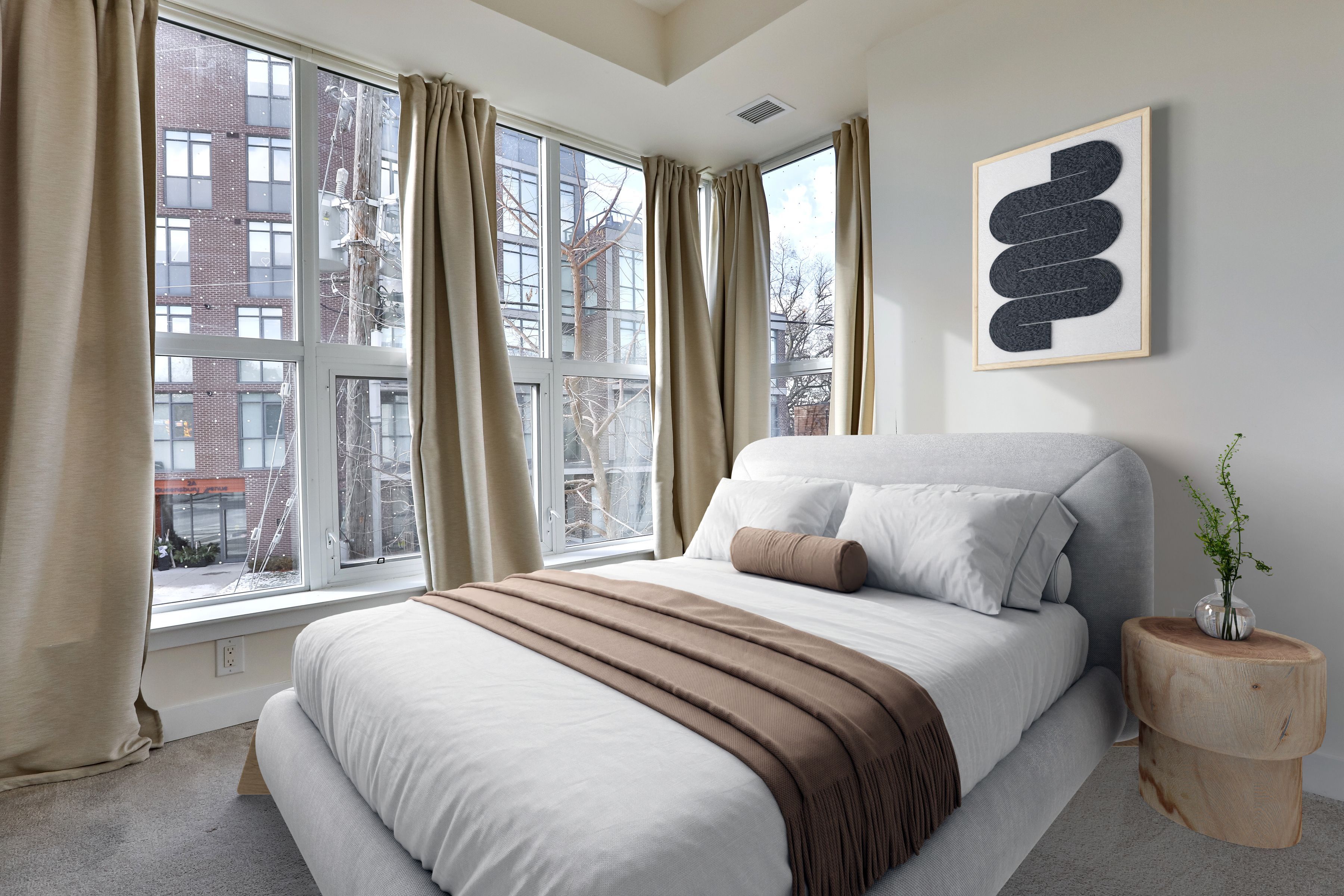 • Access to fitness center, rooftop terrace, and nearby waterfront trails.