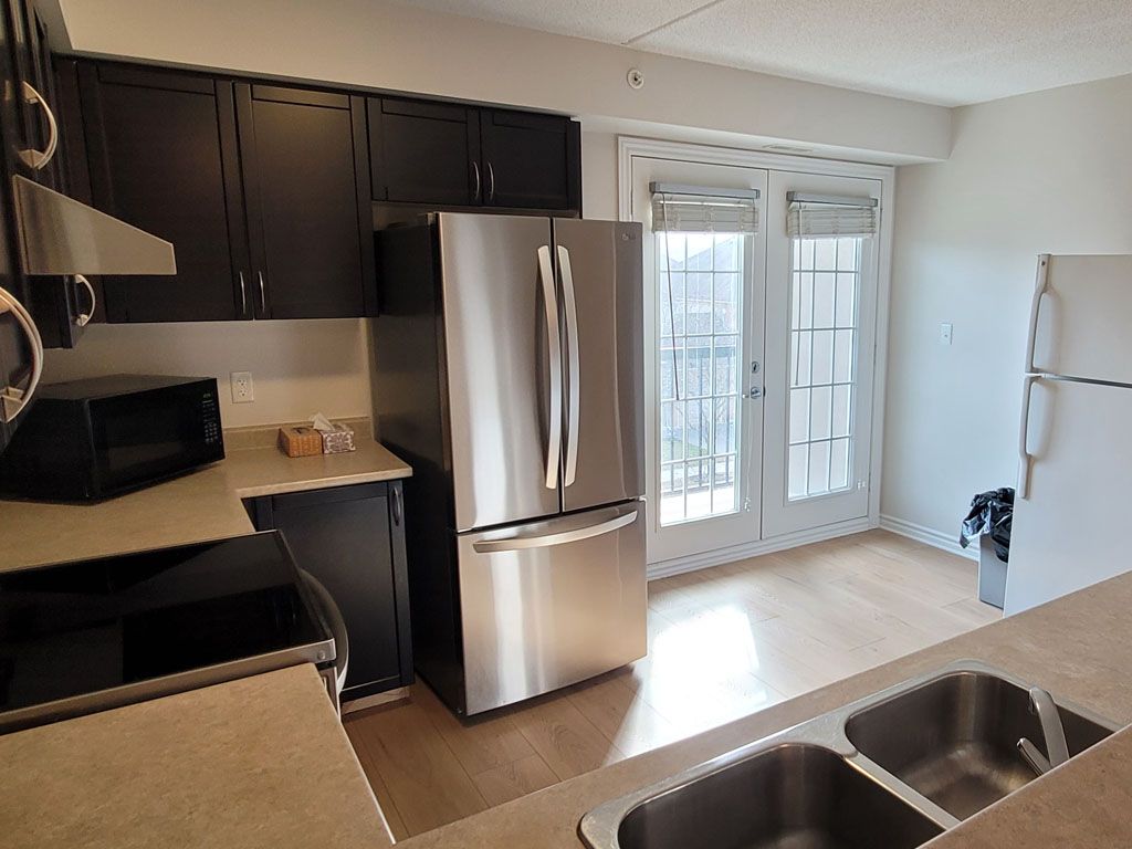 • Open concept kitchen with stainless steel appliances and balcony access.