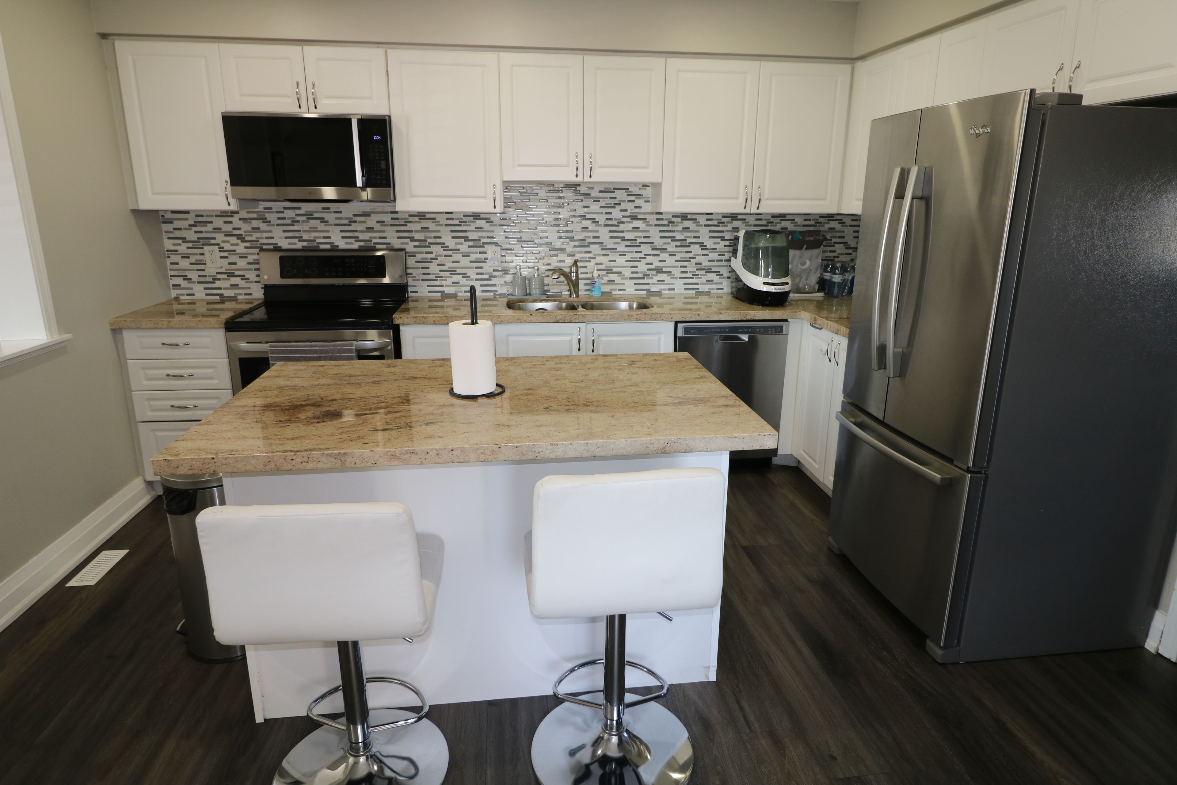 • Open concept kitchen with granite counters and stainless steel appliances.