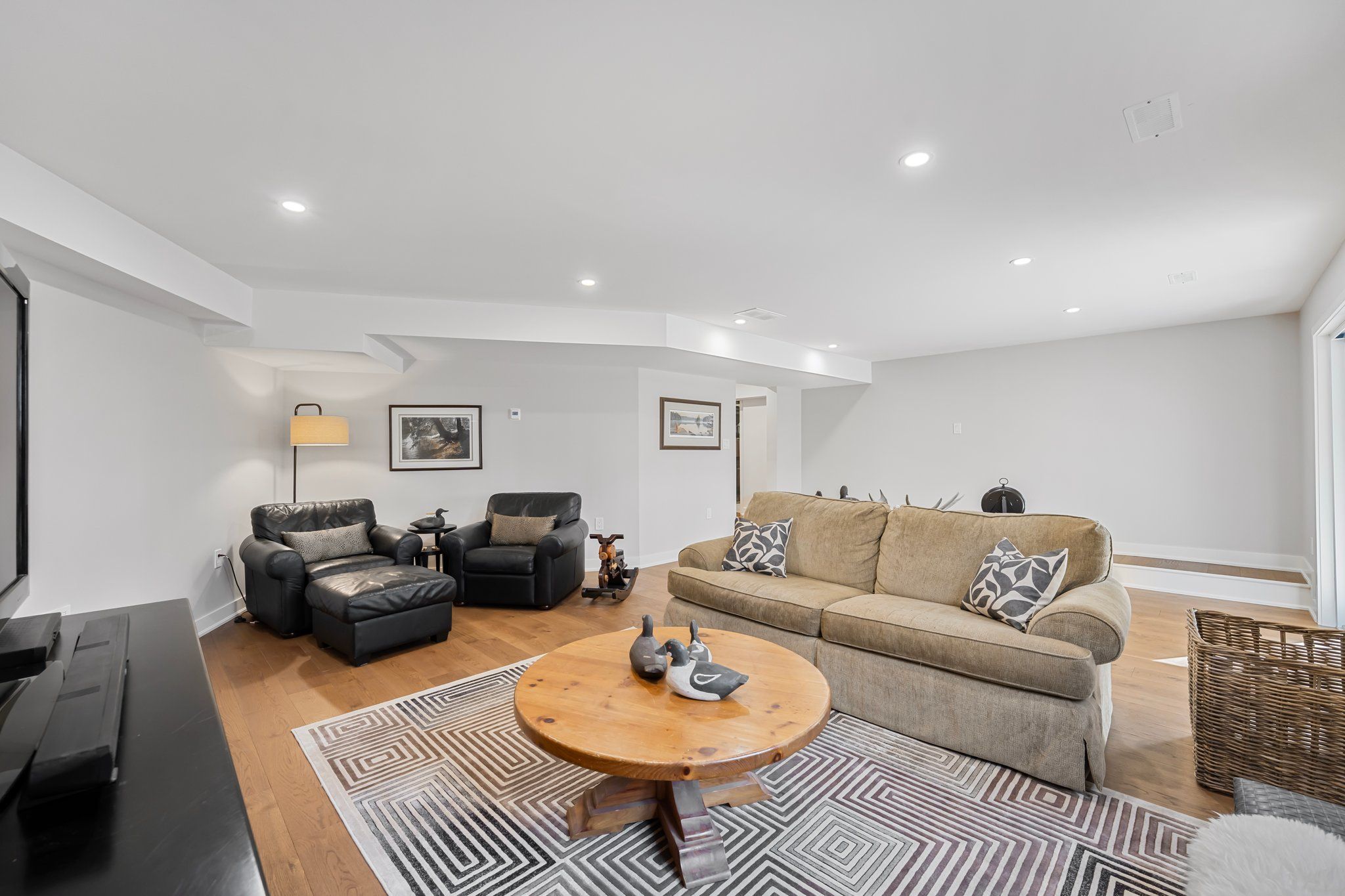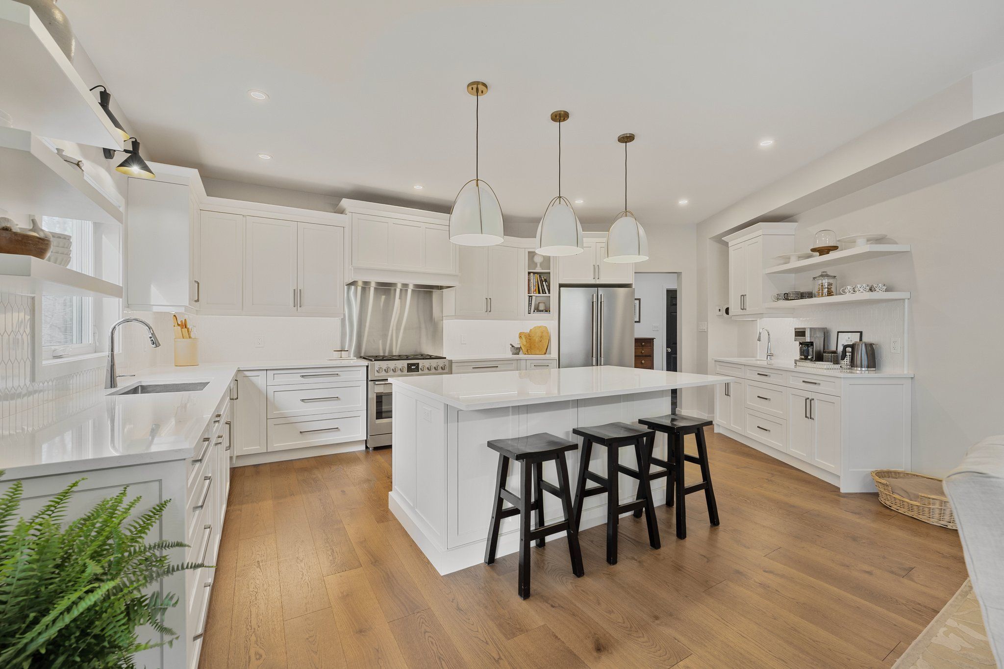 • Chef's kitchen features high-end appliances and a large island with quartz counters.
