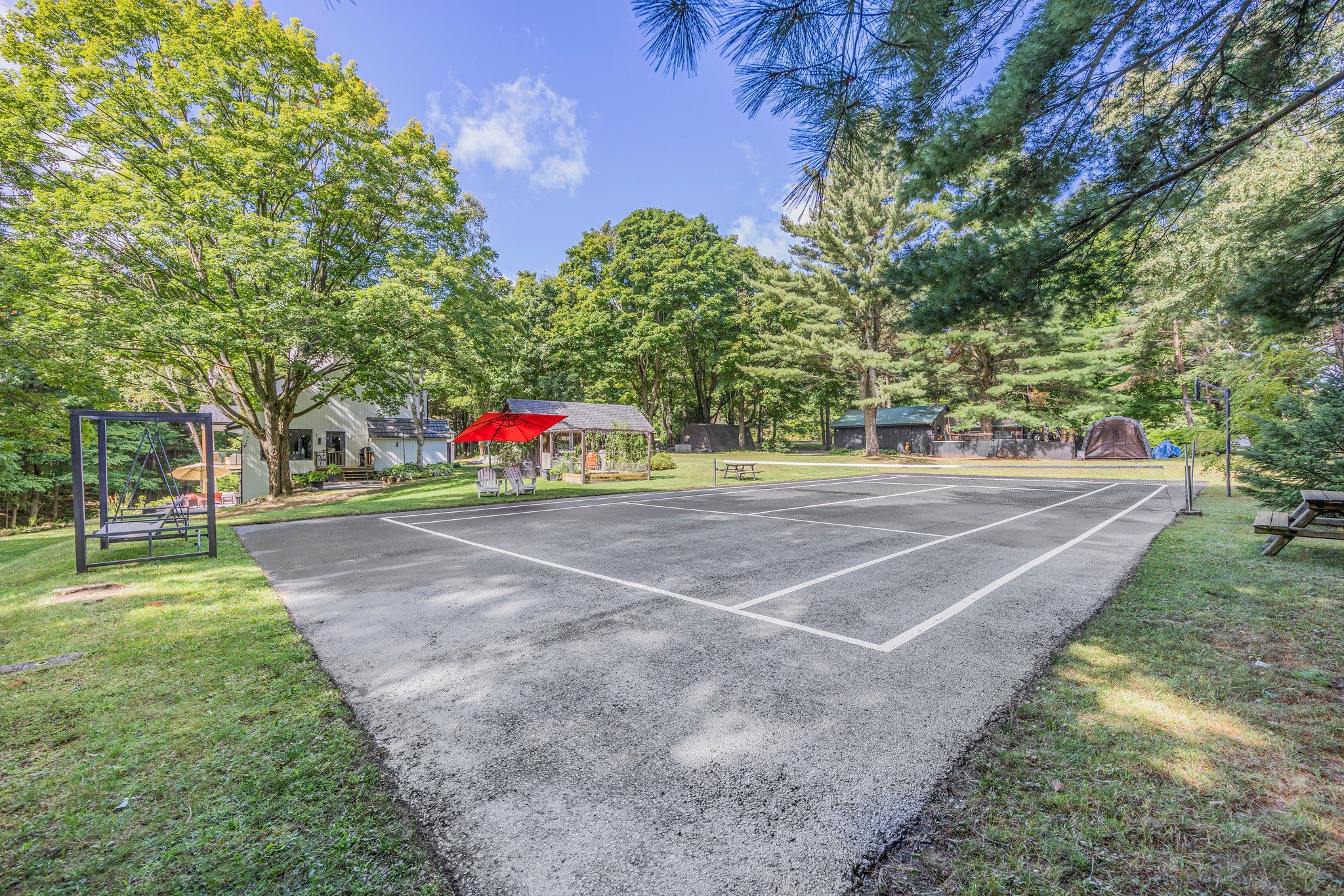 • Backyard includes landscaping, interlocked patios, and your own tennis/pickleball court.