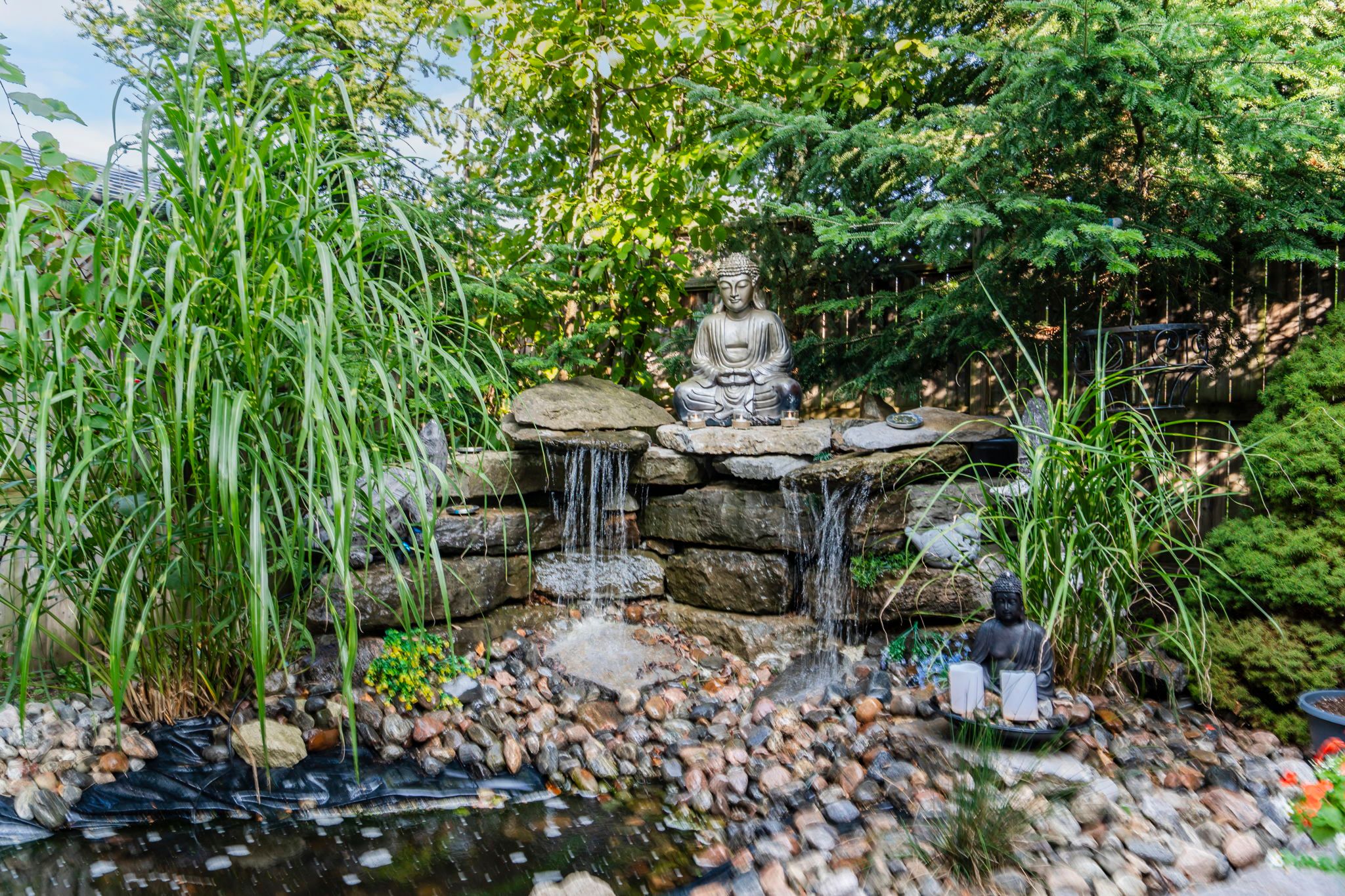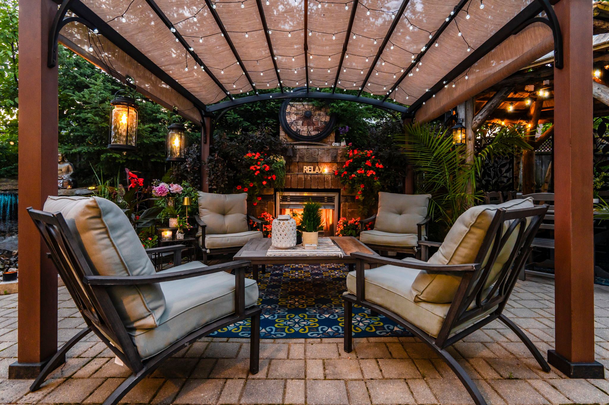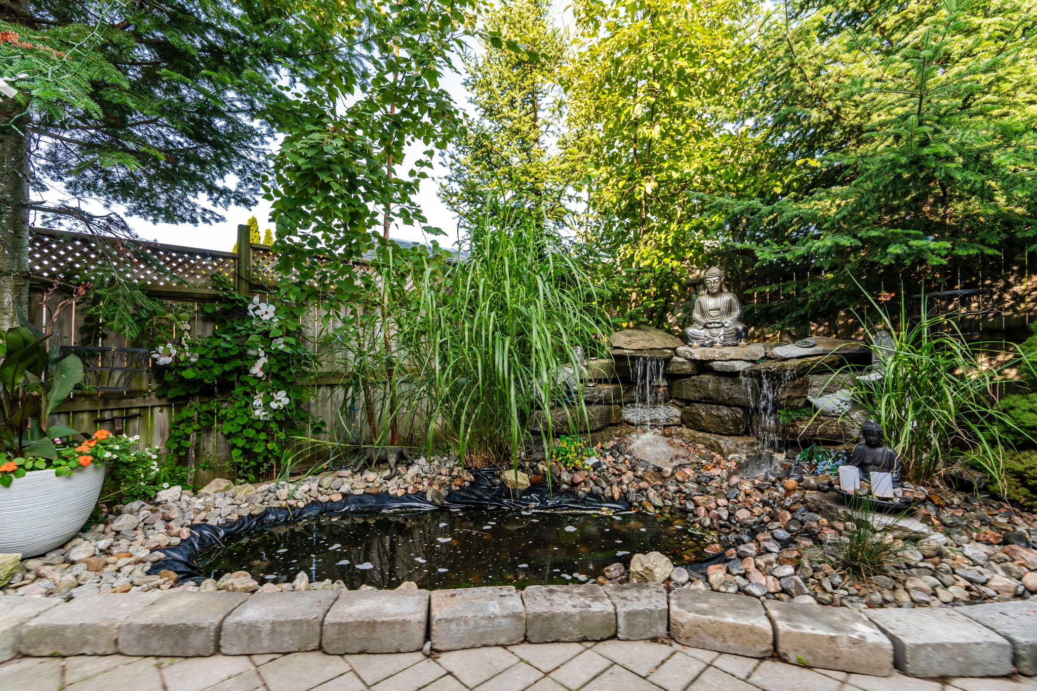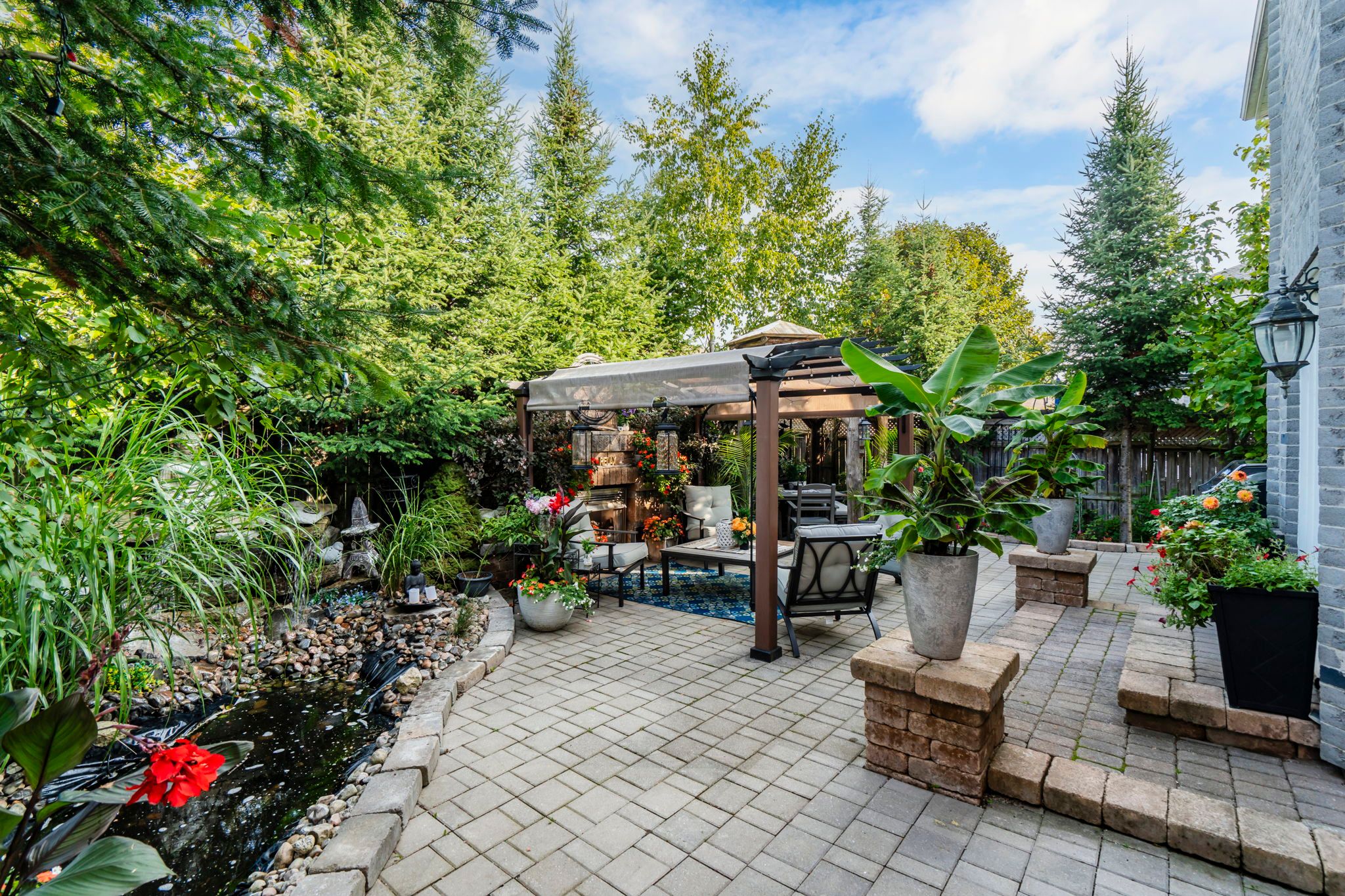 • Serene oasis-inspired backyard with stone patio, koi pond, and gazebo.