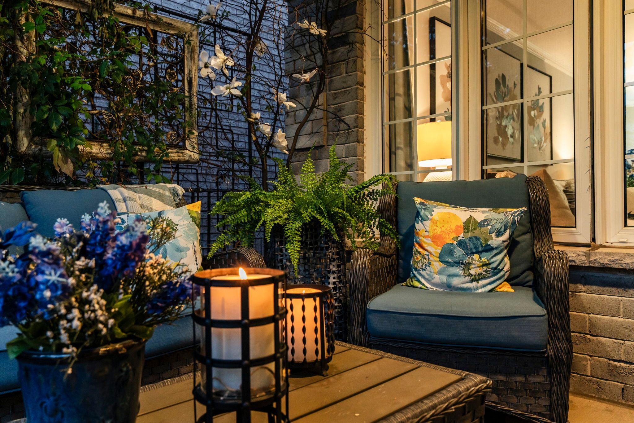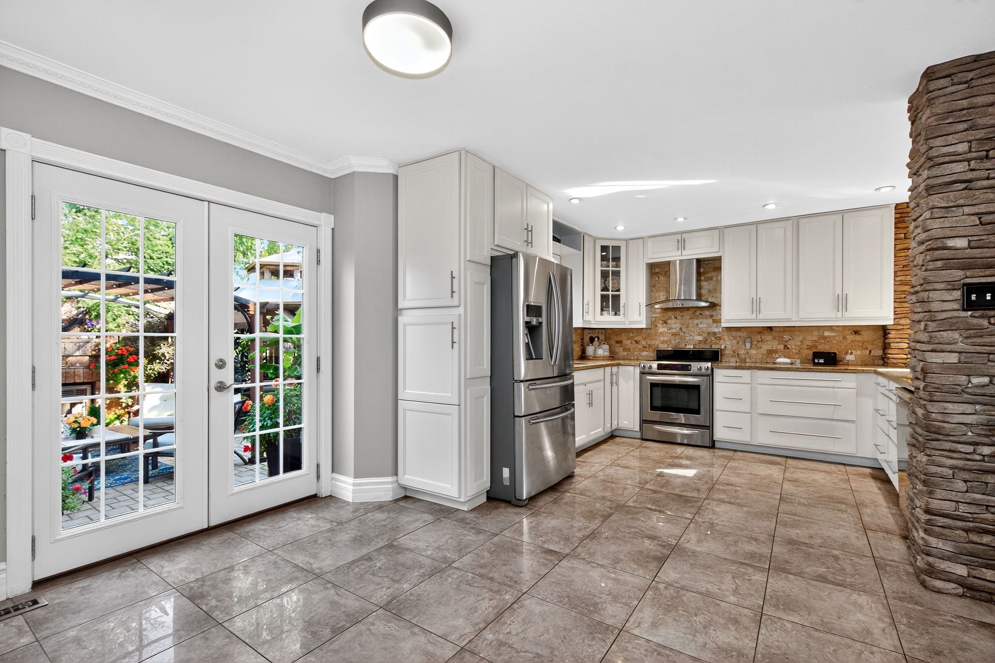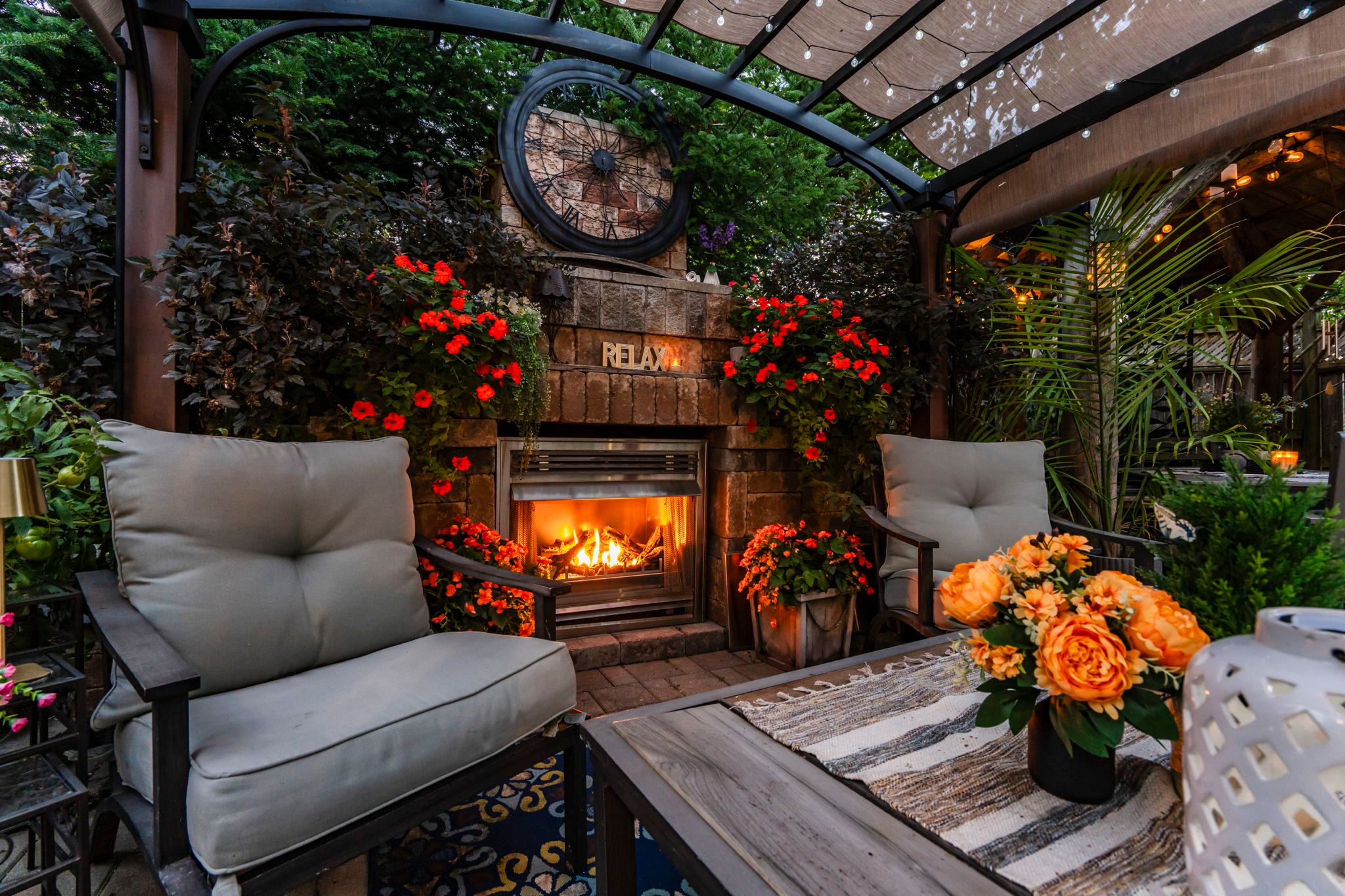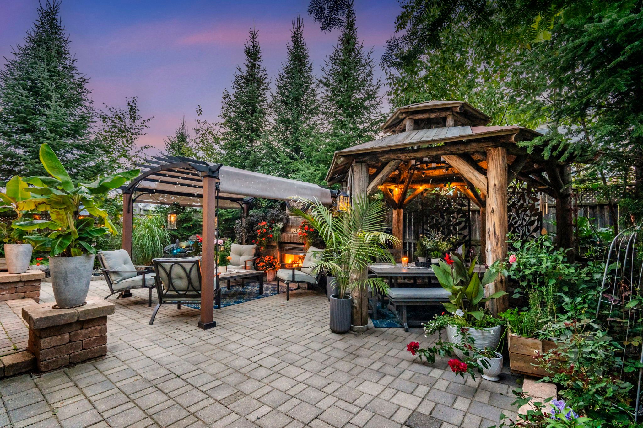 • Serene oasis-inspired backyard with stone patio, koi pond, and gazebo.