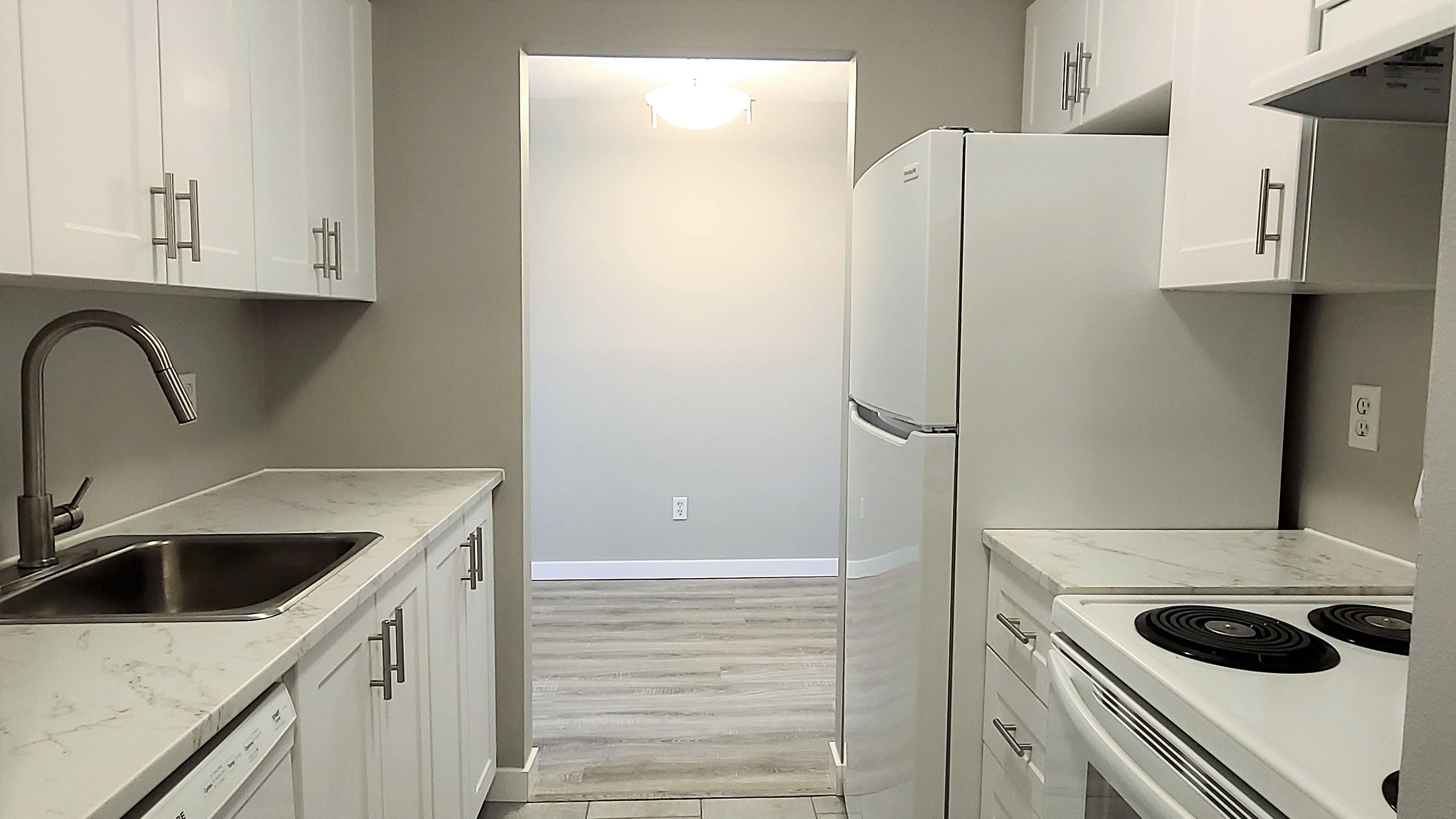 For lease! Recently professionally renovated from top to bottom! Enjoy the newest of the new features with all appliances included. Enjoy a fully renovated bathroom, kitchen, bedroom, dining area, and living room. Convenient ensuite laundry. This main-floor unit exits privately onto greenspace at the rear of the building and has the benefit of secure access to the building facing the open parking space. Enjoy full use of condo amenities including ample, open parking and an outdoor professionally maintained swimming pool during summer months! Located within walking distance of public transit, major shopping mall, groceries, schools, community center, library, and more! Water is included.