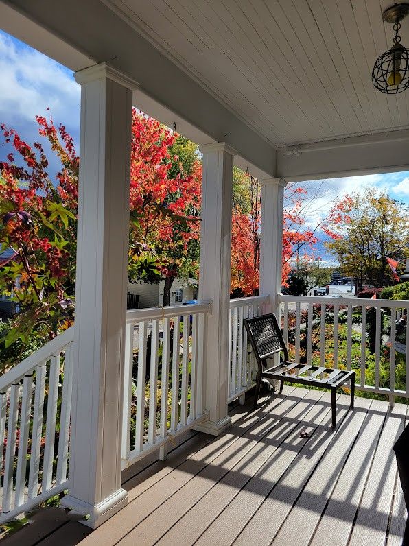 • Landscaped yard with mature trees and a welcoming porch for relaxation.