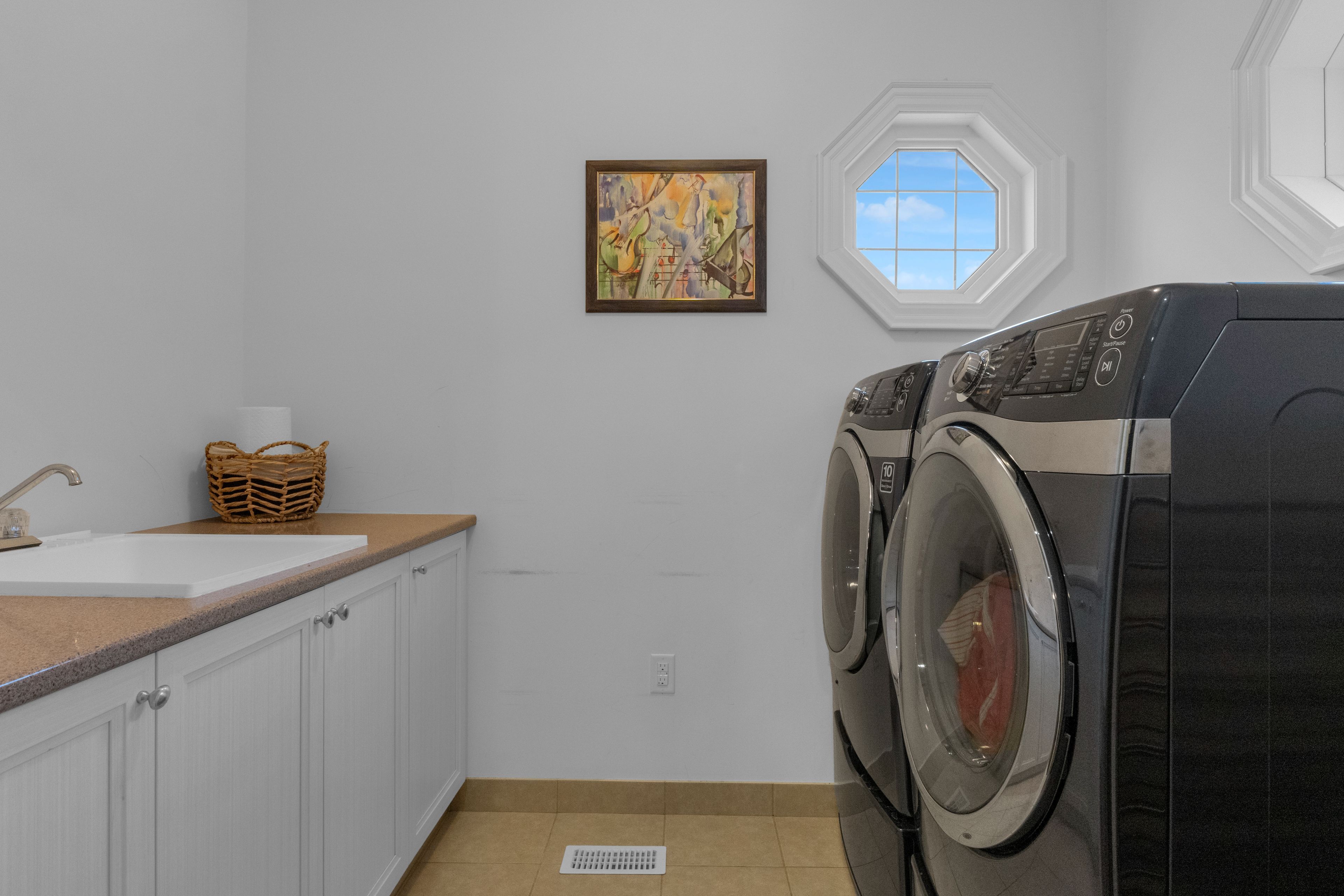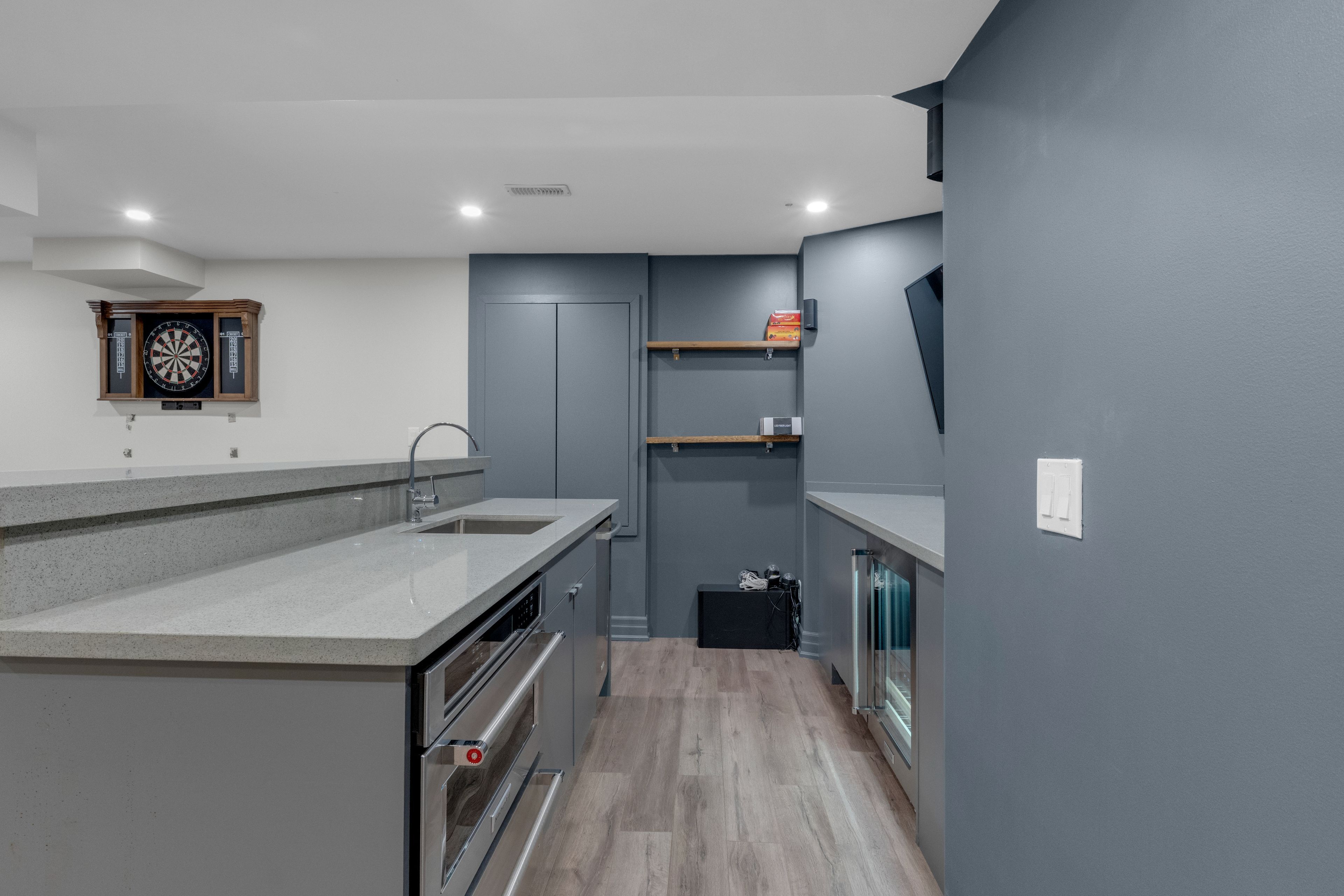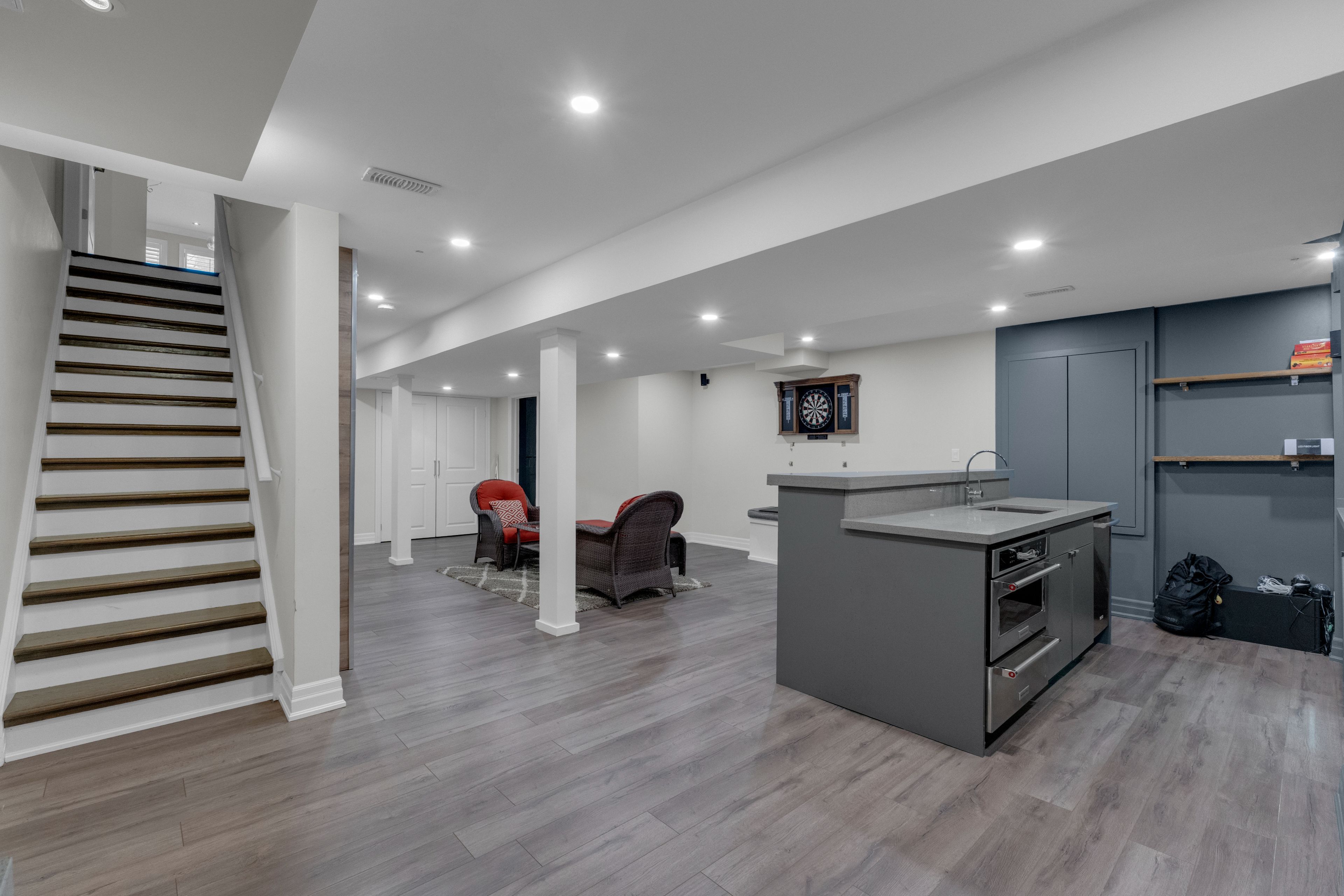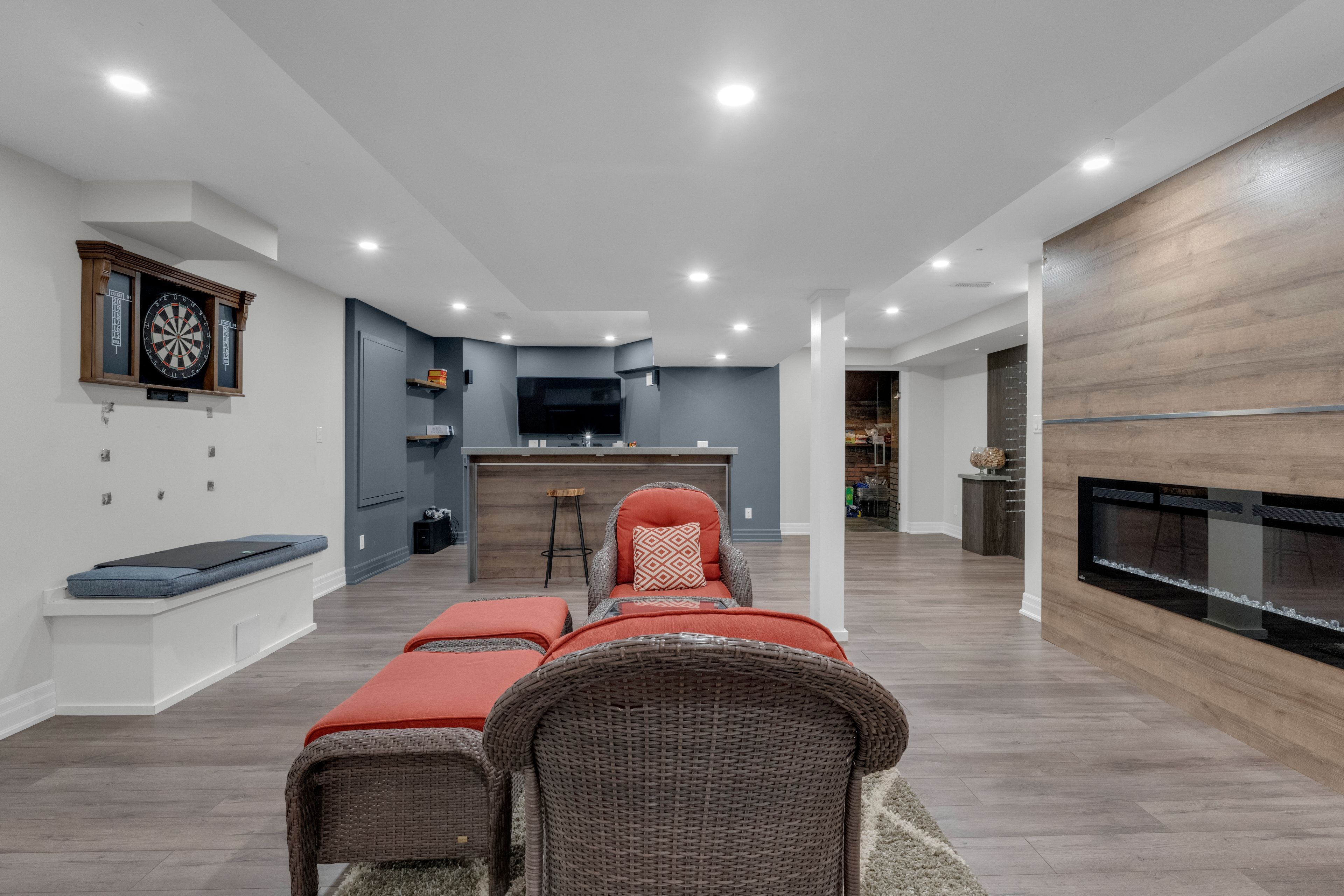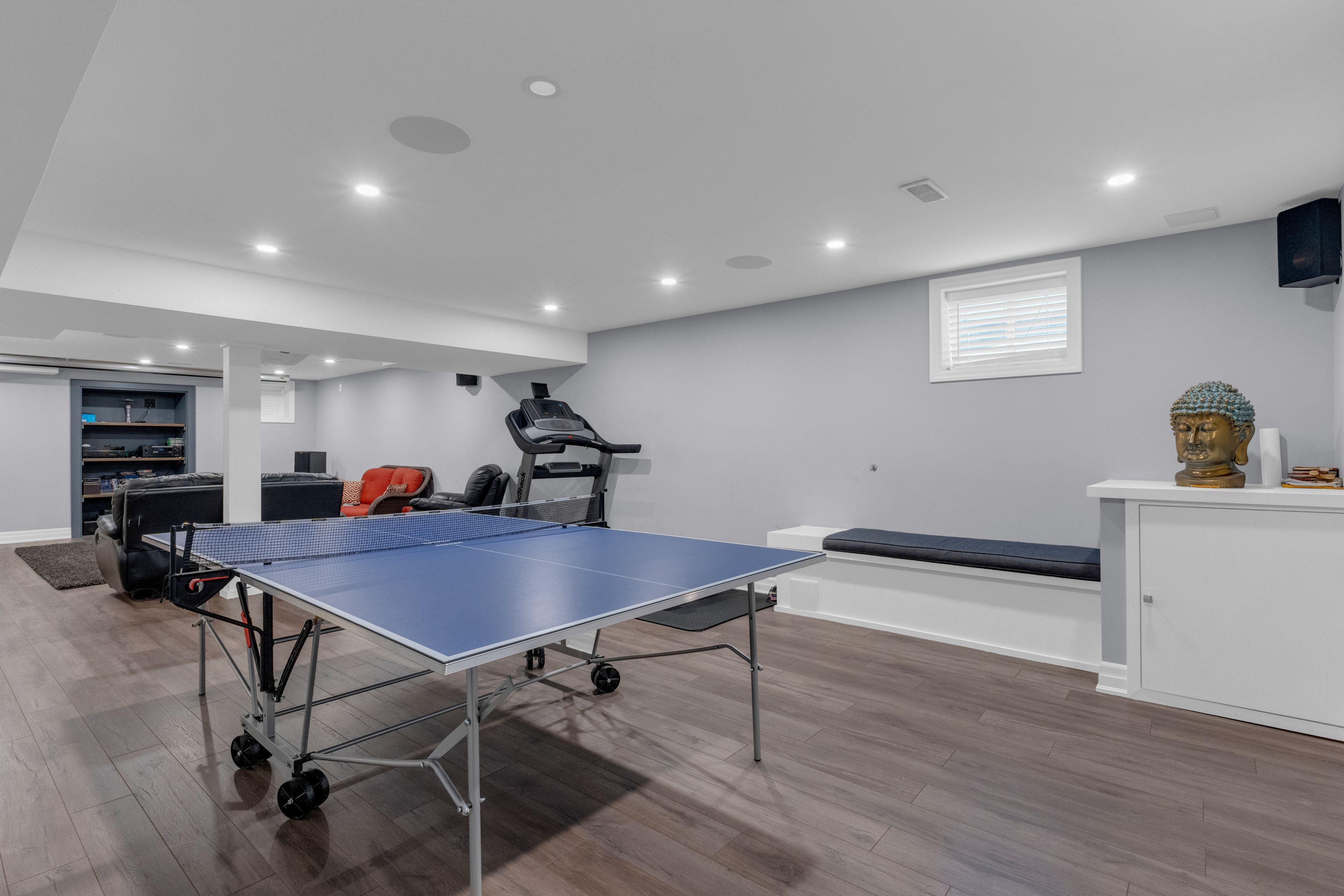 • Finished basement with a recreation area, wet bar, and built-in speakers.
