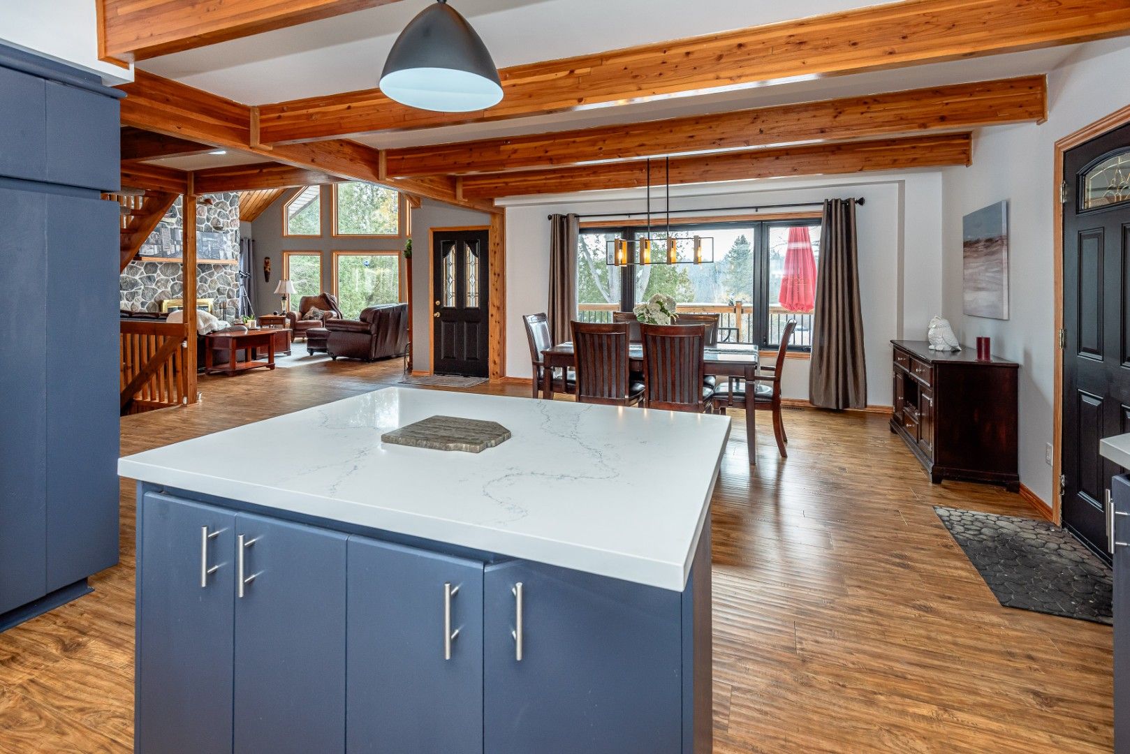 Tranquil river front oasis! Keep your boat in your own back yard on the 50ft deck with access to l. Simcoe via the pefferlaw river. Imagine the lifestyle both summer and winter with snowmobile and hiking trails including ice fishing at your doorstep! View nature through the massive windows in the great room with soaring beam ceiling over looking the river and snow trails. Open concept updated board & batten home including bathrooms! Relax in the great room by the stone fireplace relishing the calming view w/mature trees, deck and patio. Updated kitchen has brand new quartz counter and backsplash, center island and plenty of cupboards. Open dining area for any size family, large picture window, walk-out to 2 tier deck and river view. Easy staircase leads to dry boathouse and huge dock. This home has upgraded flooring on main level w/new broadloom throughout upper level which overlooks the great room! Spacious primary bedroom has w/out to juliette balcony, large mirror closet and sliding barn doors for extended privacy. Lets include the den/study area on main floor and the lower level family room, not to mention games and exercise room! (or 4th bedroom) overall living space 3000+ sq. Ft. The whole exterior has been freshly painted, including deck floors and boathouse. Skylight and shingles & eaves trough replaced 2024. Decor switches/outlets throughout, and there's more!! All this close enough to the city. Easy commute less 35 minutes to 404. All amenities, shopping, school and parks with library plus winter skating etc. Close by. Don't dream, this can be yours!