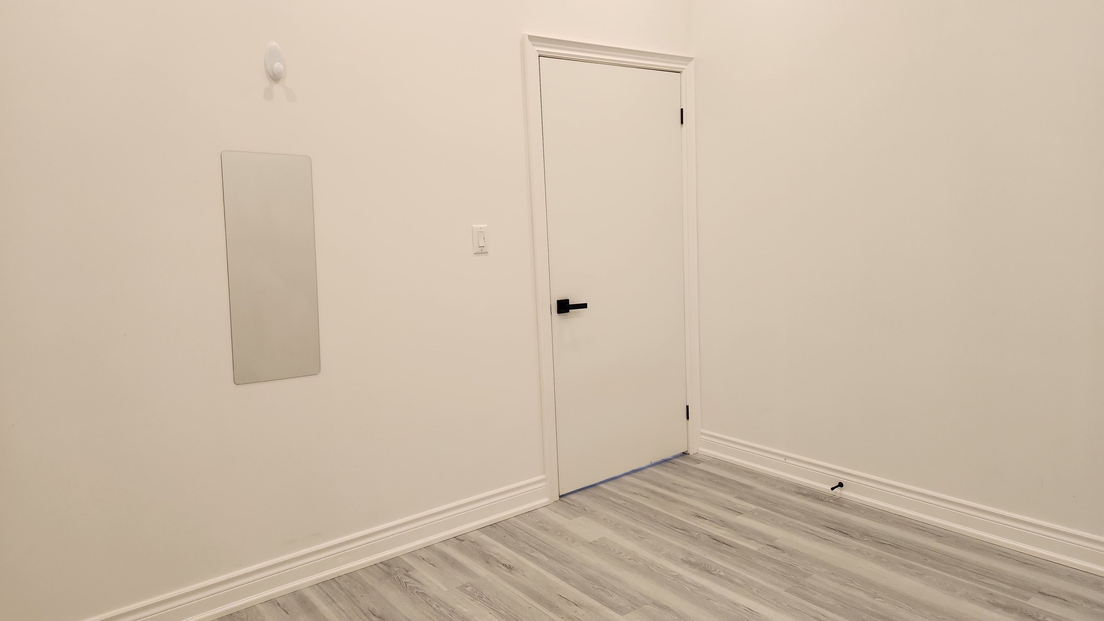 Beautifully renovated with laminate flooring and pot lights. Room in the front has large windows. Two bedrooms. Two washrooms. Washer & dryer hookups. Free parking in the rear. Must be seen. Tenant pays gas & hydro. Perfect for live/work arrangement.