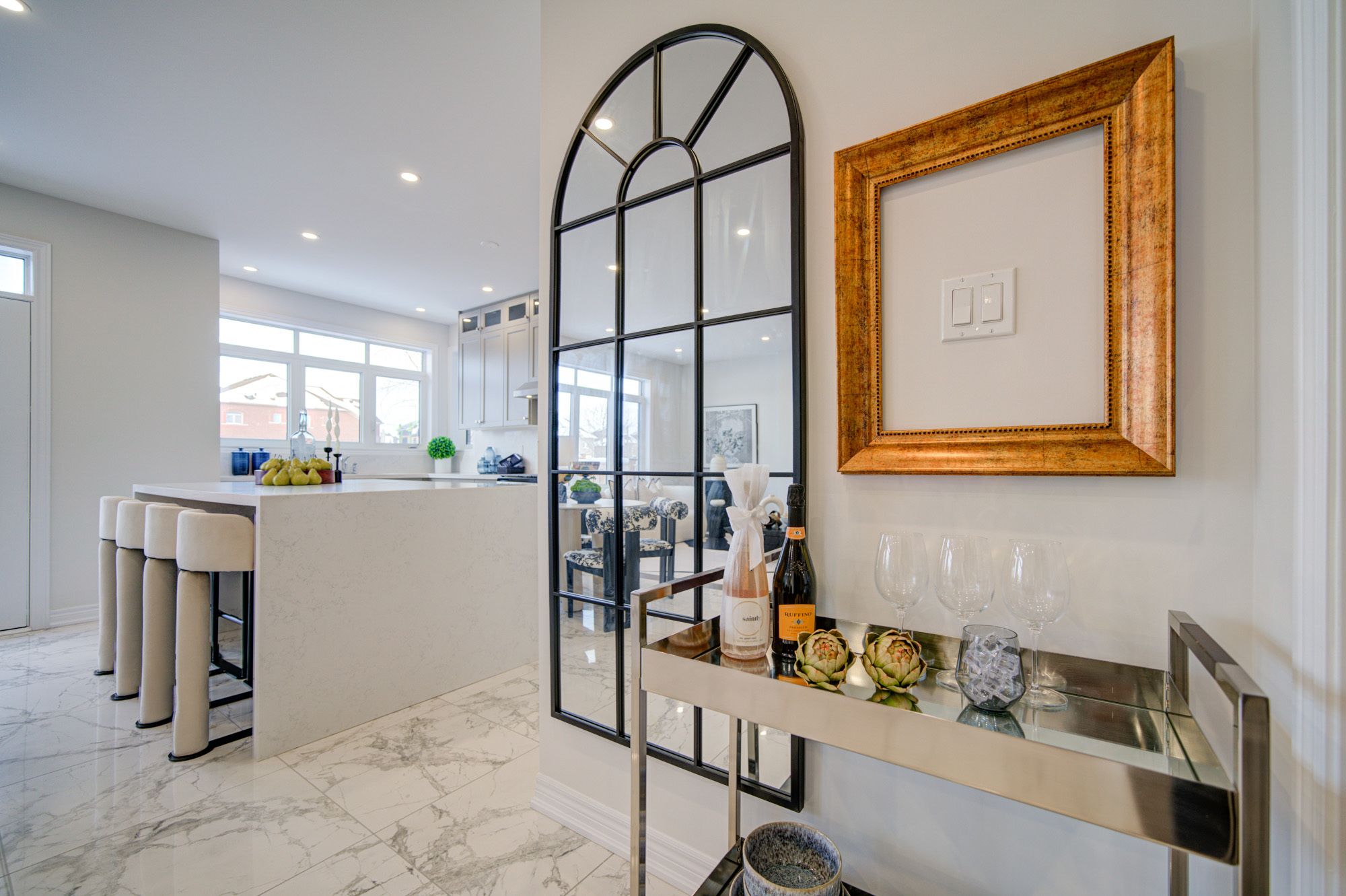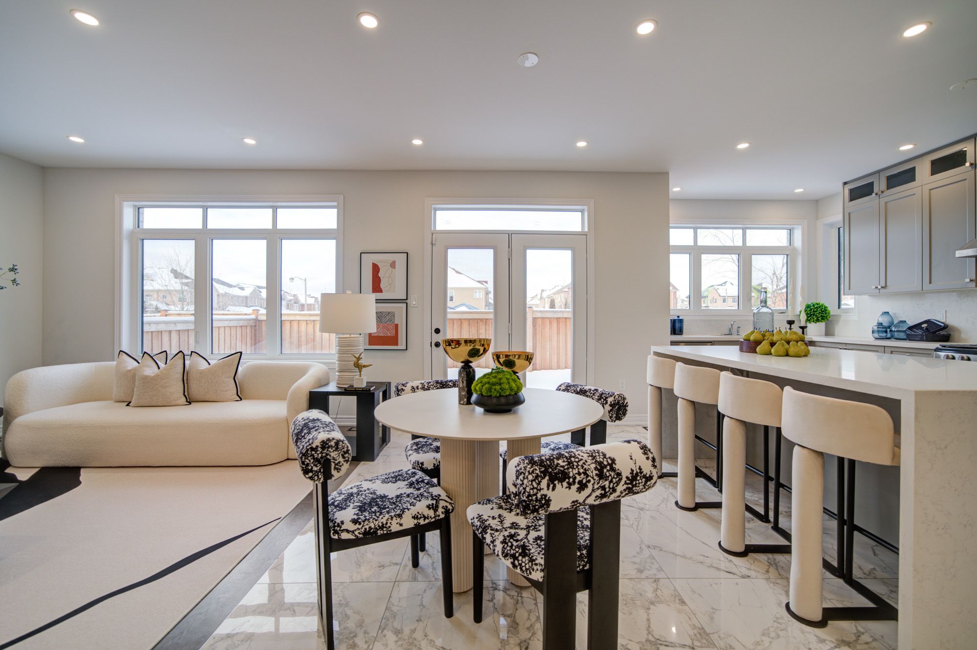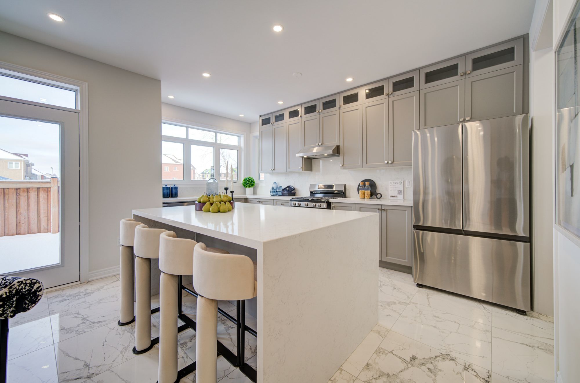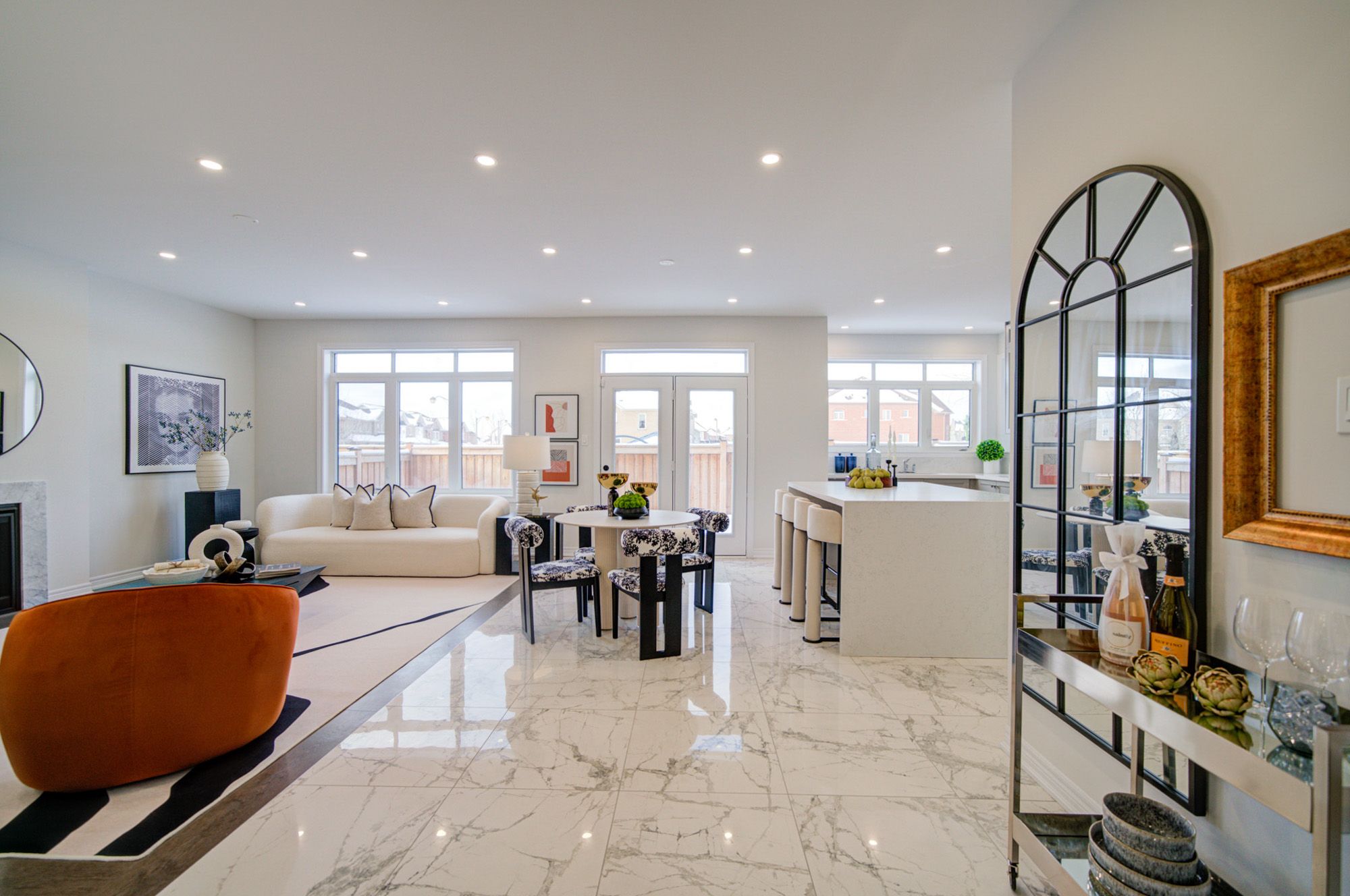 • Bright open-concept layout with modern kitchen and large stone island.