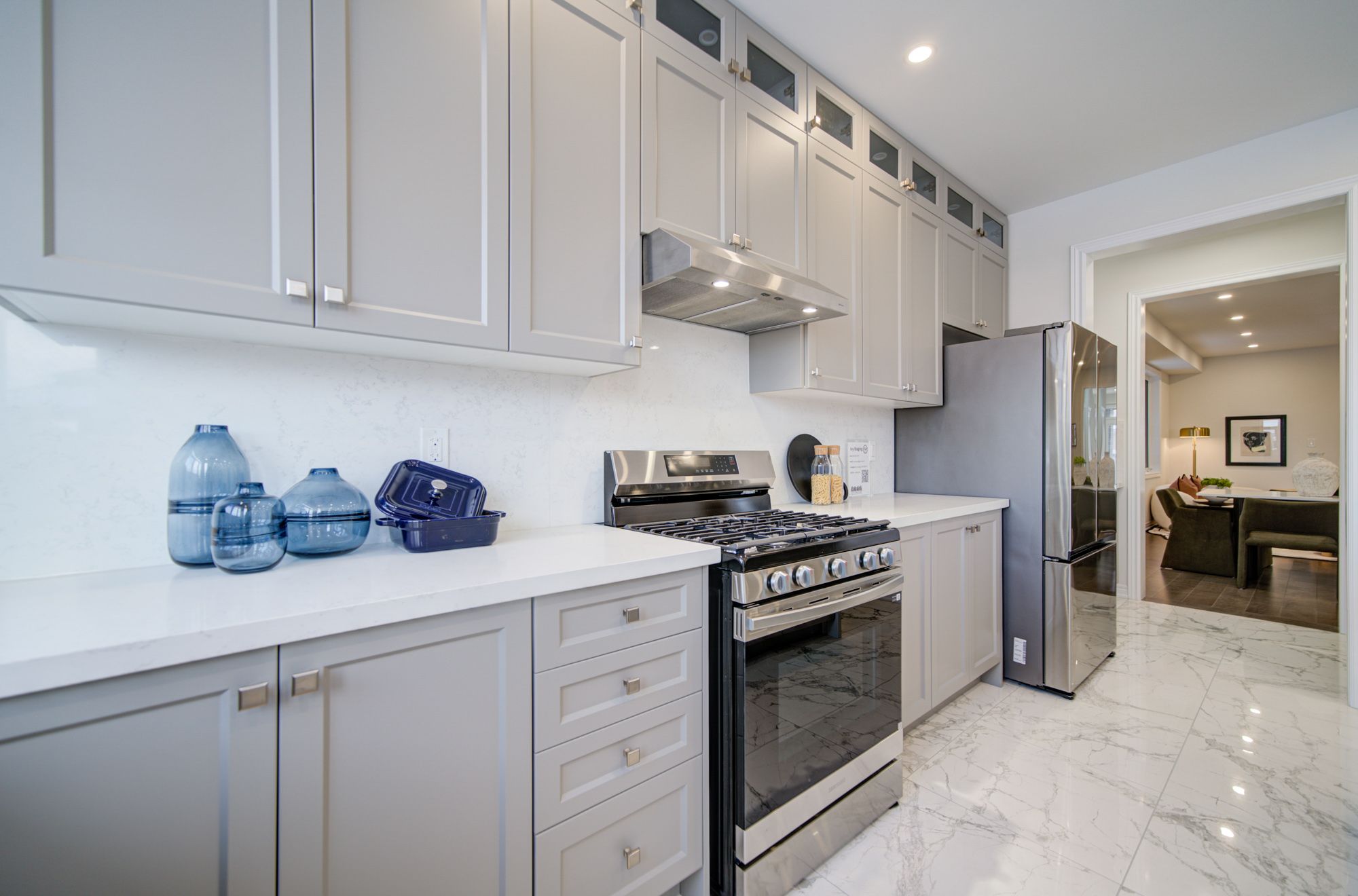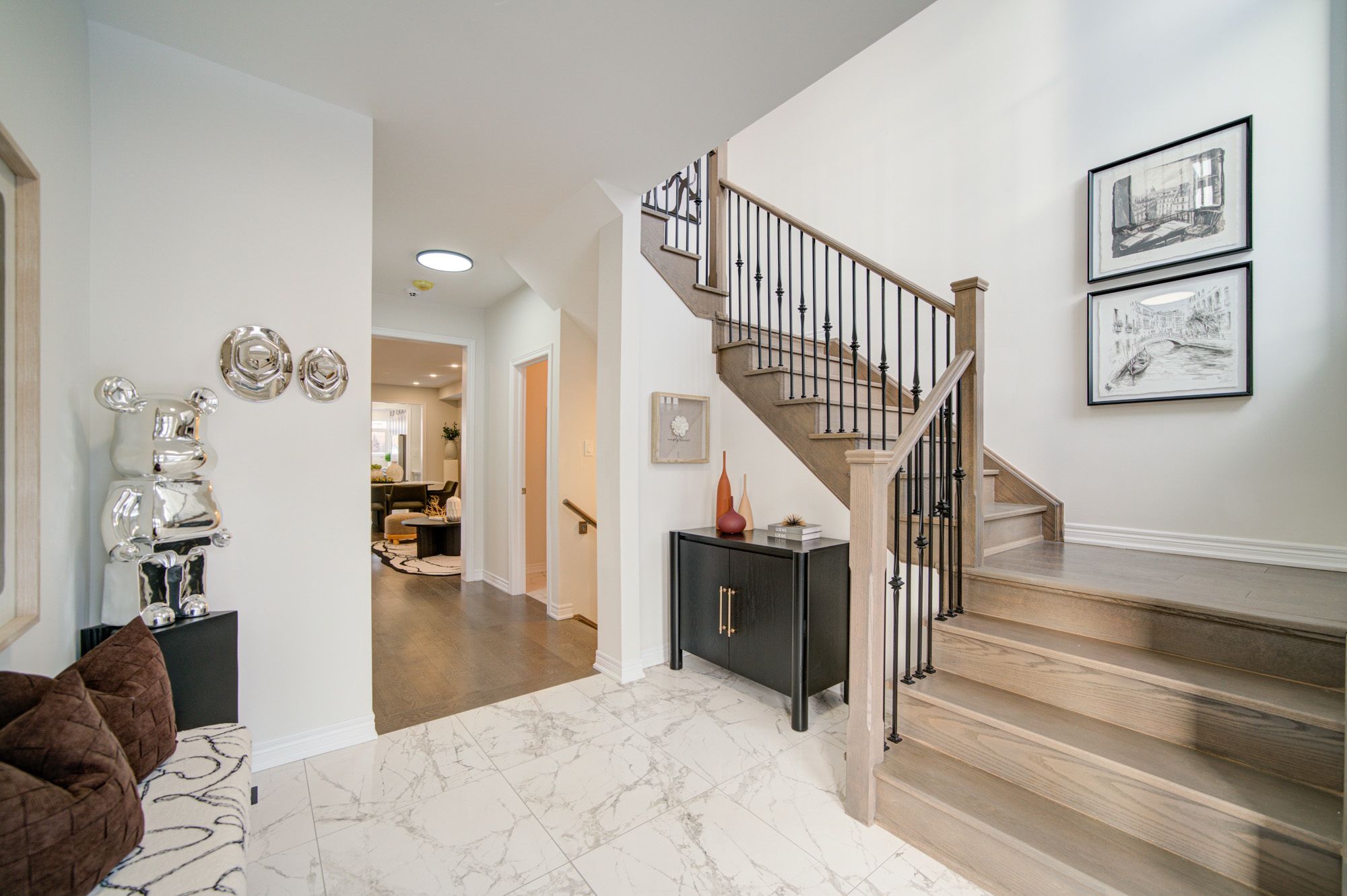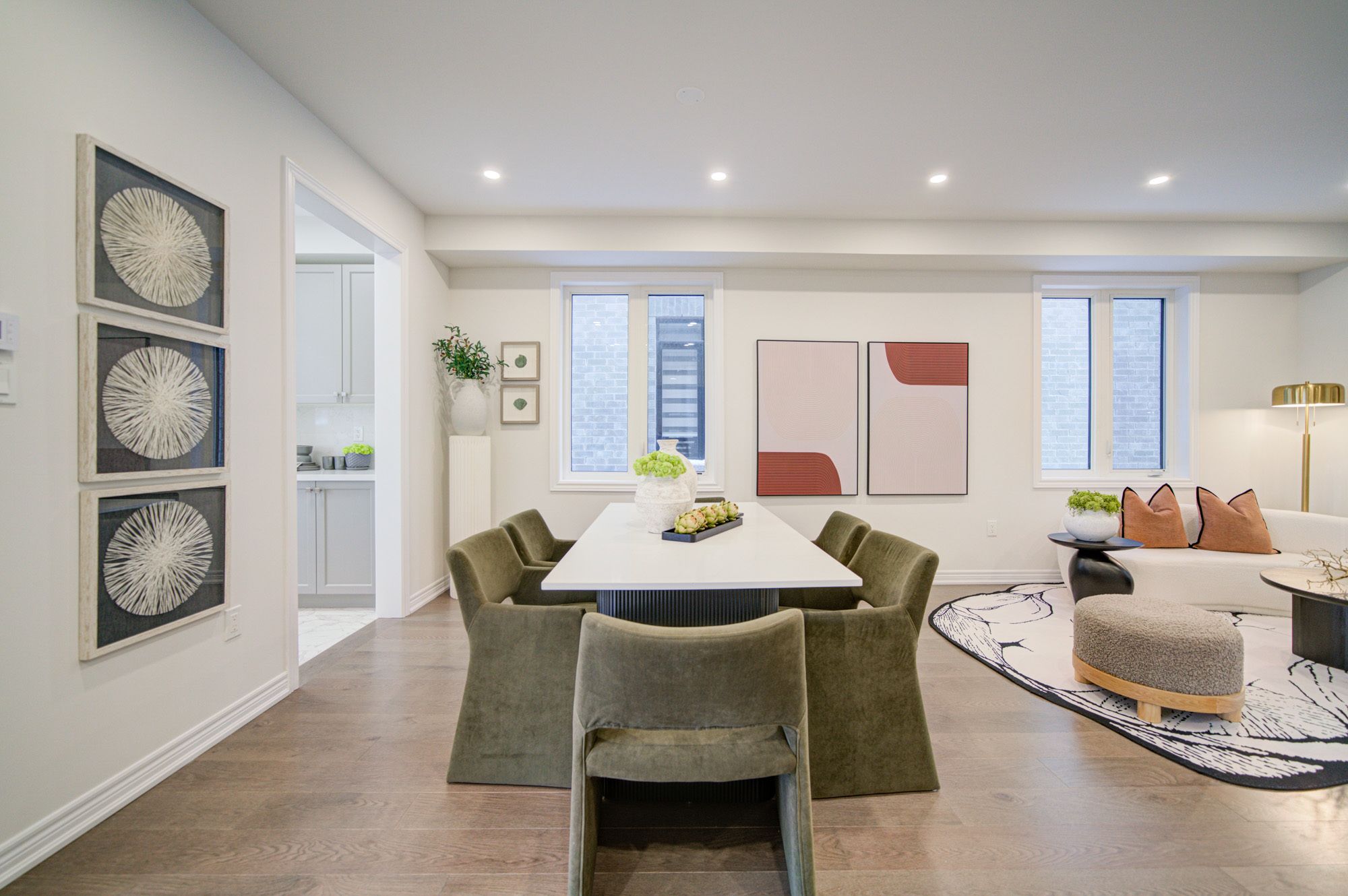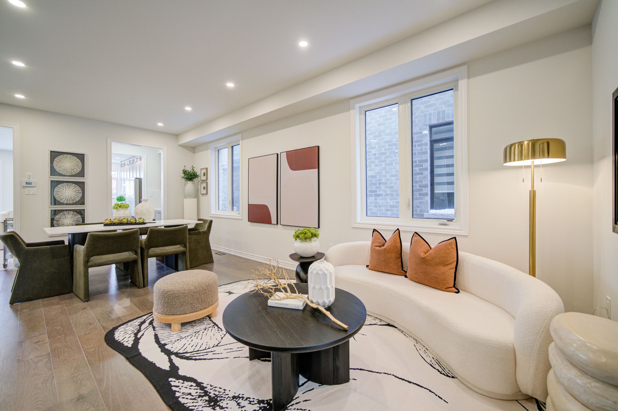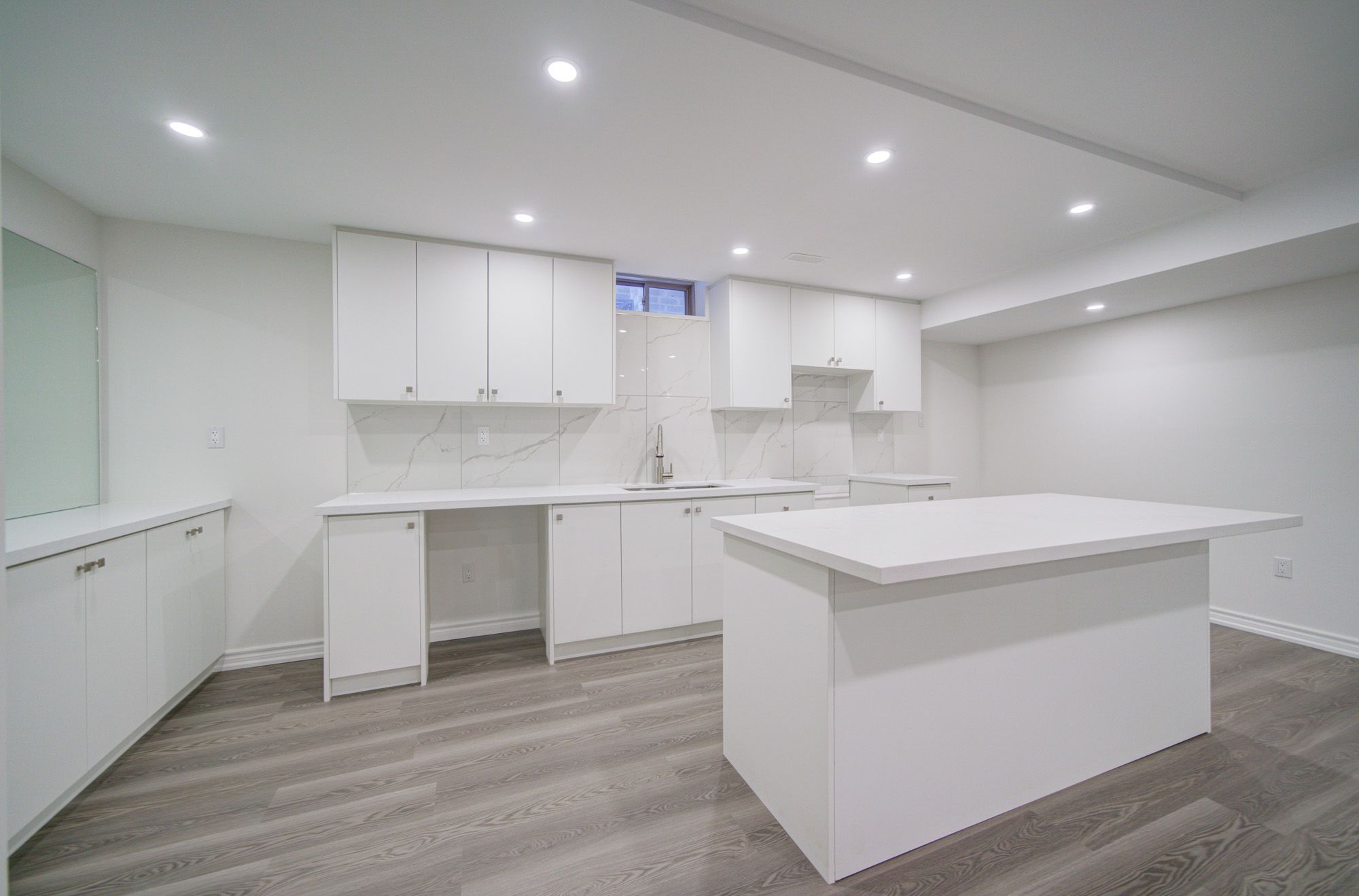 • Bright open-concept layout with modern kitchen and large stone island.
