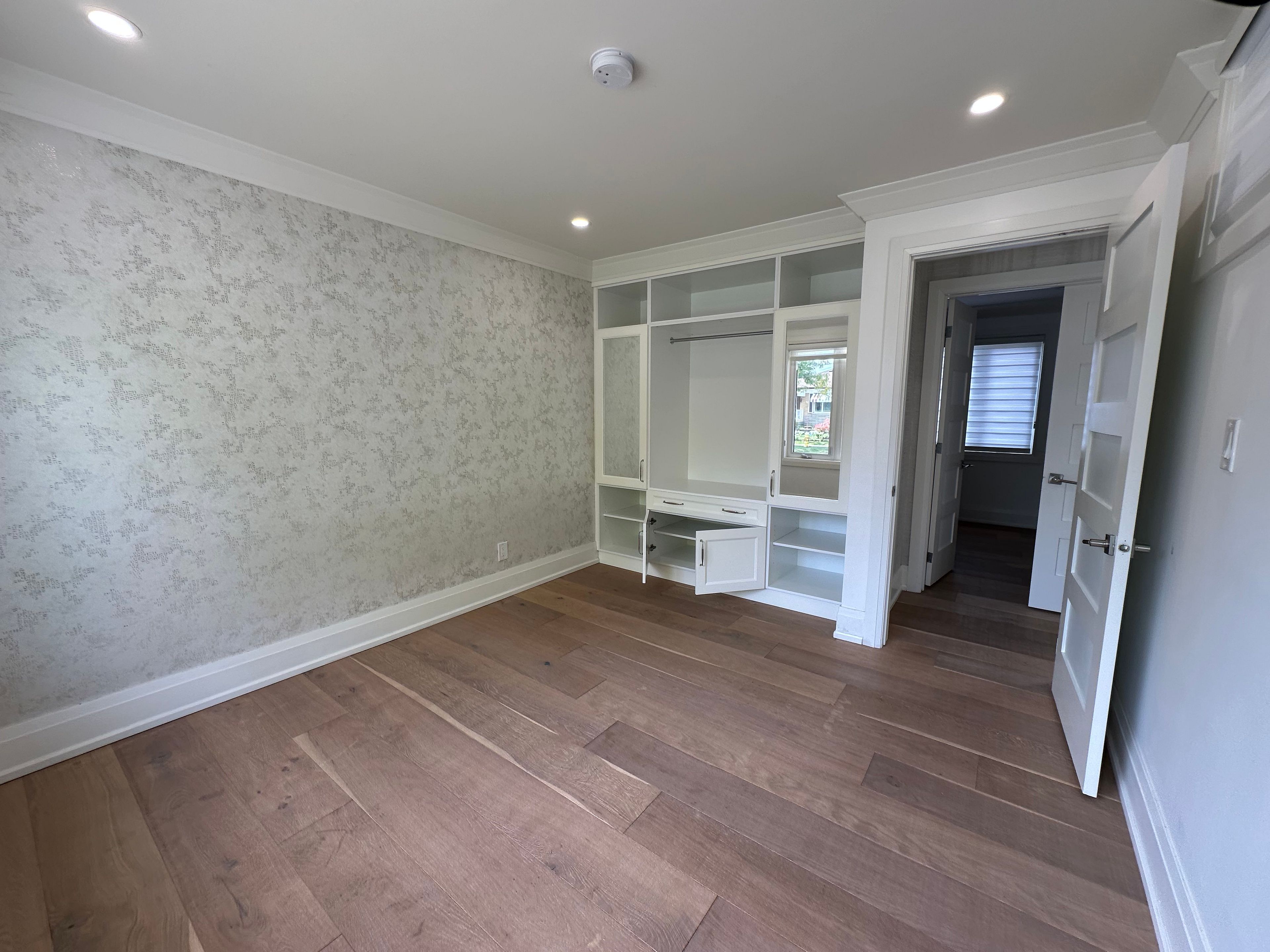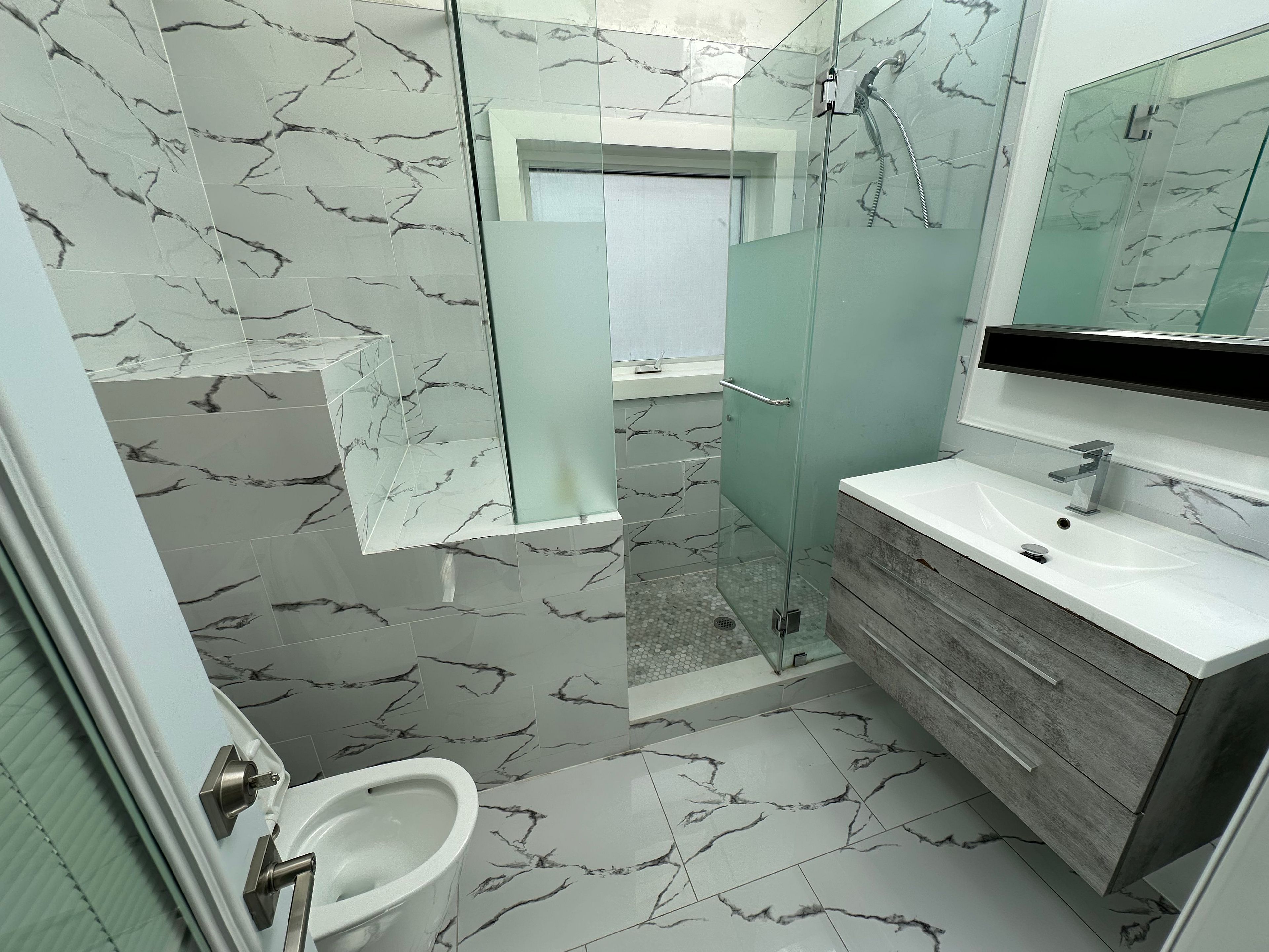 • Modern kitchen features stainless steel appliances and quartz countertops.