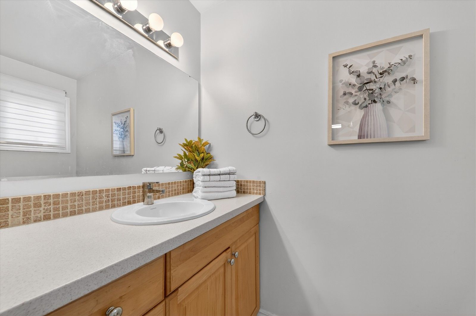 • Stylish kitchen with new cabinets and stainless steel appliances.