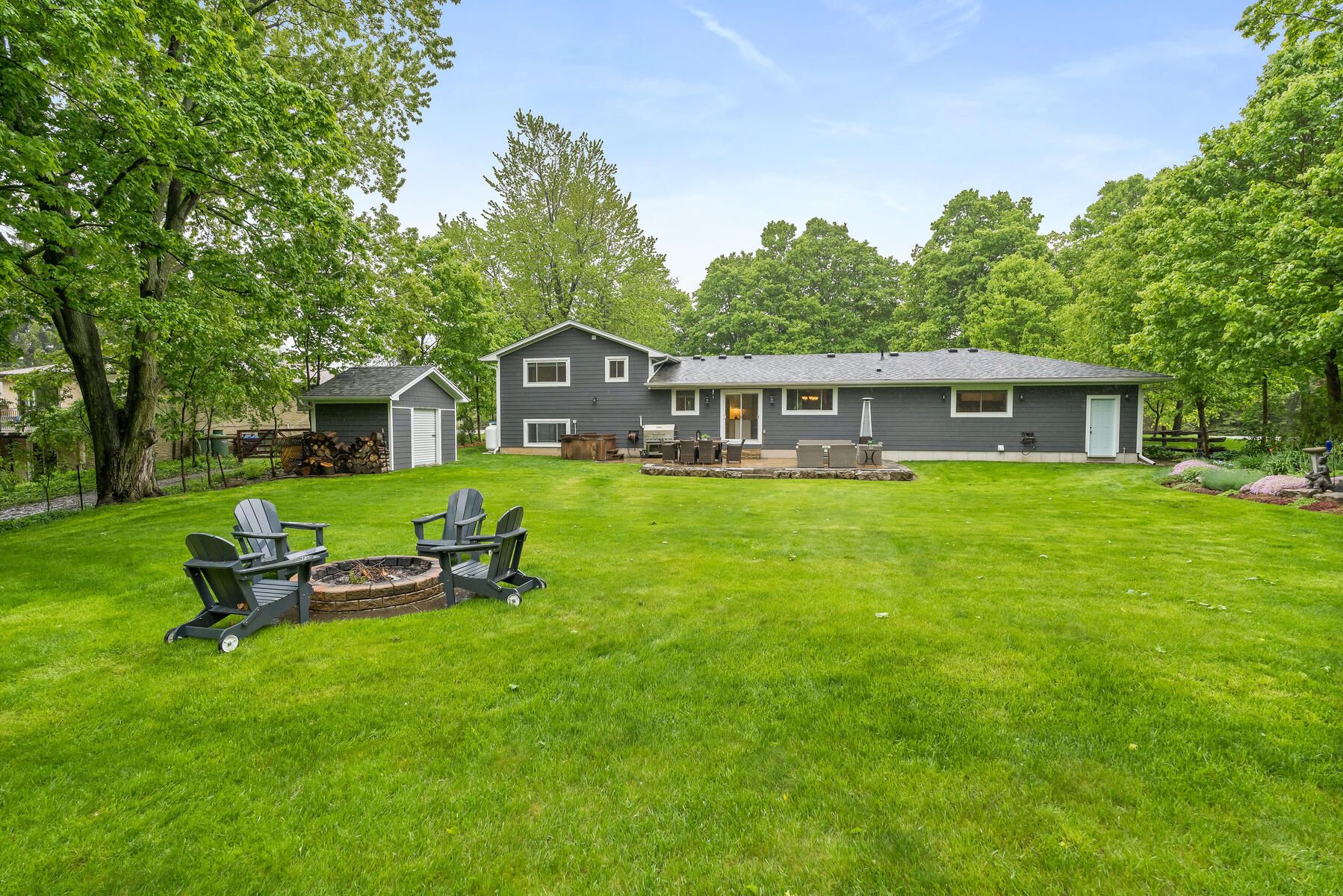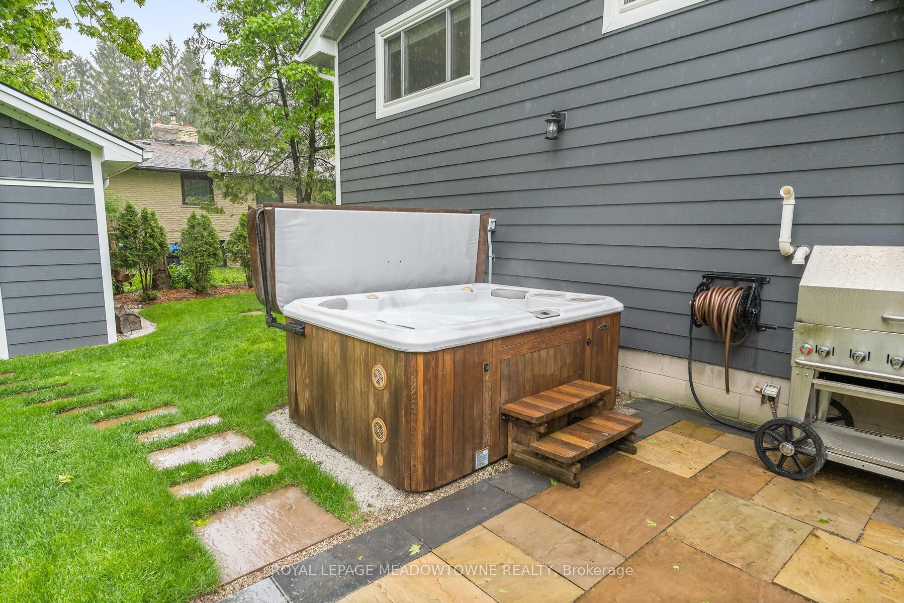 • Backyard with a deck, hot tub, and a useful storage shed.