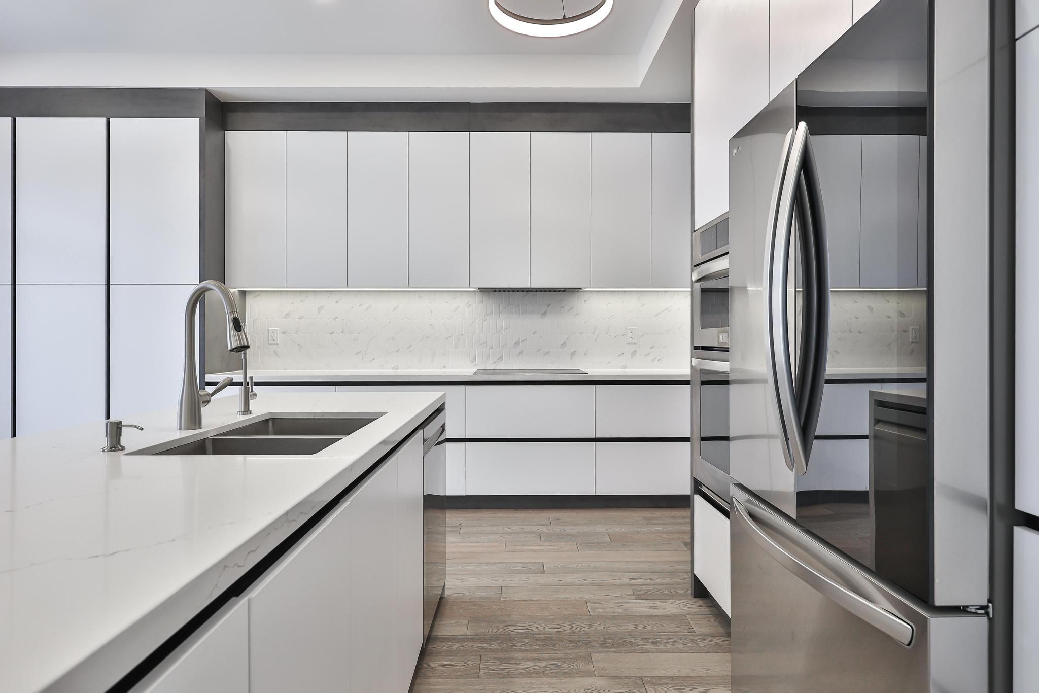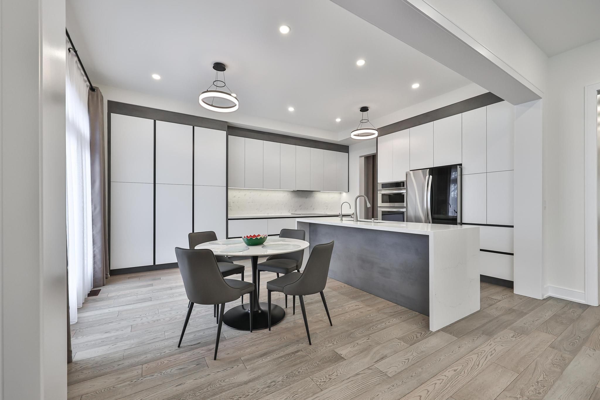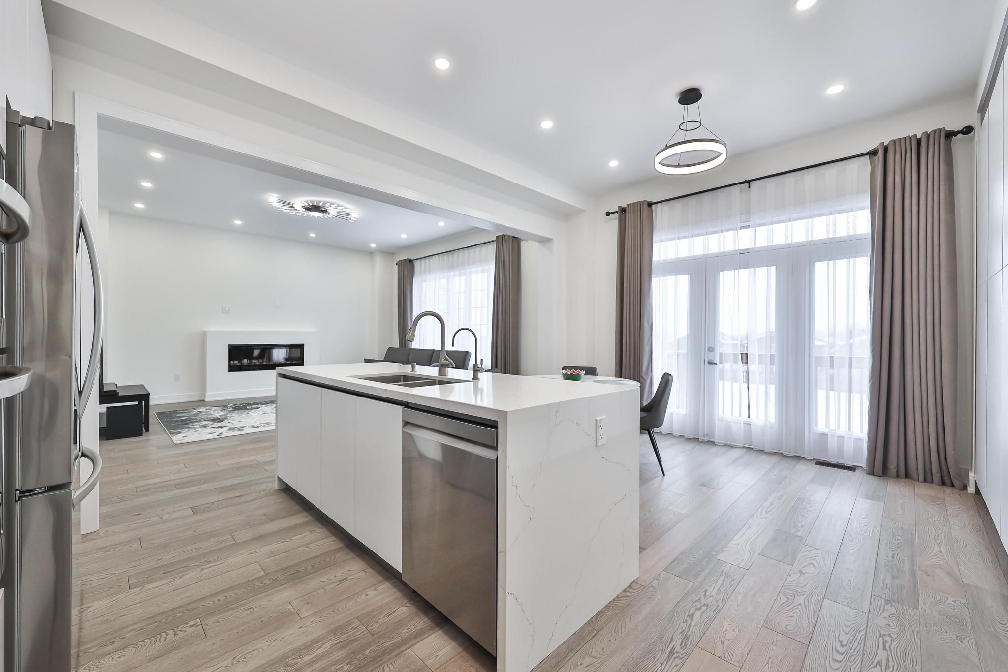 • Open-concept kitchen features a large quartz waterfall island and ample storage.
