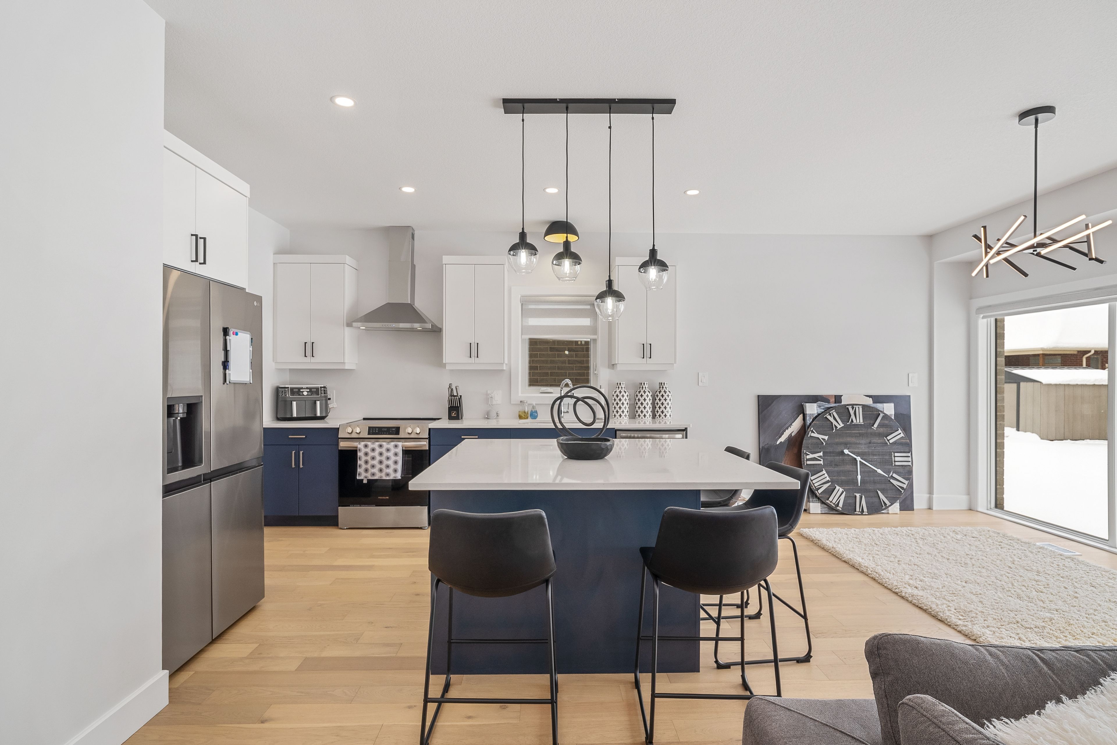 • Kitchen features custom cabinetry, quartz countertops, and breakfast bar.