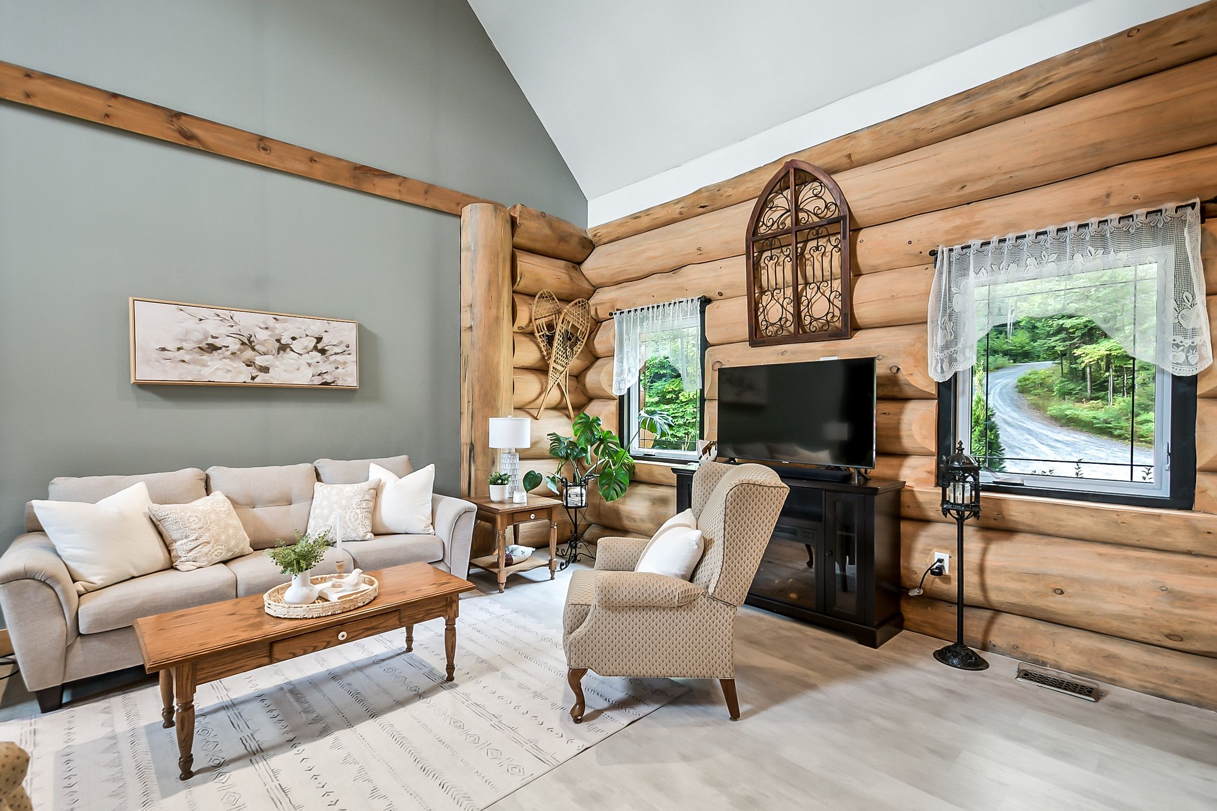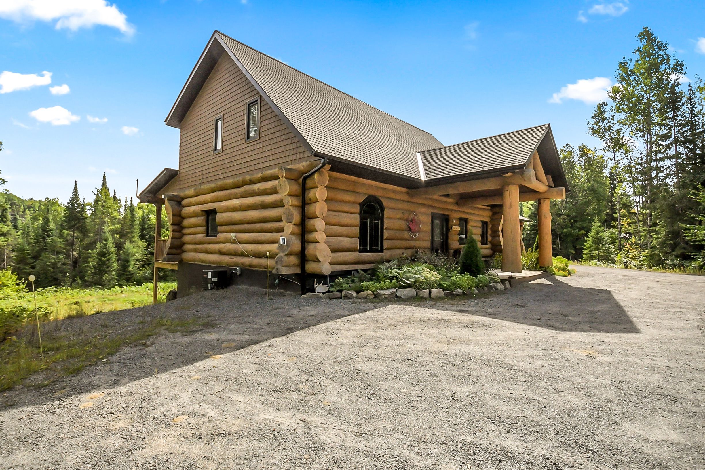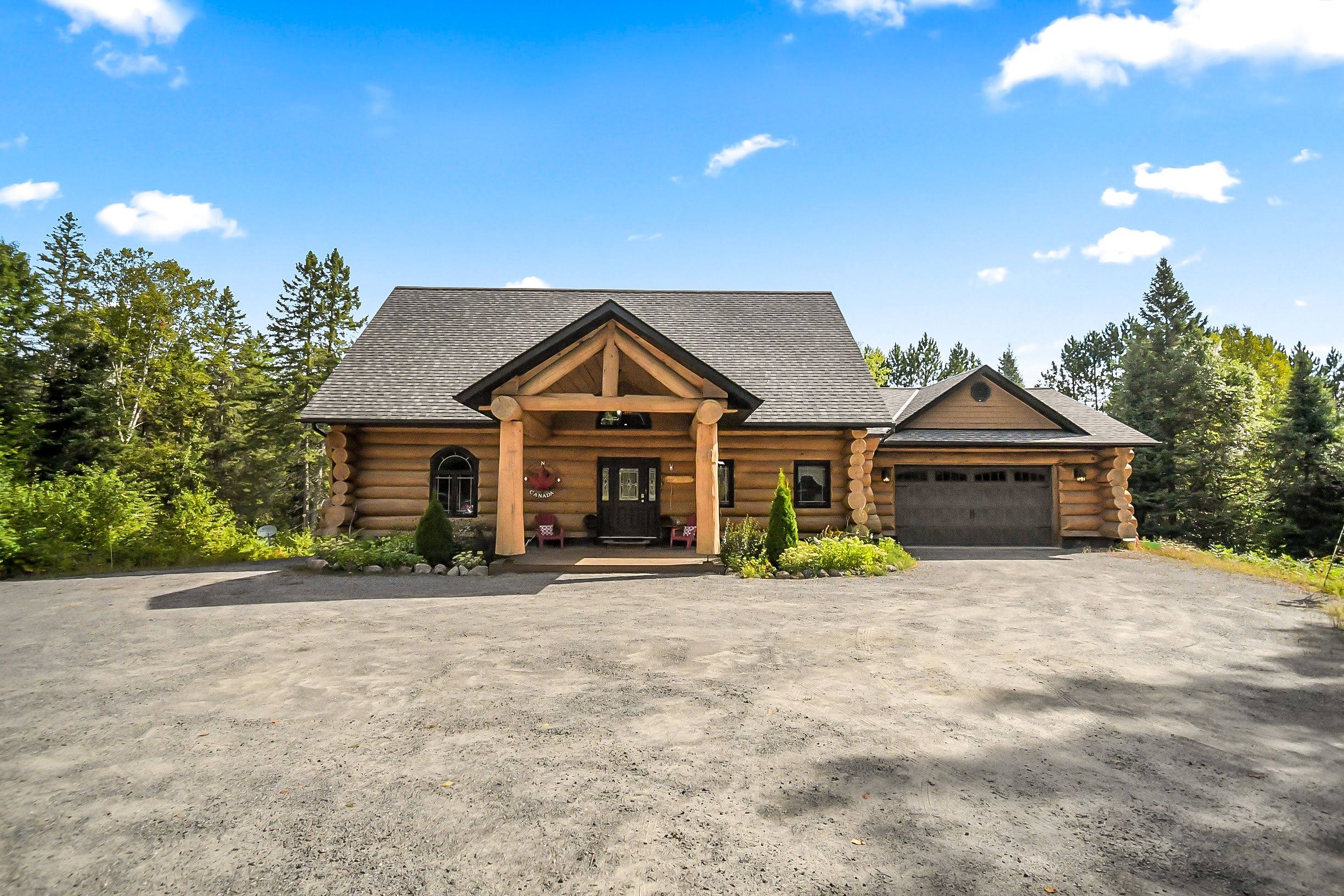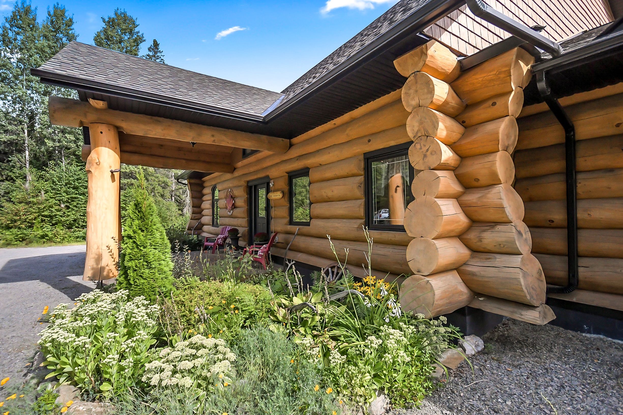 • Custom-built log home set on a peaceful 2.5-acre property.