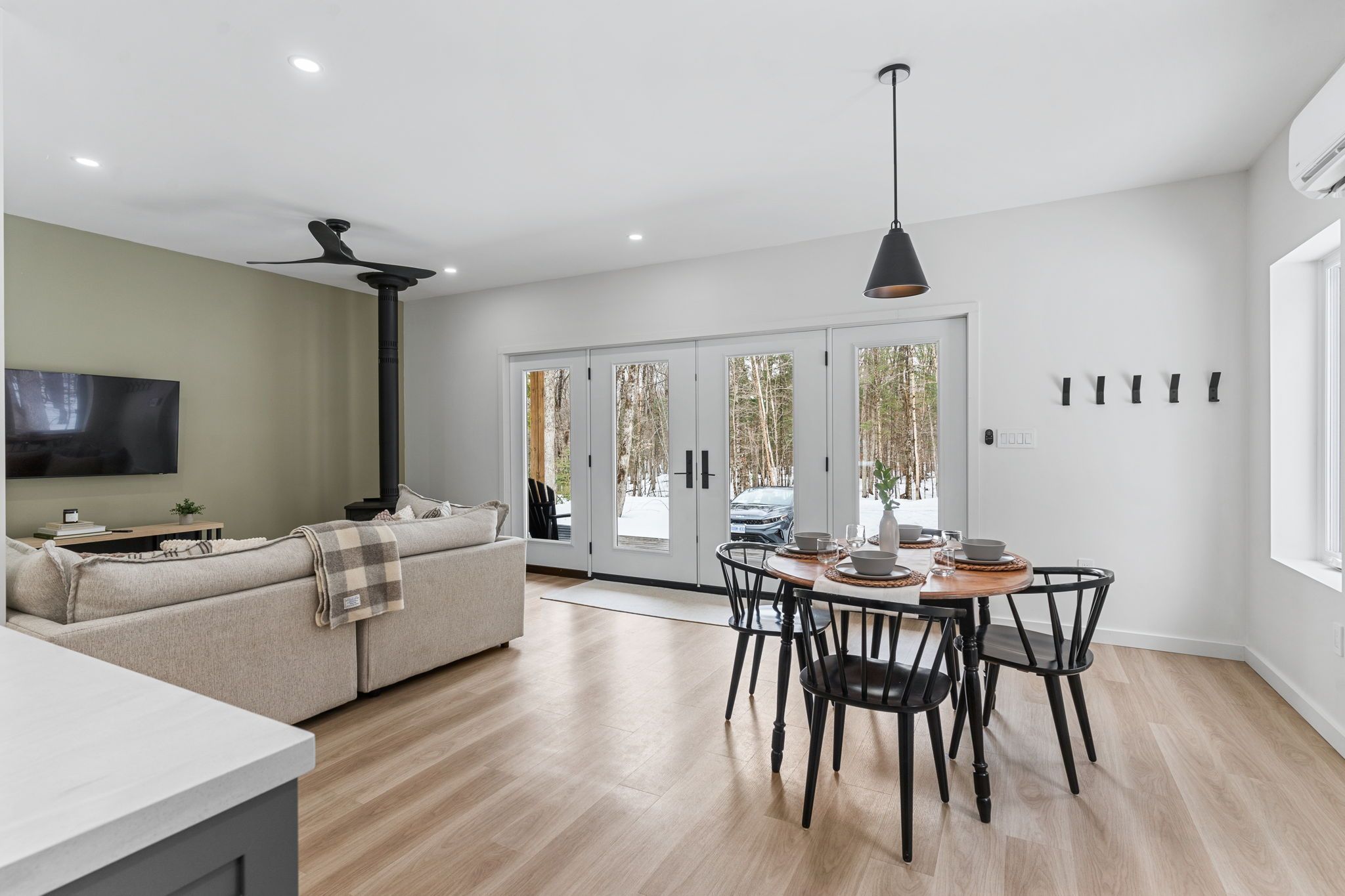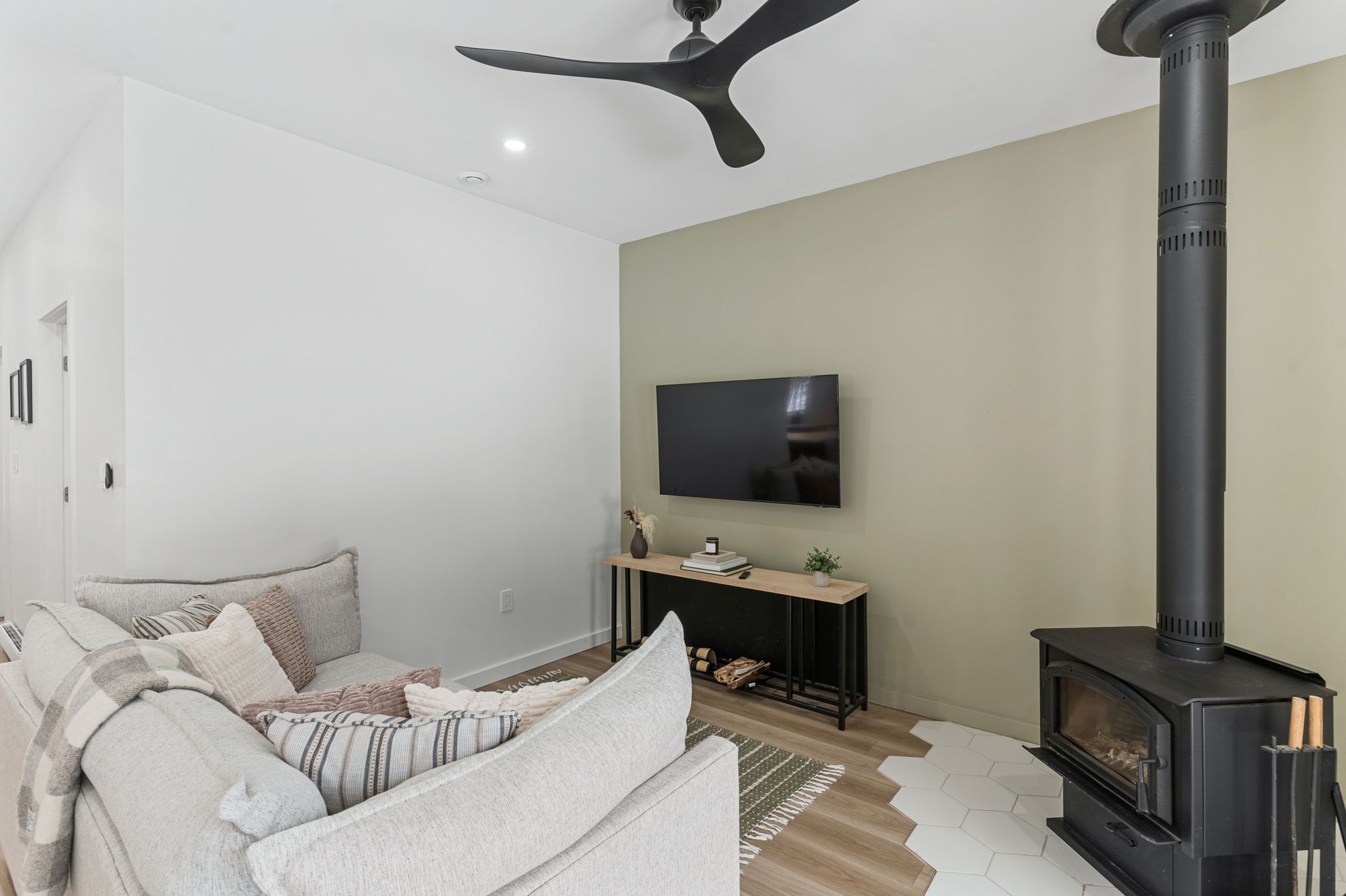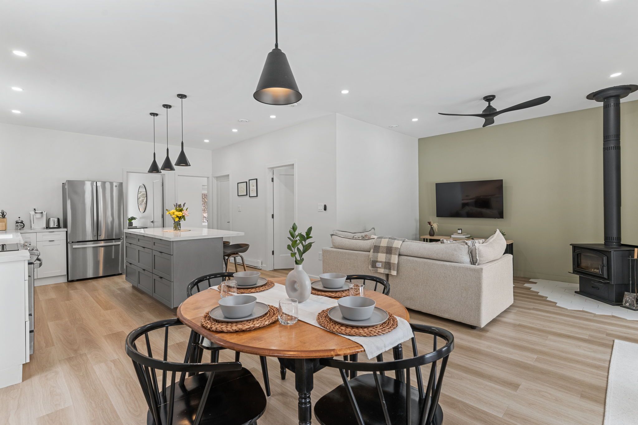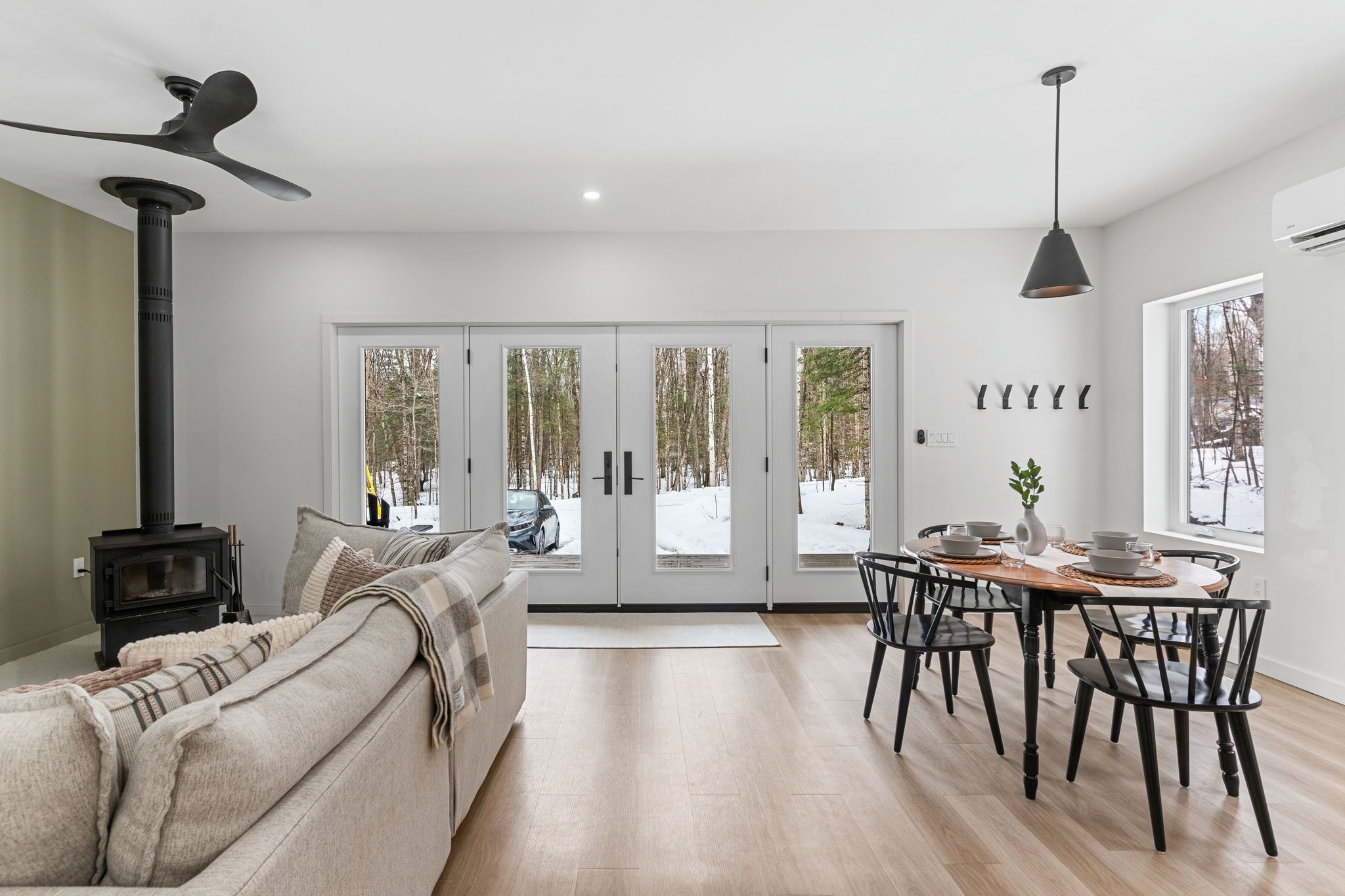 • Bright open-concept living space with a cozy woodstove for winter warmth.