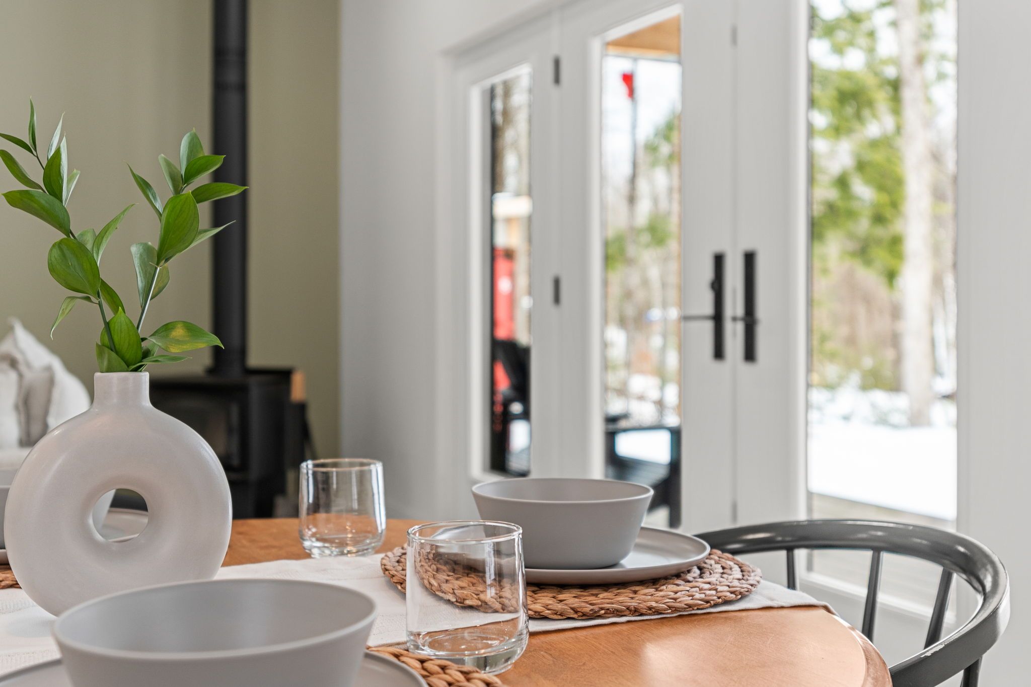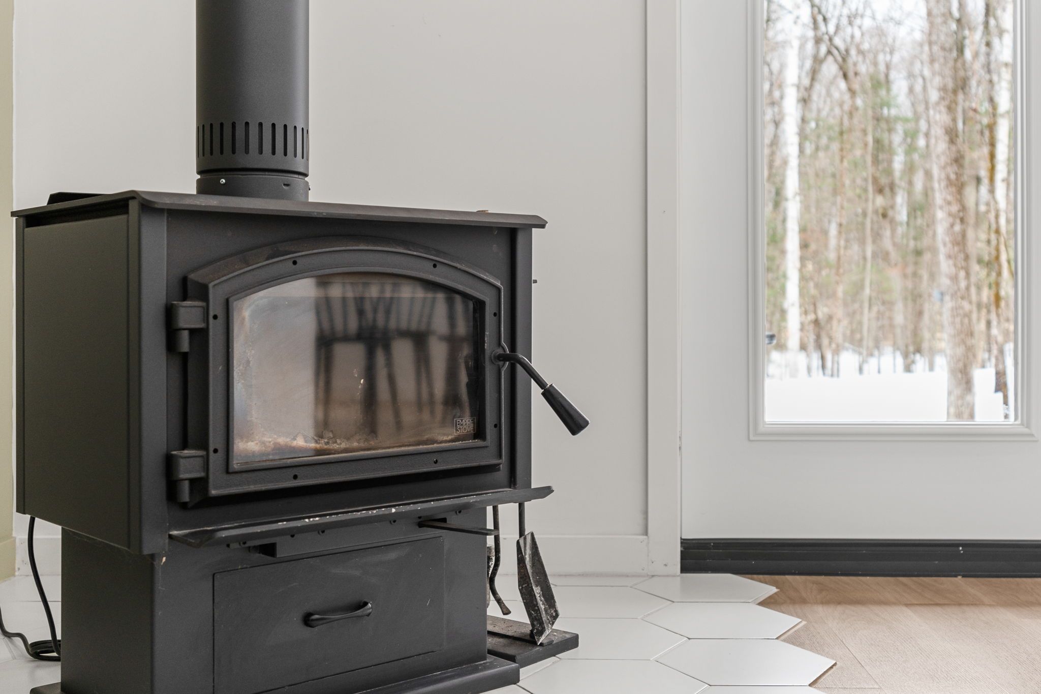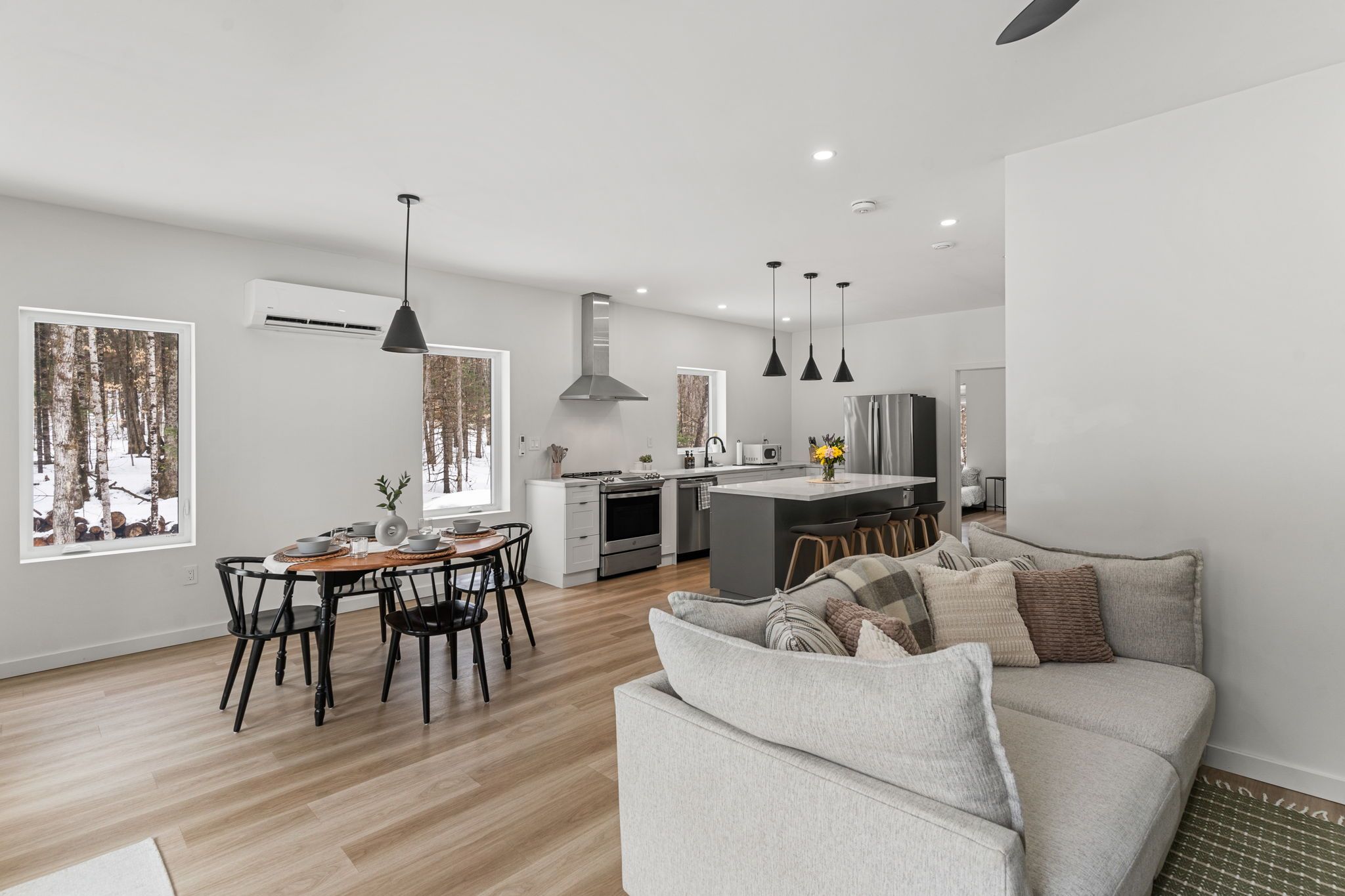 • Bright open-concept living space with a cozy woodstove for winter warmth.