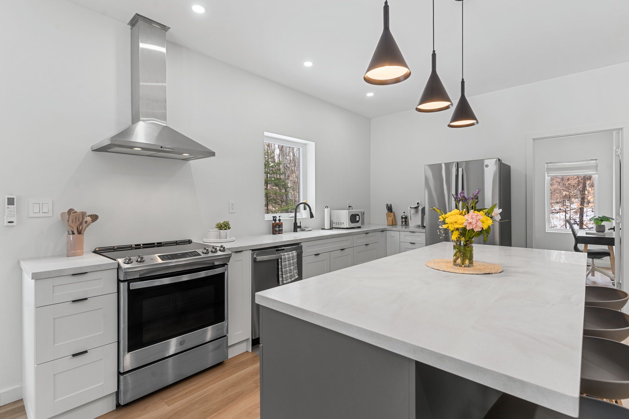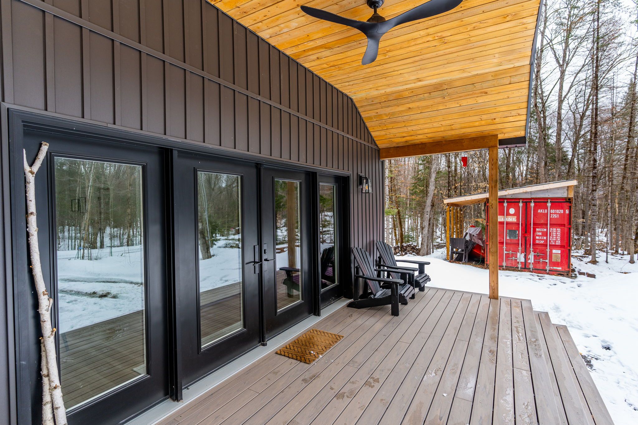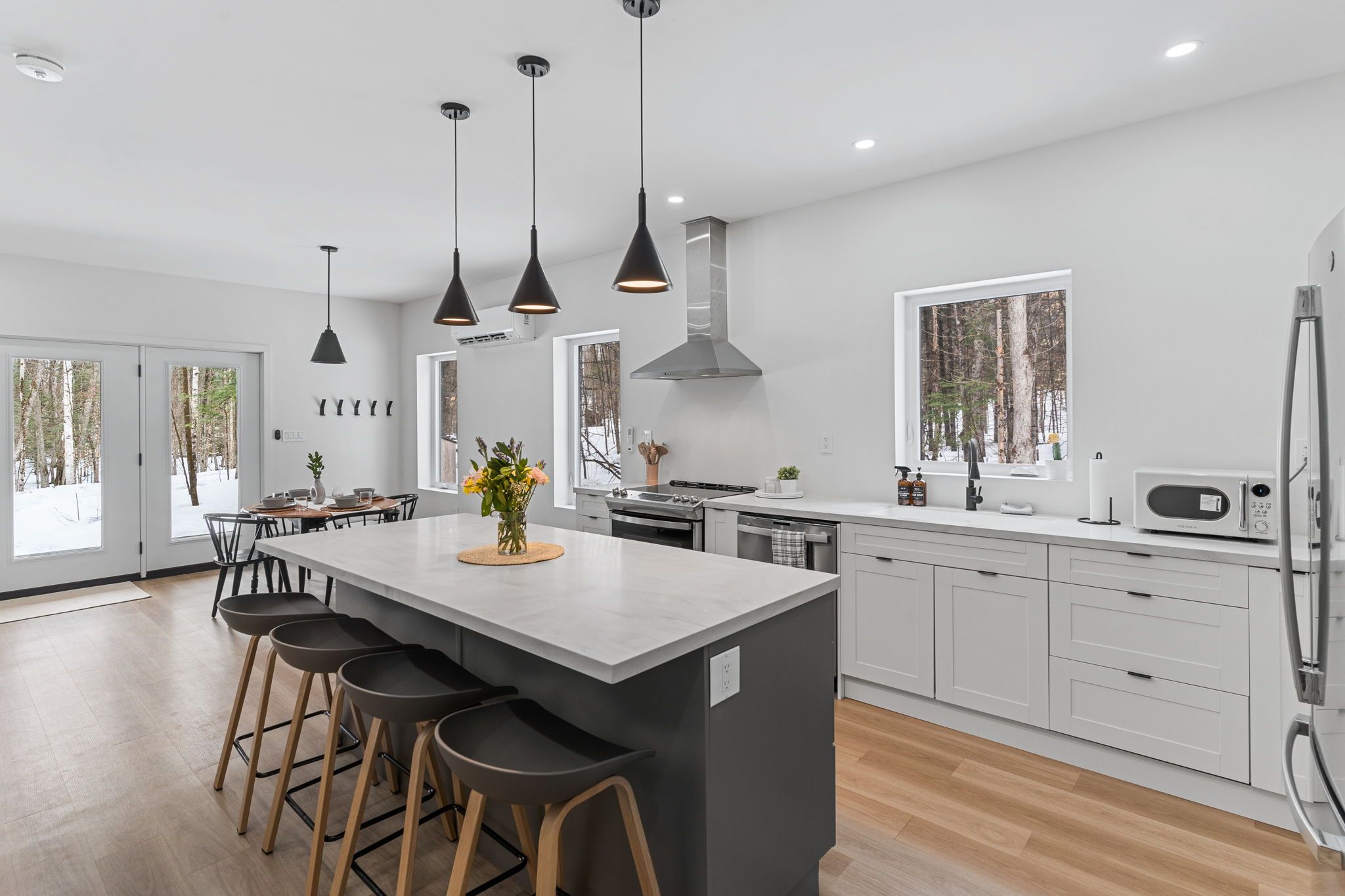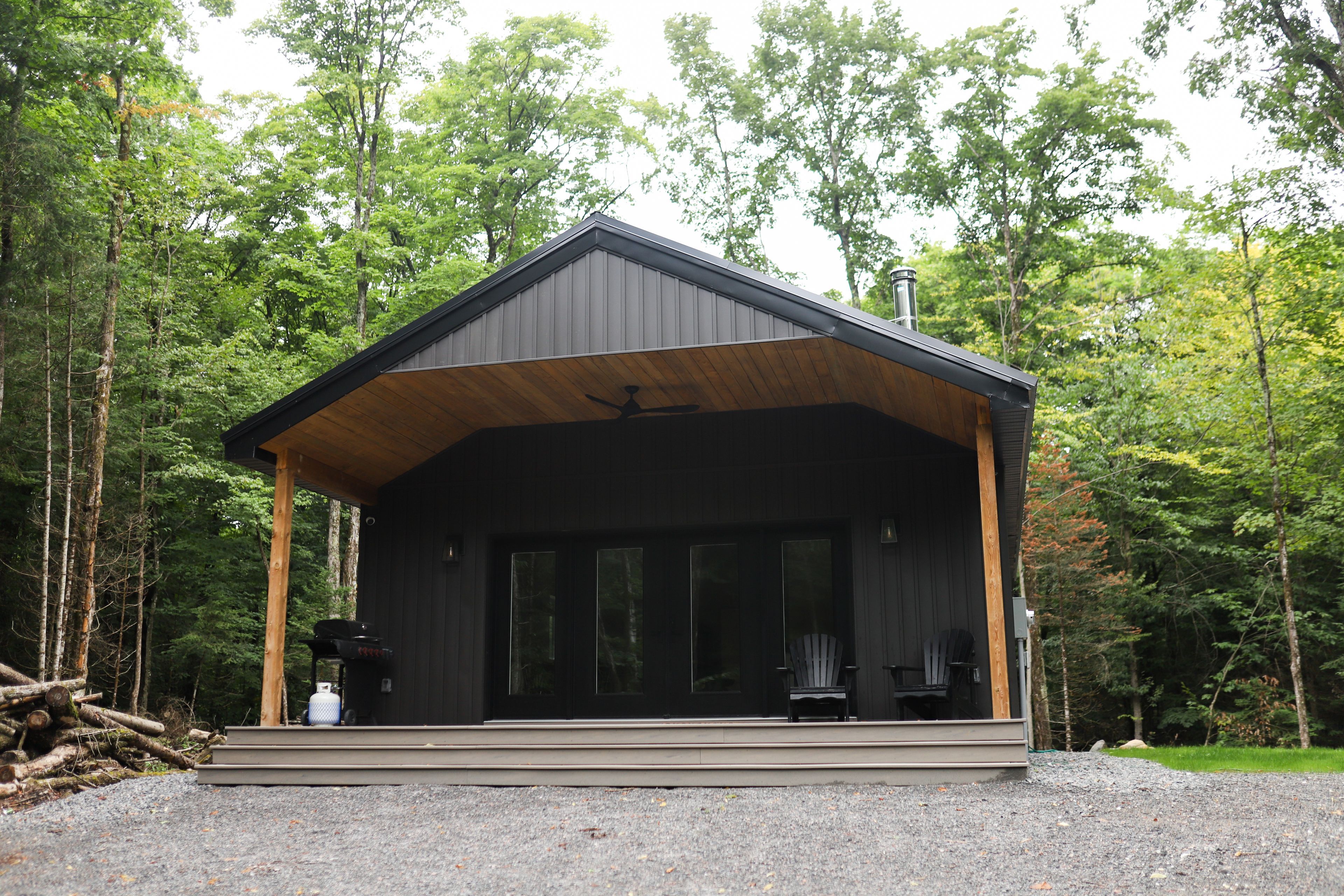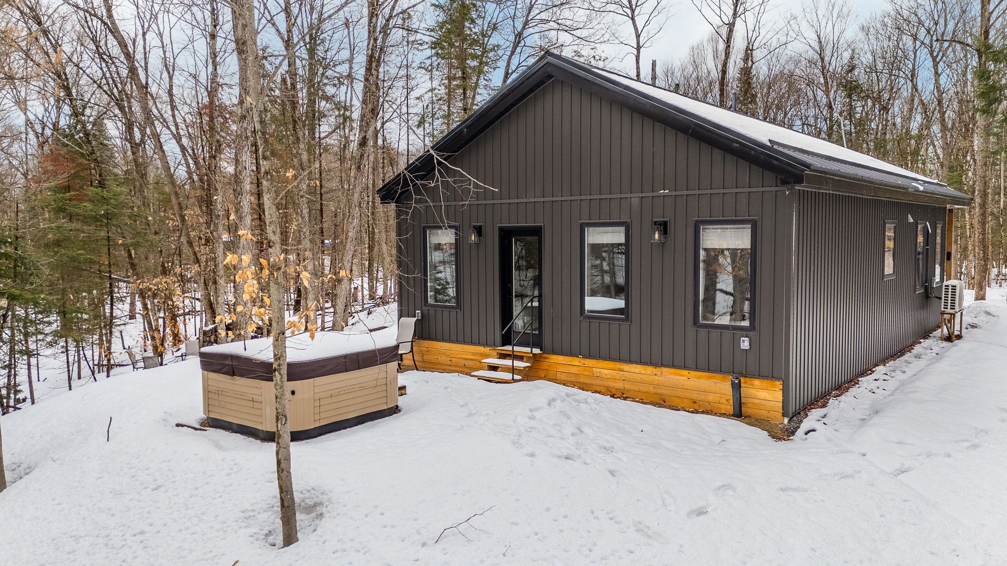 Experience the ultimate 4-season eagle lake retreat at 1366 basshaunt lake road, a stunning modern bungalow completed in 2023. Nestled on a private, well-treed lot, this home welcomes you with a spacious covered front veranda - the perfect spot to enjoy your morning coffee while surrounded by the quiet of the forest. Inside, the bright and airy open-concept living space is defined by natural light and a cozy woodstove that provides a warm, central hearth for winter gatherings. The sleek, contemporary kitchen is a chef's delight, featuring corian countertops, stainless steel appliances, and an oversized island designed for social gatherings and casual dining. The home offers two generous bedrooms, including a primary suite with a private walkout to the backyard. Outside, the level property offers plenty of usable space, a dedicated firepit area for starlit evenings, and a handy storage shed. Built for low-maintenance living, the home features a durable metal roof, efficient mini-split heating and cooling, and a sleek, modern bathroom with an integrated stackable laundry. Located in the premium eagle lake area, you are within walking distance of the basshaunt lake public access and just minutes from eagle lake's best amenities. Spend your days at sir sam's ski & ride, indulge in the spa and fine dining at sir sam's inn, or enjoy the public sandy beach and boat launch at eagle lake. With an successful short-term rental history, this turn-key property is ready to serve as your private four-season retreat or a high-performing investment in haliburton.