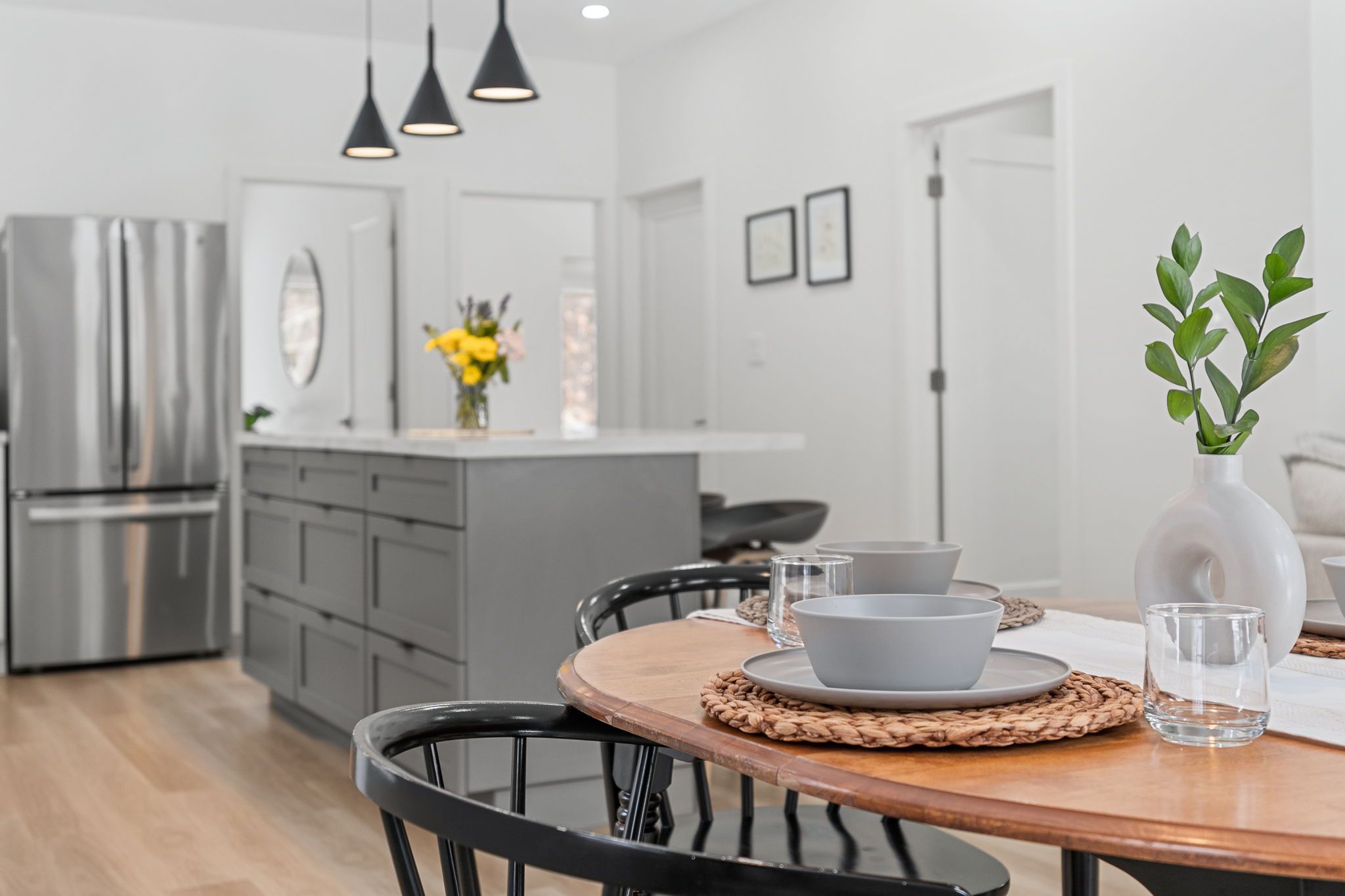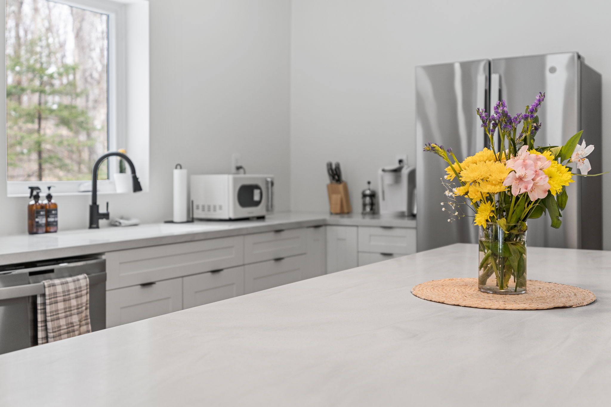 • Sleek kitchen with Corian countertops and an oversized island for gatherings.