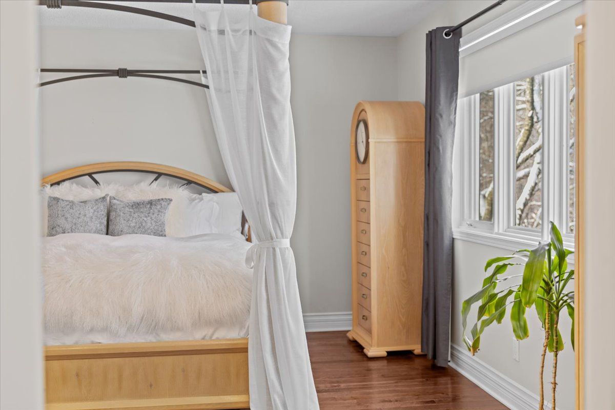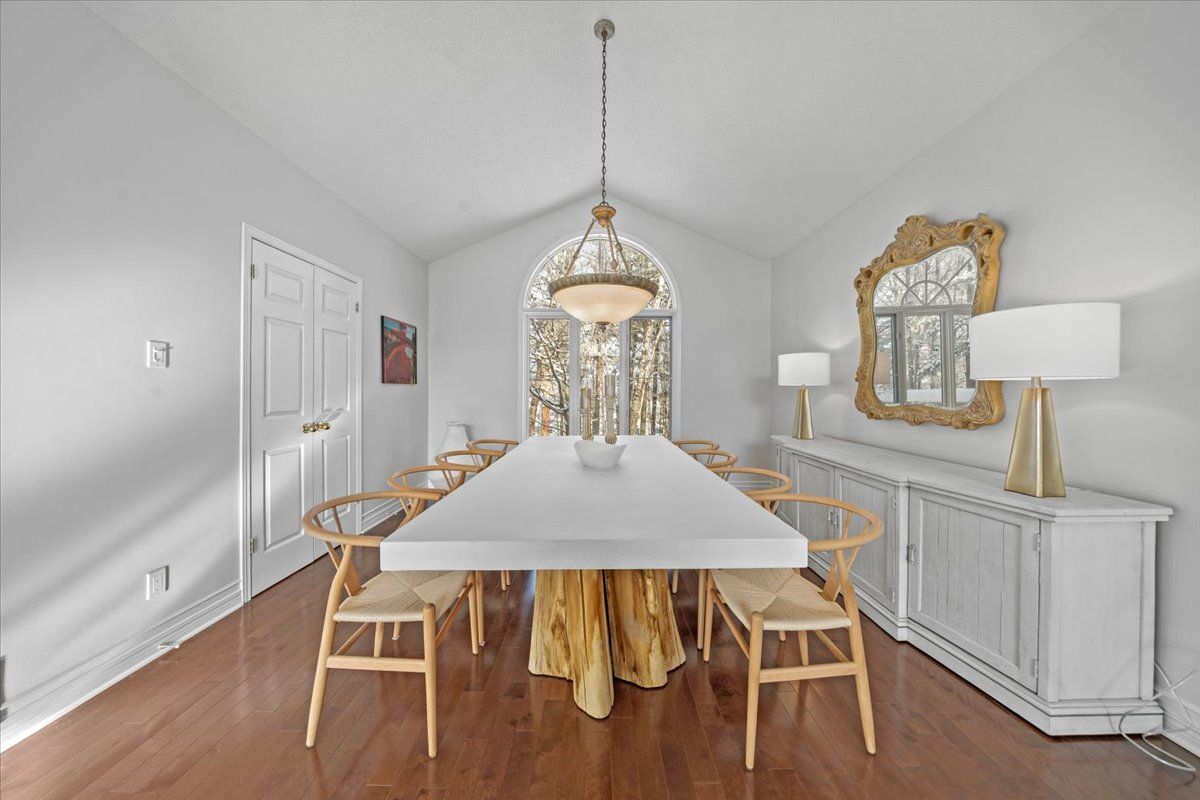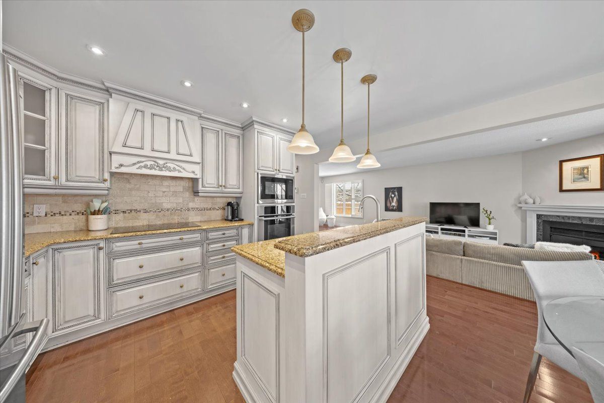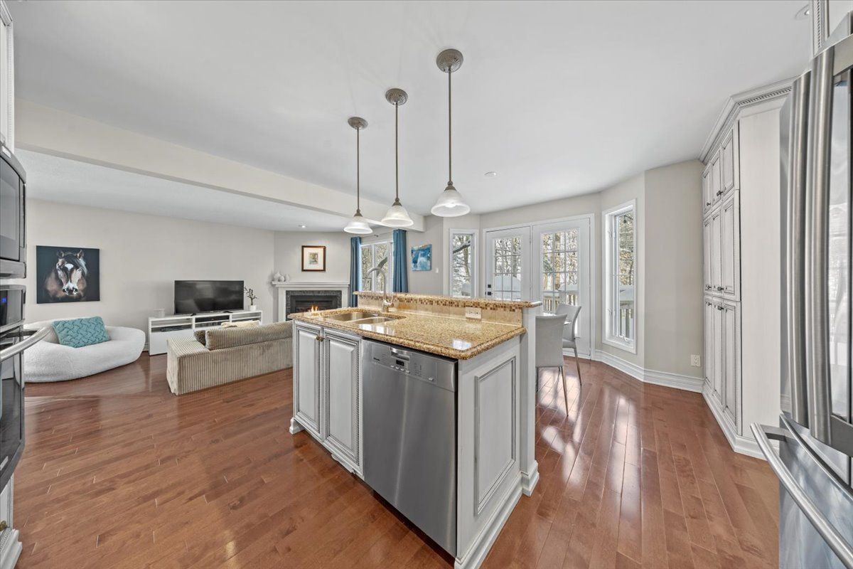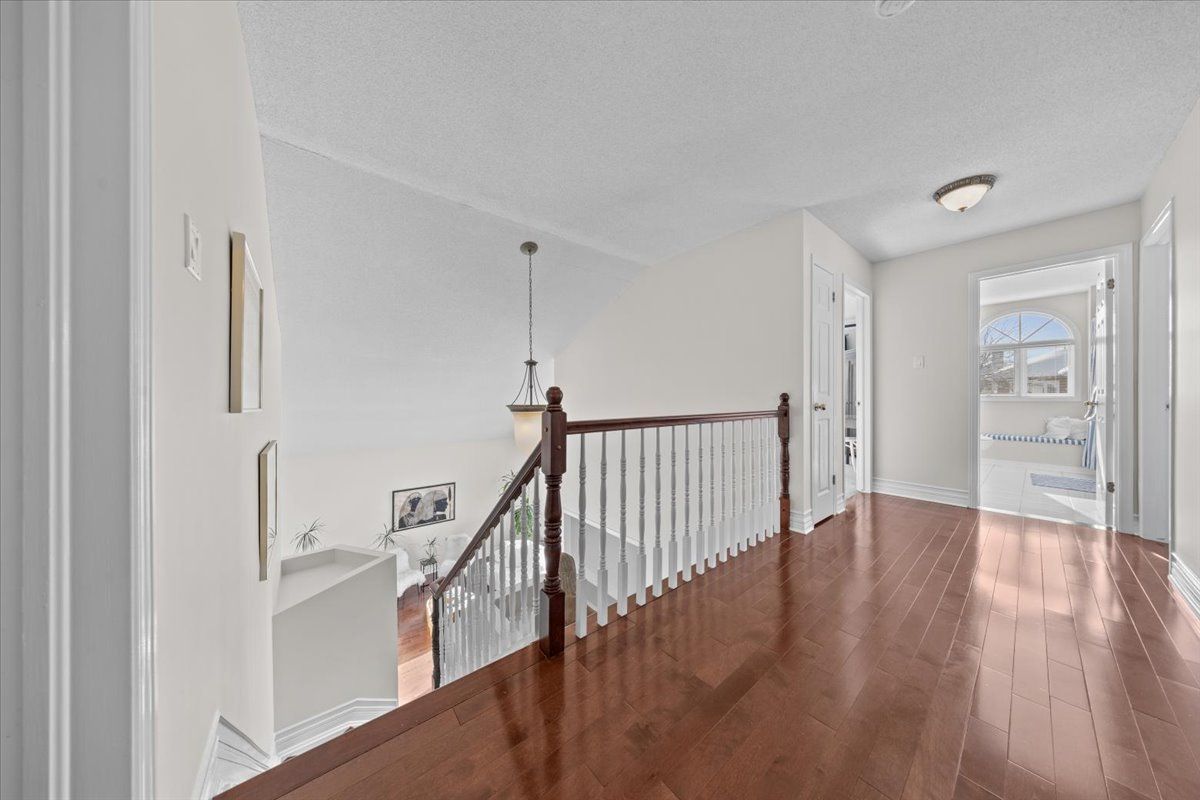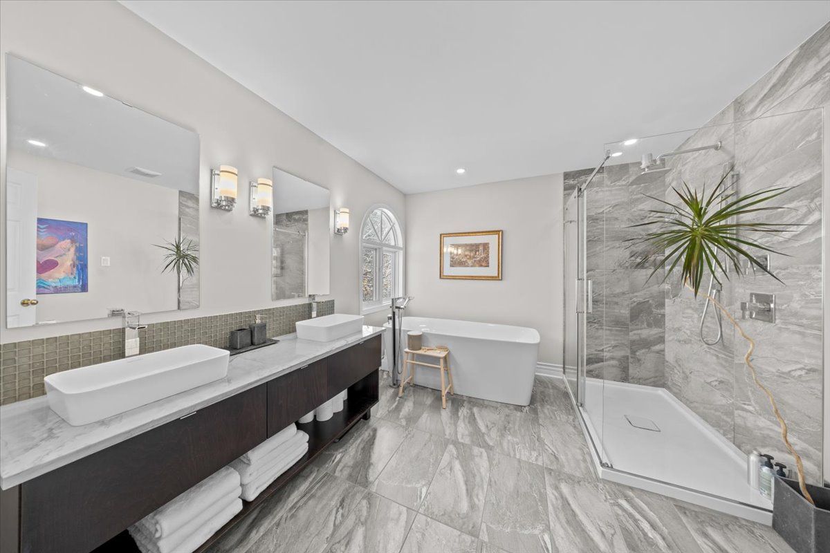 Prestigious 4+1 bedroom home w/pie-shaped rear yard backing onto ravine, twin garage doors, multiple roof peaks, curved transom windows, brick front exterior, interlock walkway, covered front entrance, modern front door w/vertical transom, foyer w/ceramic tile & closet, high baseboards, victoria-style open hardwood staircase & 2-storey high ceiling, living room w/vaulted ceilings, wide-plank hardwood flooring & oversized windows, dining room w/ravine views & butler doors, stylish centre-island kitchen w/granite countertops, recessed sink, pot drawers, marble backsplash, detailed upper and lower mouldings, custom hood-fan, built-in oven & microwave, 4 x burner induction cooktop, deep 24-inch pantry w/pull-out shelving, eating area w/panoramic windows & twin garden doors onto elevated entertainment-sized deck, sunken family room w/pot lighting & wood-burning fireplace framed in marble, open main-floor den w/glass doors & california shutters, 2-pc powder room, main-floor laundry room w/soaker sink & side-door entrance, 2nd level landing w/hardwood, mezzanine railings & linen closet, primary bedroom retreat w/french doors, multiple windows, soft pot lighting, updated spa-style ensuite w/double raised boxed sinks & waterfall taps, quartz-topped vanity, oversized ceramic tile flooring, double-wide glass shower w/rain head and european faucet, stand alone soaker tub positioned w/serene ravine views, deep double-sided walk-in closet, 3 x additional bedrooms w/generous closet space, 4-pc main bathroom w/extra linen storage & window bench seat, straight staircase to multifunctional recreation room w/9-ft high ceilings, twin oversized chest-height windows, coffered ceiling, pot lighting, gas fireplace & entertainment bar, 5th bedroom w/double closets, 3-pc bathroom w/stand-up shower, exercise room w/seasonal closet, storage room w/built-in shelving, rear yard framed by mature trees & side fencing, 2x car garage w/inside access, 24 hour irrevocable on offers