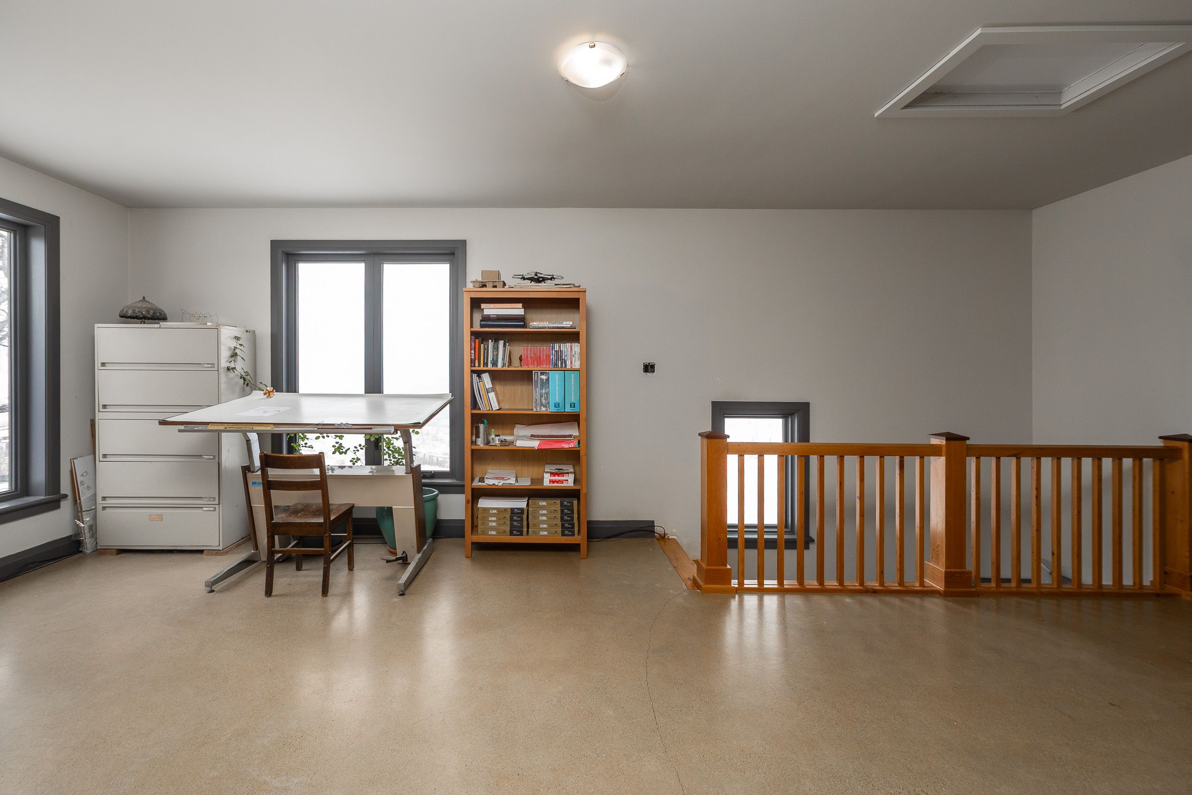 • Spacious great room with a brick-backed fireplace and classic wood stove.