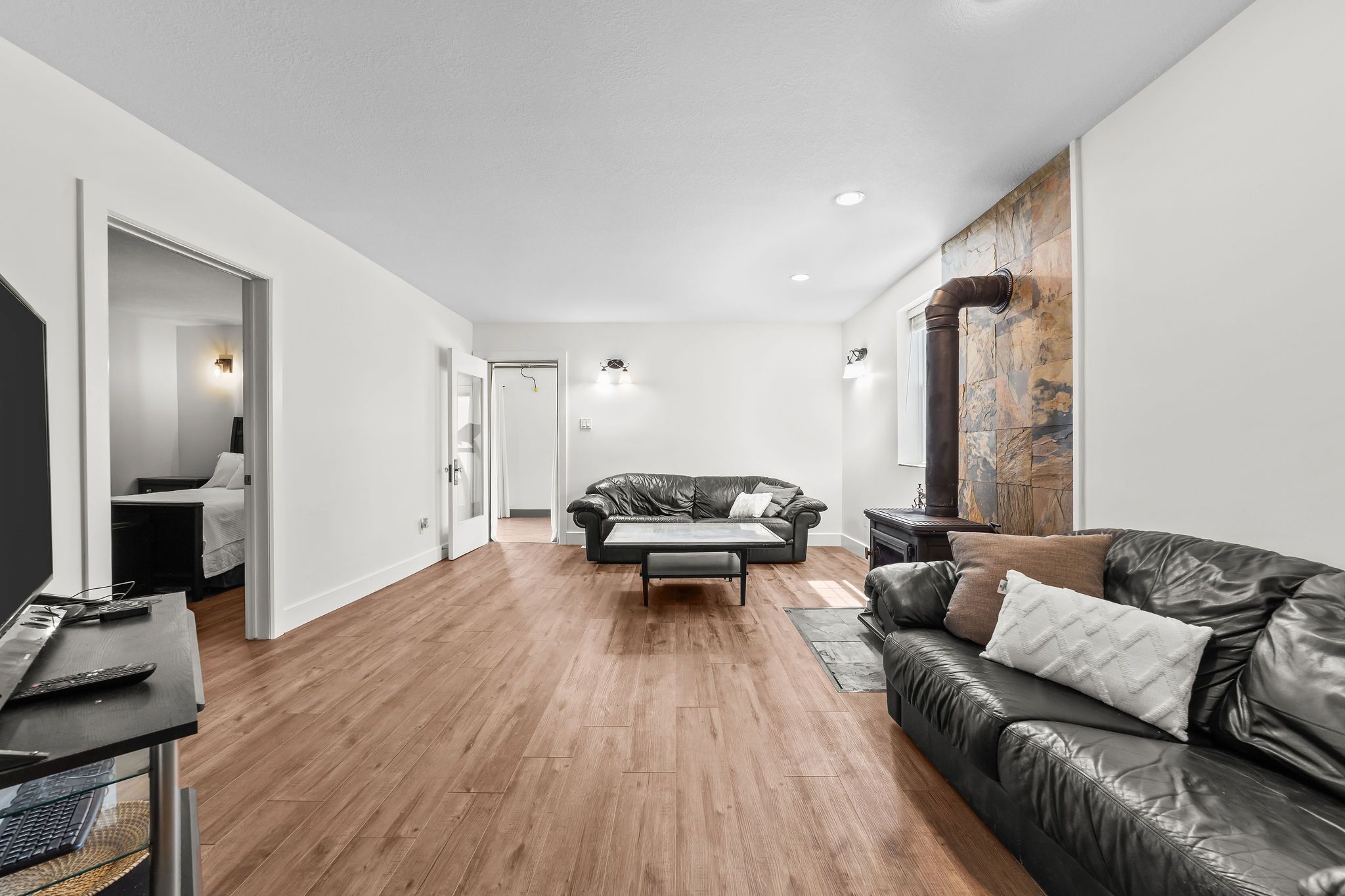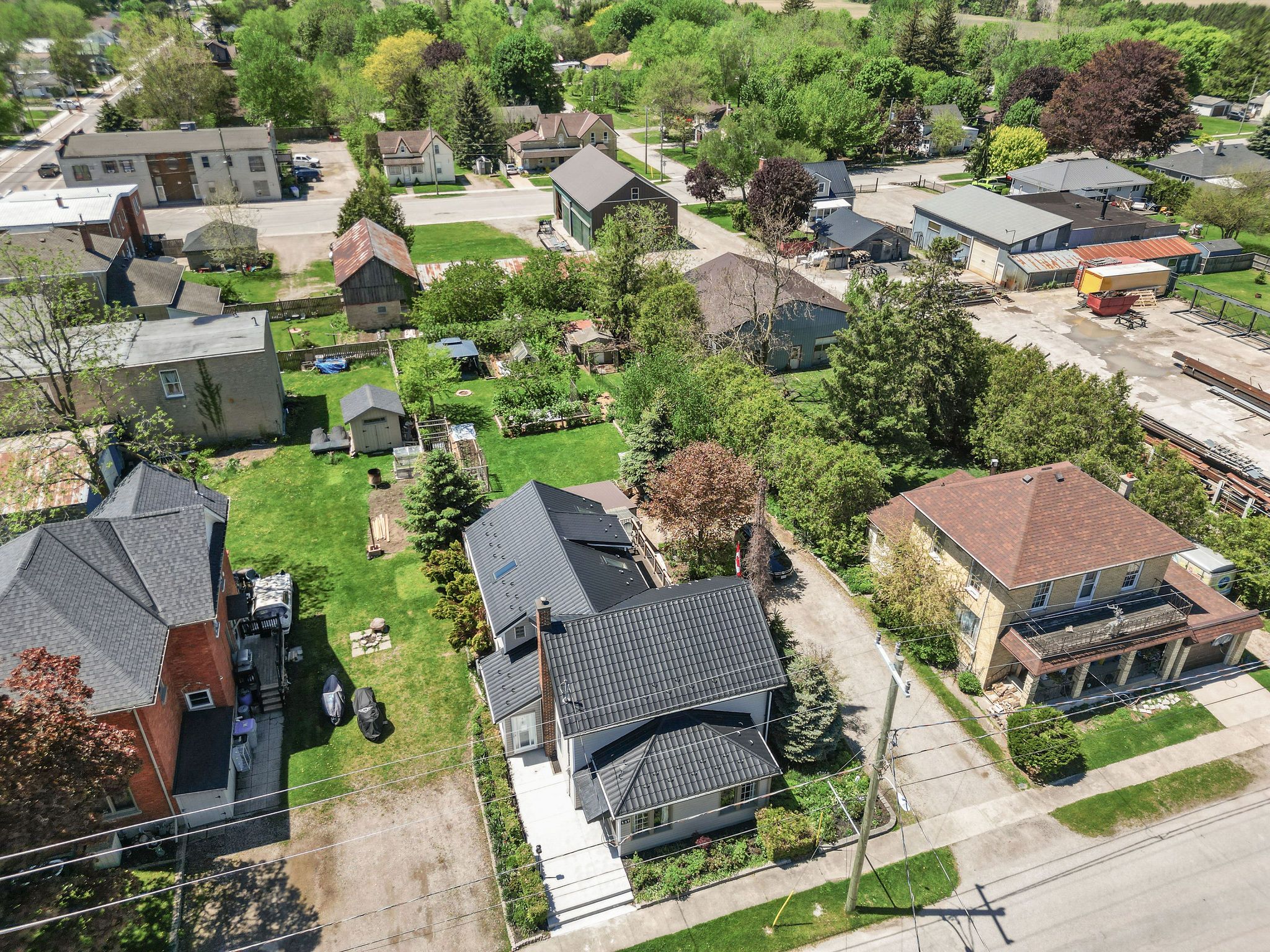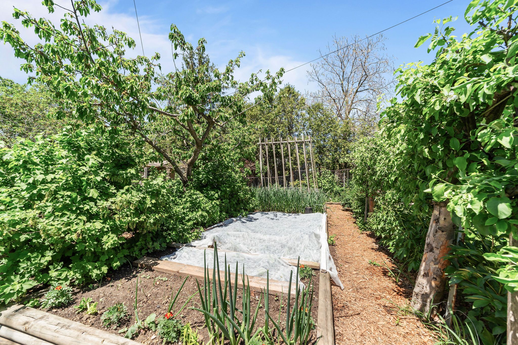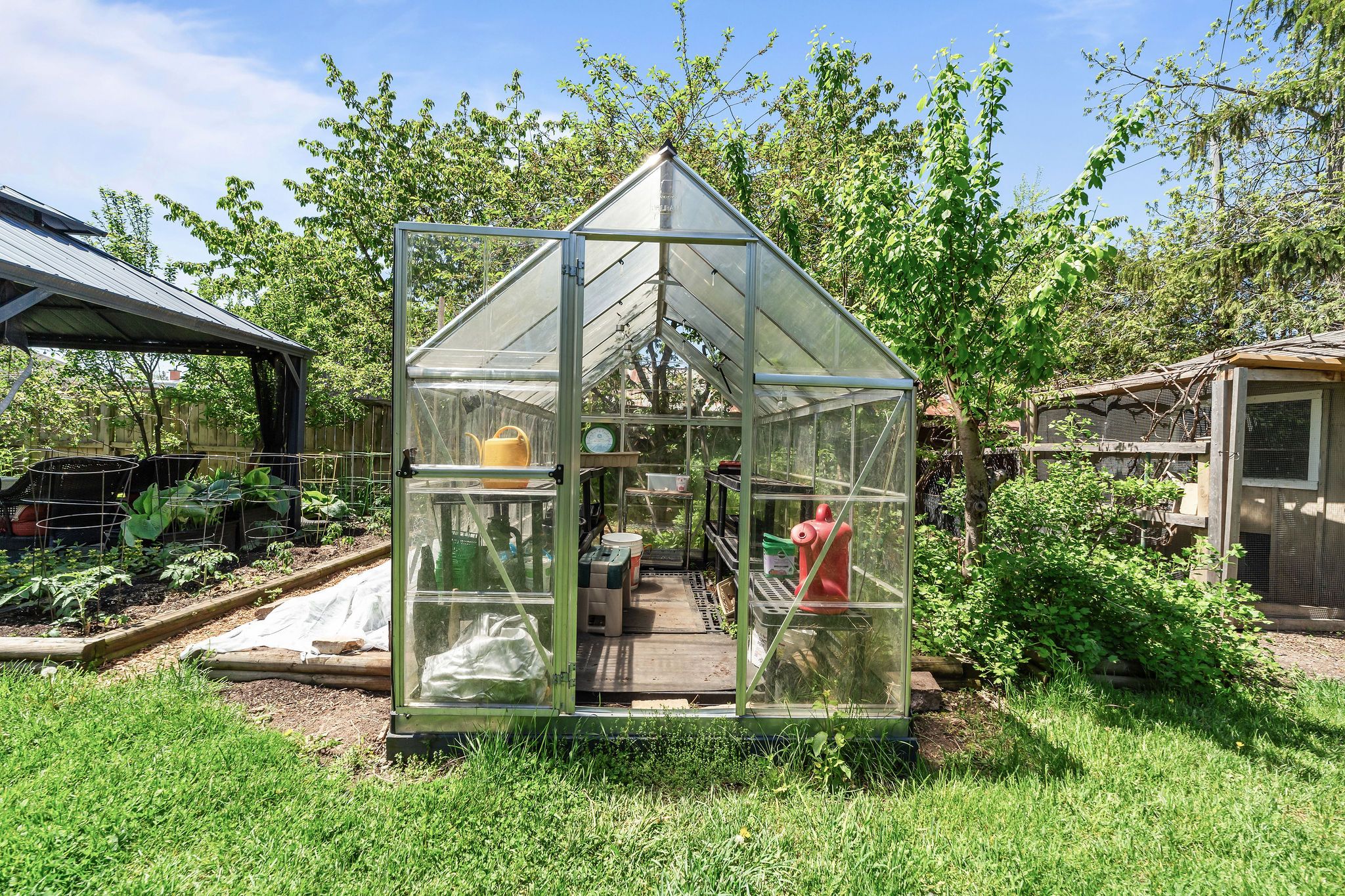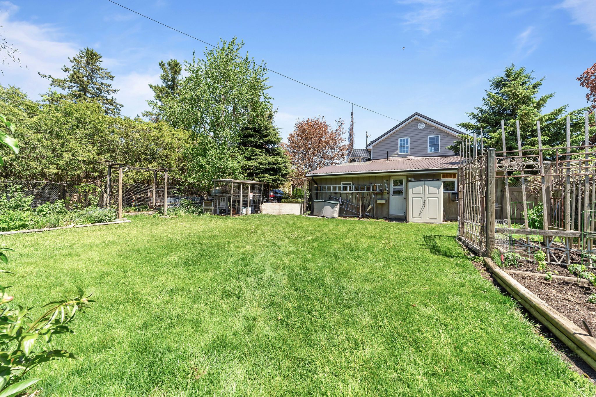 Set on a private quarter-acre lot surrounded by breathtaking gardens and mature fruit trees, this beautifully updated 4+1 bedroom home features a steel roof and an abundance of charm. A crisp concrete front porch and back walkways lead you into a spacious mudroom that sets the welcoming tone as you step inside. The main floor is open and inviting, with a bright kitchen and dining area perfect for gatherings. The family room features a cozy freestanding stove, while a large main floor bedroom adds flexibility to the layout. You'll also find a sun-filled front porch and a walk-in shower bathroom conveniently located near the home office and laundry room, which provides direct access to the garage. Upstairs, youll be impressed by the additional family room with exposed wood beams and another full bathroom. One of the upper bedrooms features a walkout porch overlooking the stunning backyard a true garden lovers dream with 78 fruit trees, including apple, pear, peach, and cherry, as well as berry bushes like gooseberry and red currants. The property also includes two chicken coops for those looking to embrace a homestead lifestyle. Updates 2025: new eavestroughs, seamless aluminum & downspouts, new soffit and facia2024 - all new floors up & down, painting, professionally refinished cabinets, quartz countertops, closet doors, baseboards. 2023 updated fridge, gas stove, built-in microwave, dishwasher, new window/doors (2002), new steel roof life warranty (2022) updated insulation in the walls (2002) newer front porch & side concrete, furnace 2020, air conditioner - 2020, new fence, front porch (2025)