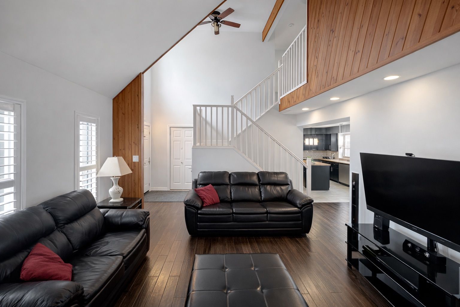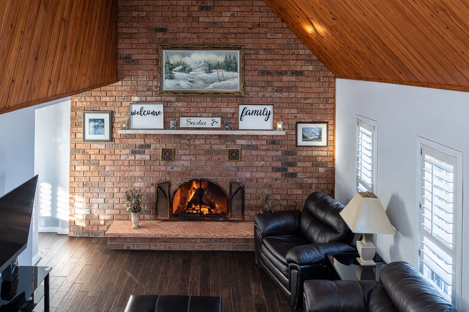 • Bright living room with vaulted ceilings and a cozy wood-burning fireplace.