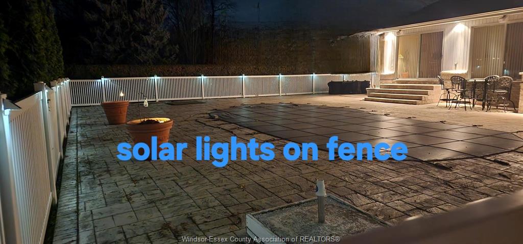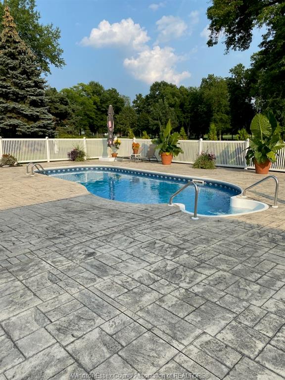 • Kidney-shaped inground sports pool surrounded by stamped concrete and solar lights.