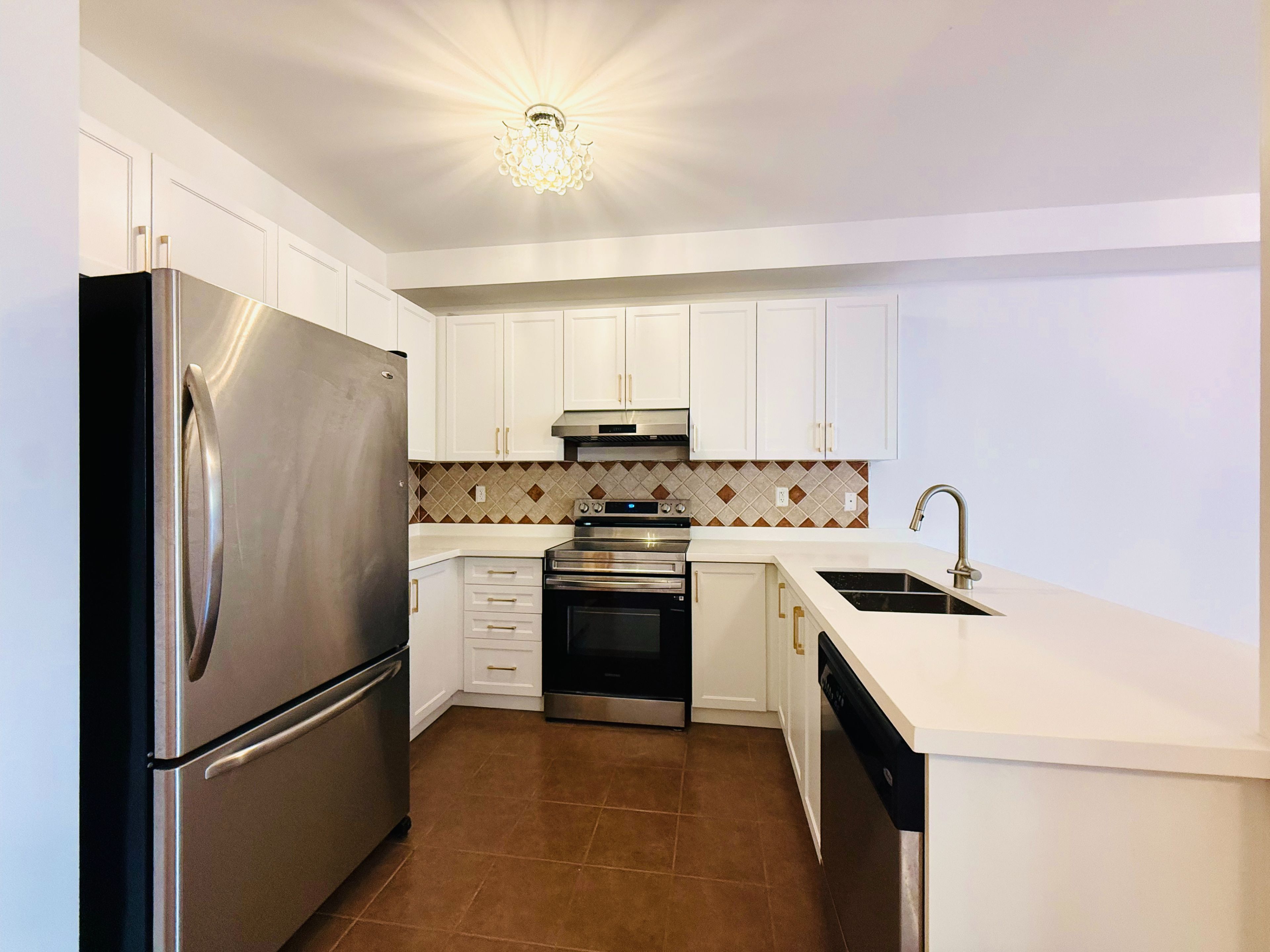 • Galley-style kitchen equipped with stainless steel appliances and quartz countertops.