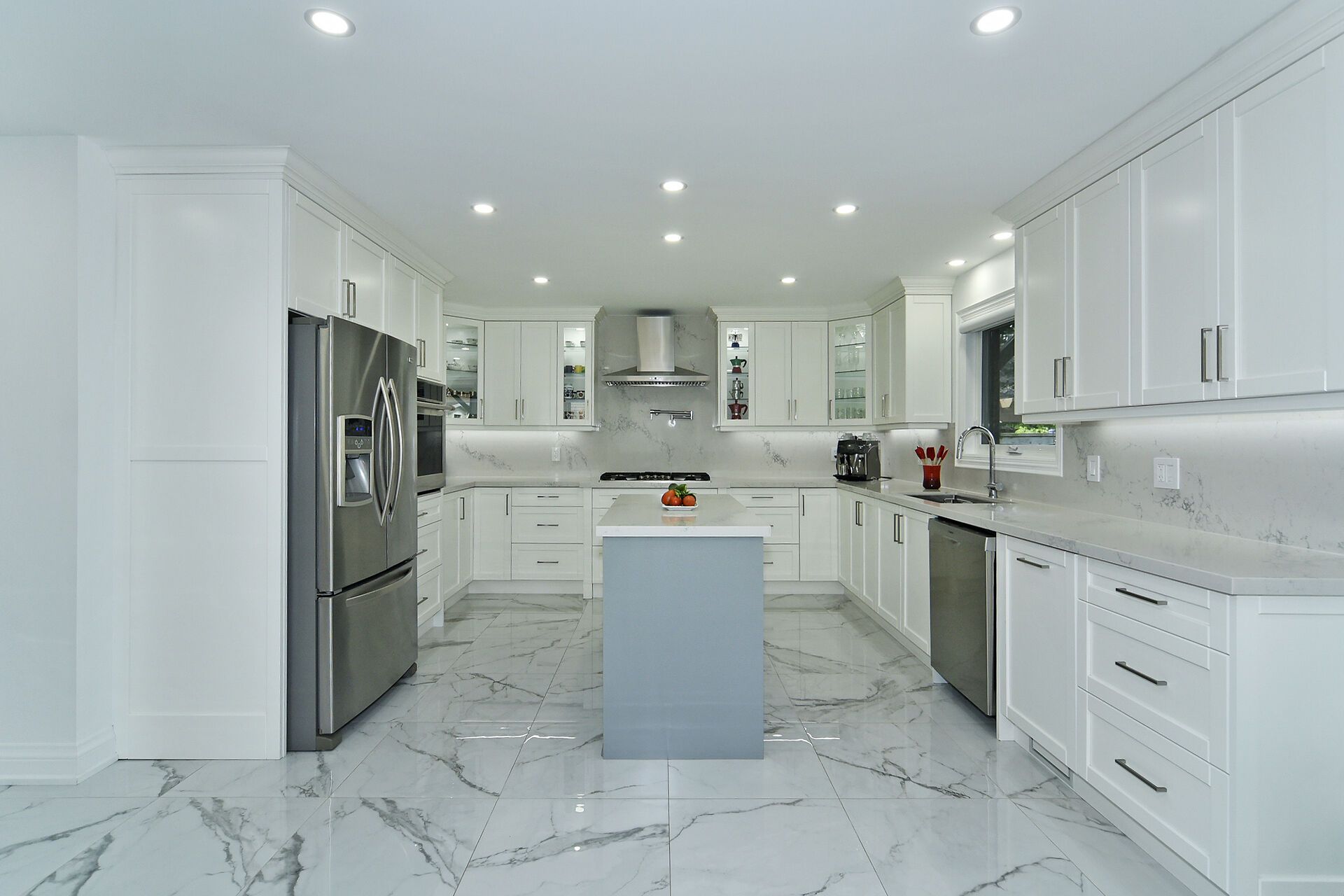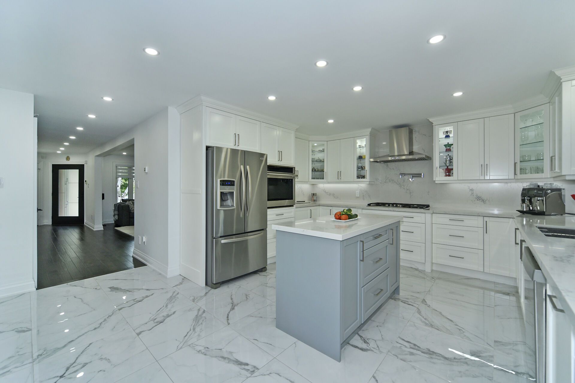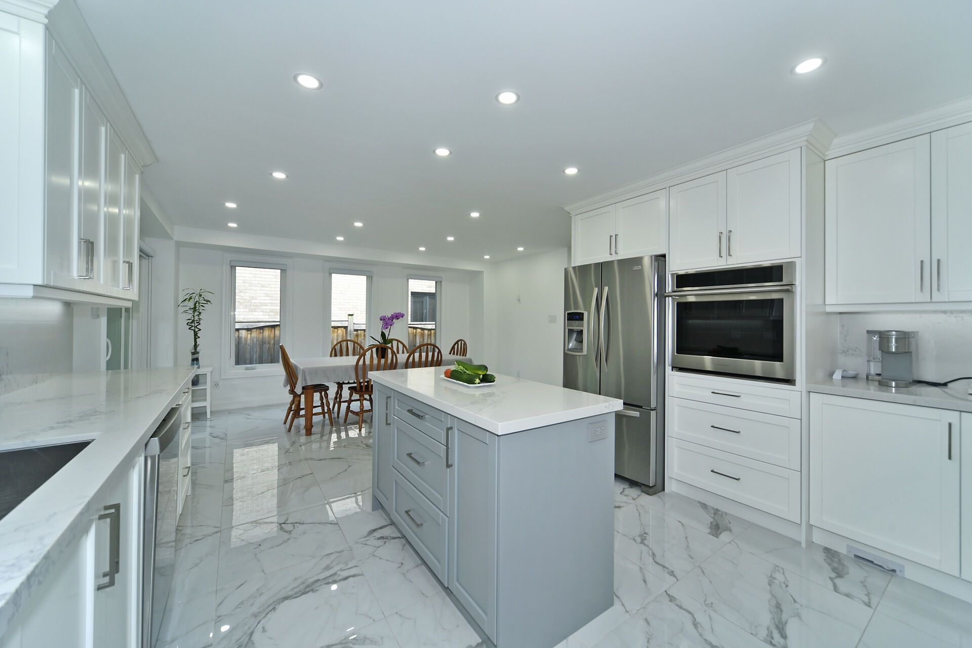 • Spacious kitchen featuring modern built-in appliances and new decor.