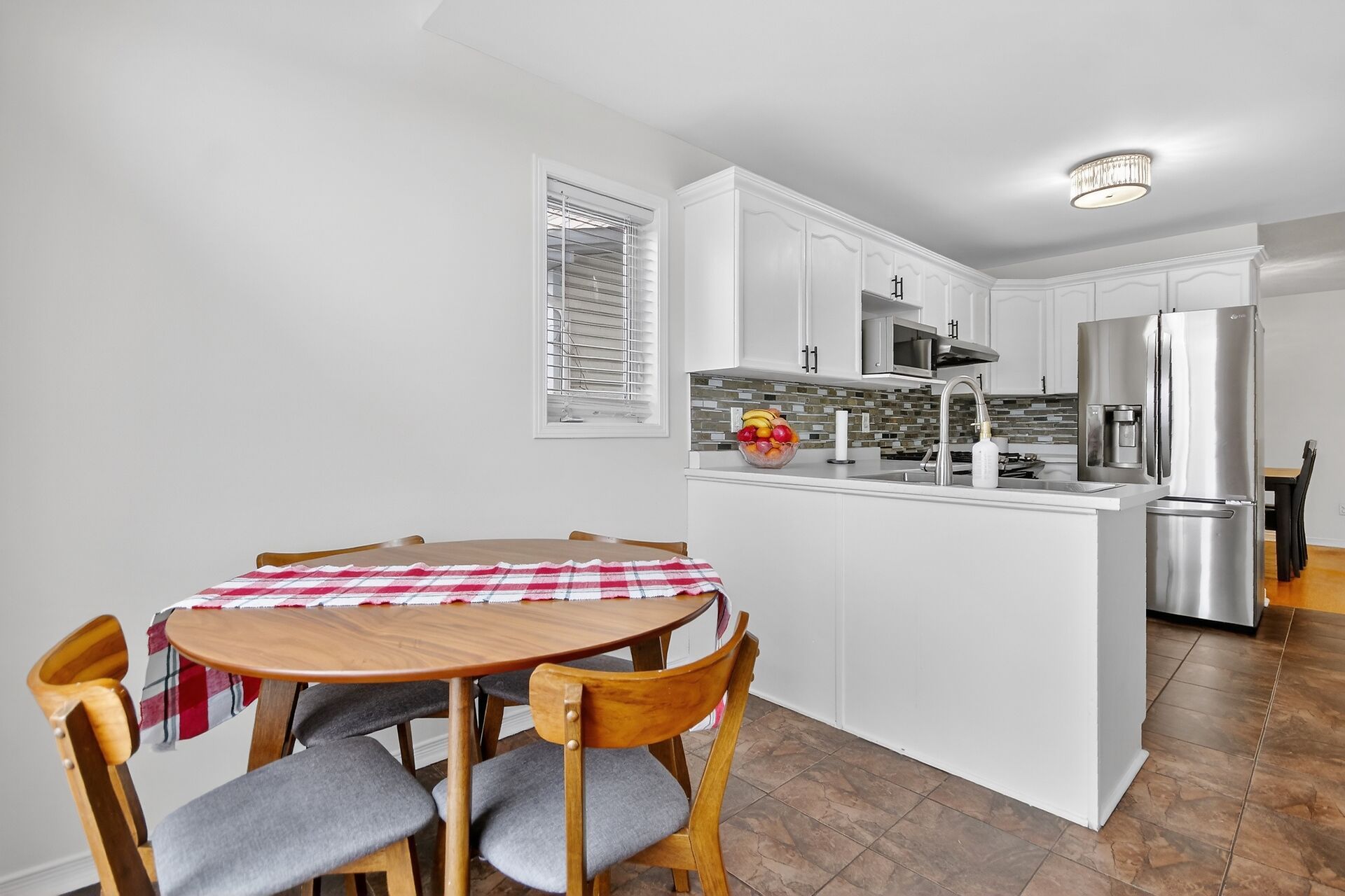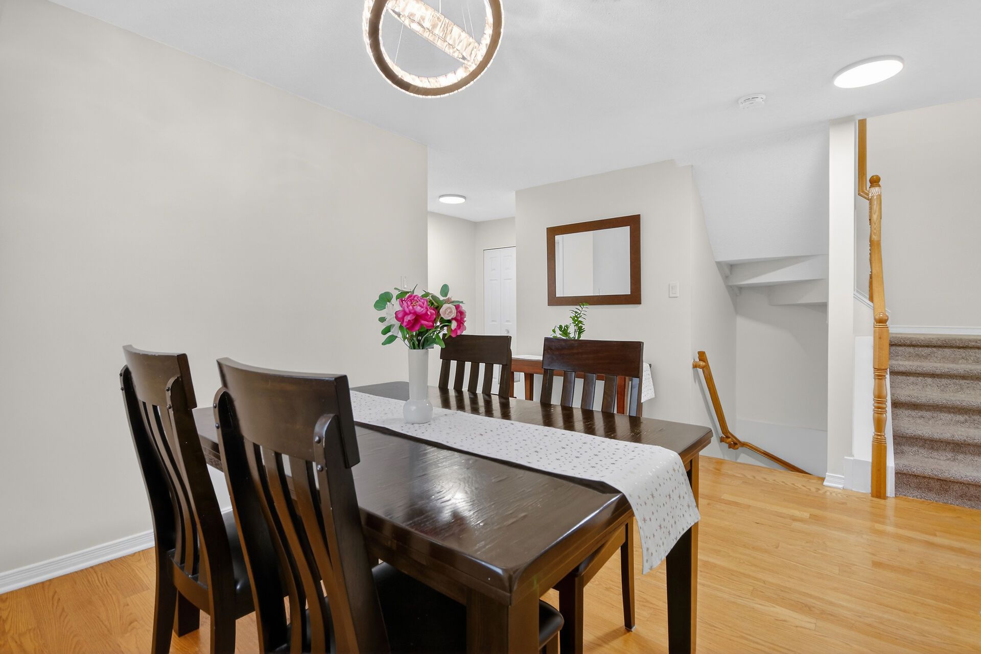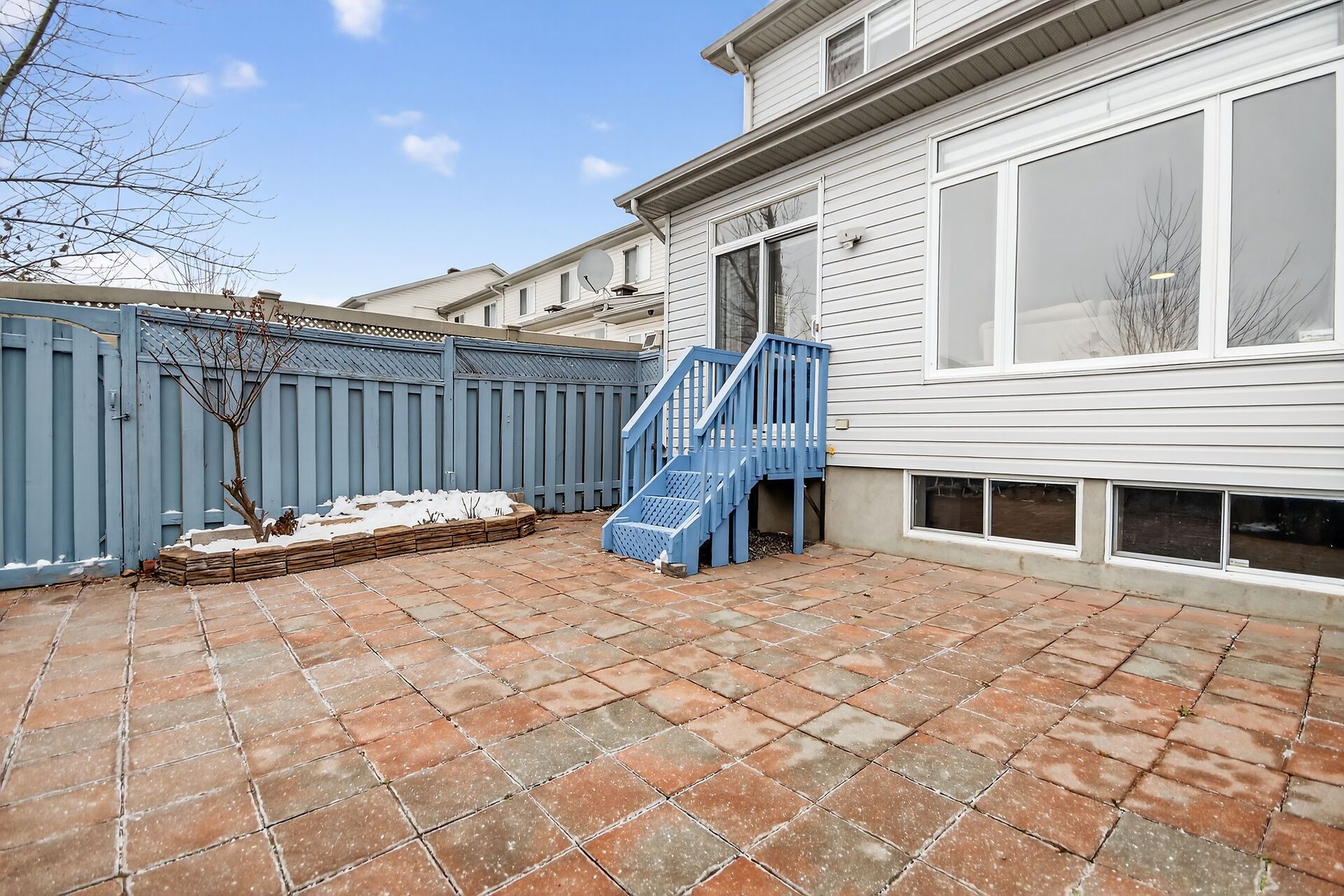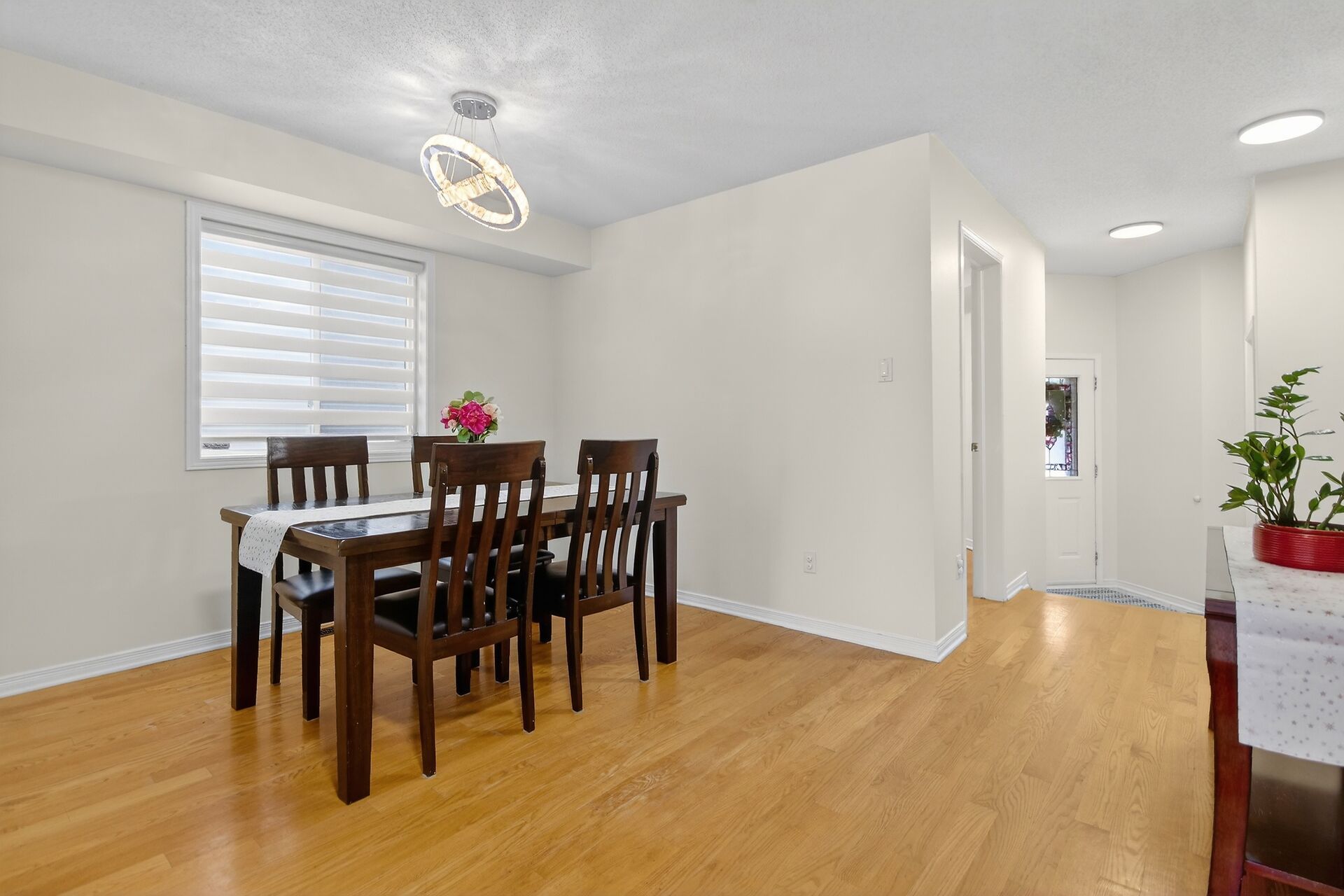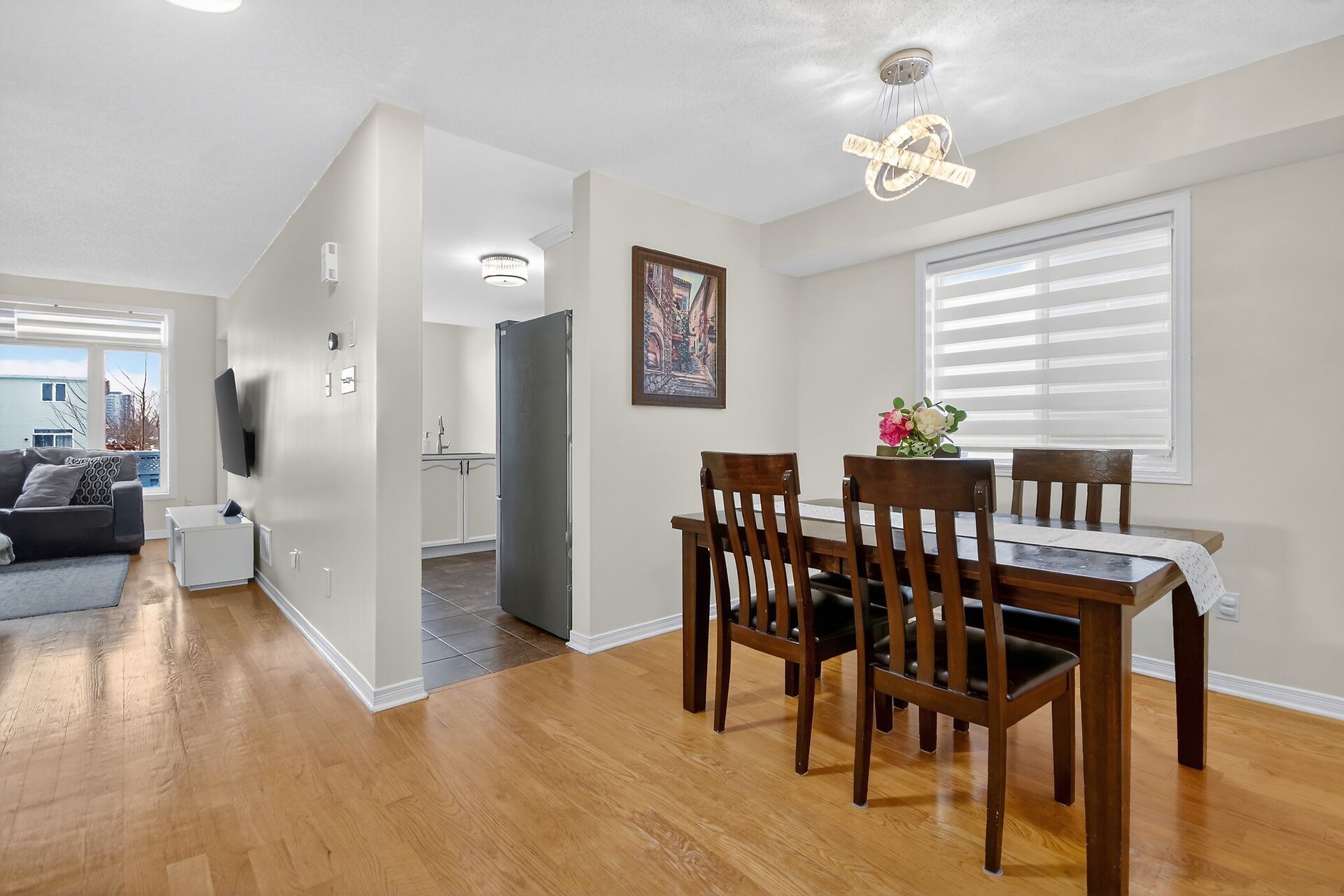 Welcome to this move-in ready end-unit townhouse that backs on the albion park's walking path in the popular hunt club area! Offering 1,665 sq/ft + a finished basement, this home is conveniently located within walking distance to multiple parks, great schools, various shopping plazas, restaurants & both the albion & the jim durrell recreational centre. Walking into the open-concept main level you find a large foyer that connects to the mudroom with direct access to the garage. This bright level with hardwood floors showcases a private front office, an updated powder room, a dining room, a living room with cozy gas fireplace & a refreshed kitchen with new countertops, stainless steel appliances, gas stove, custom backsplash & eat-in area. The 2nd level has new hardwood floors and hosts 2 big secondary bedrooms, an updated main bathroom & a spacious primary bedroom with walk-in closet and private ensuite with soaker tub & stand-up shower. The lower level features a sizable family room with big windows, walk-in closet & new modern laminate floors. The large storage room has plenty of free area to expand & create more living space... Perfect for a future home gym or hobby room. This home is located on a quiet & low traffic street and backs on the walking path connected to albion park. The widened front driveway allows room to park 4 cars and the fully fenced backyard is zeroscaped with patio stones with a handy shed for extra storage. Great features and updates include: smart thermostat, custom privacy blinds, furnace & a/c (2022), freshly painted (2025), stair carpet (2025), 2nd level hardwood (2025), basement laminate flooring (2025), kitchen countertops (2025).