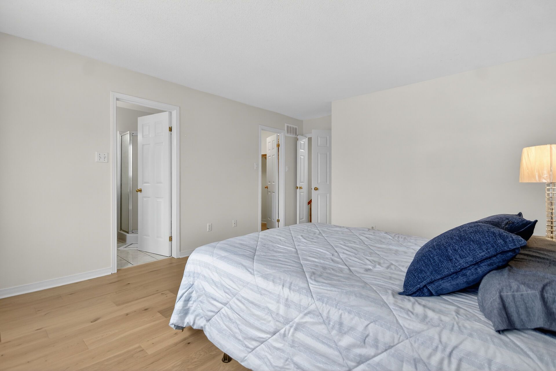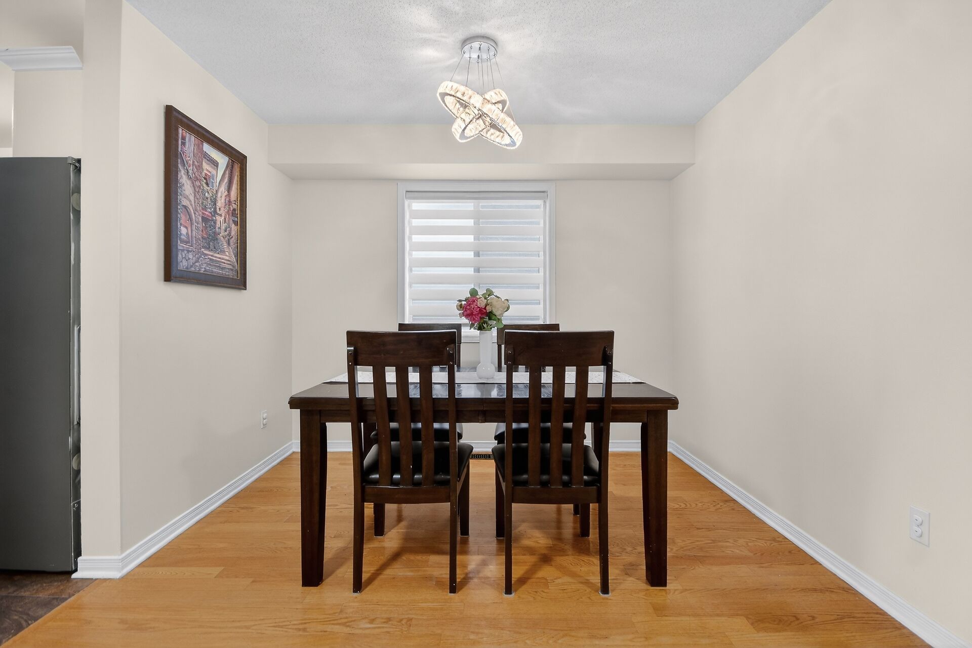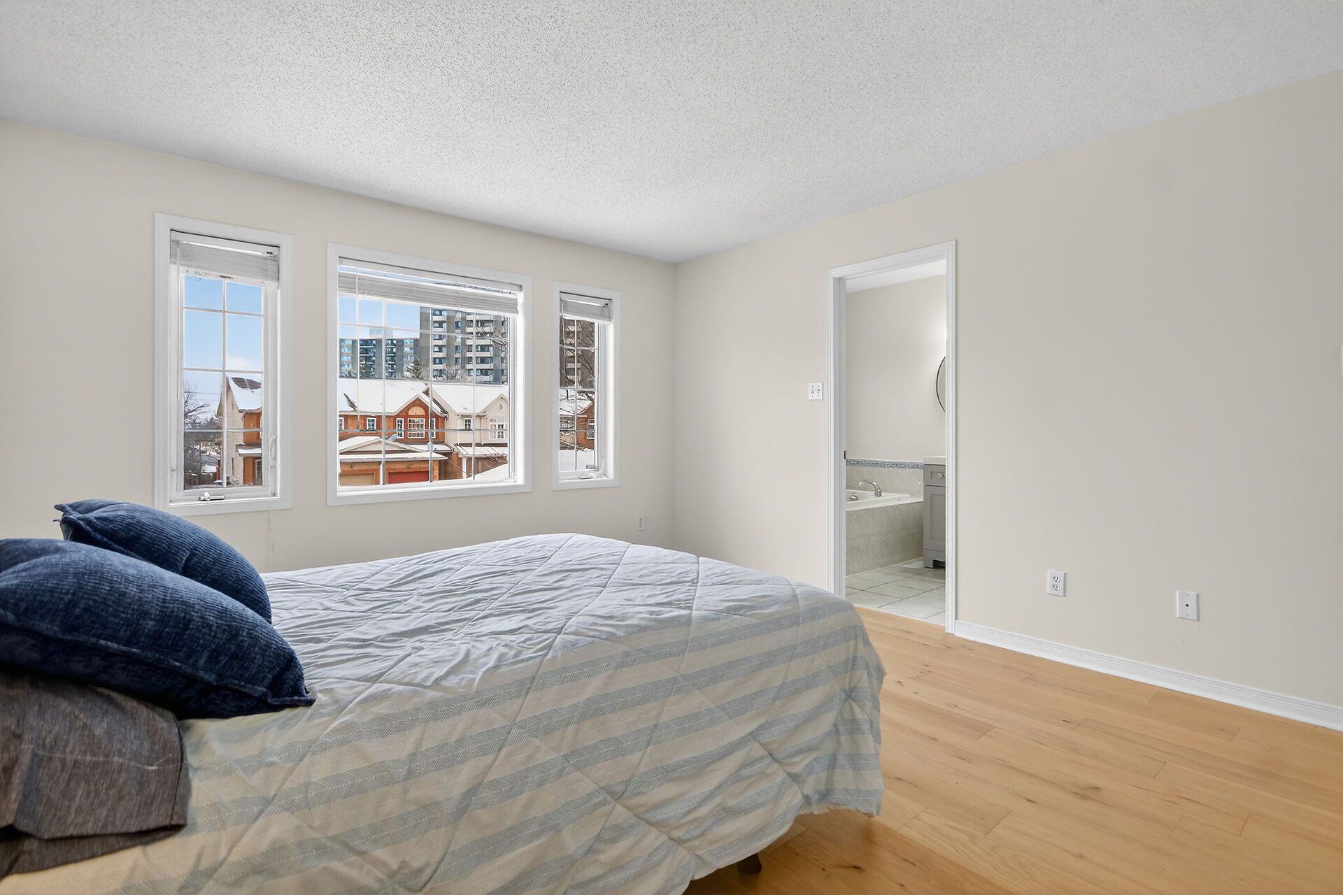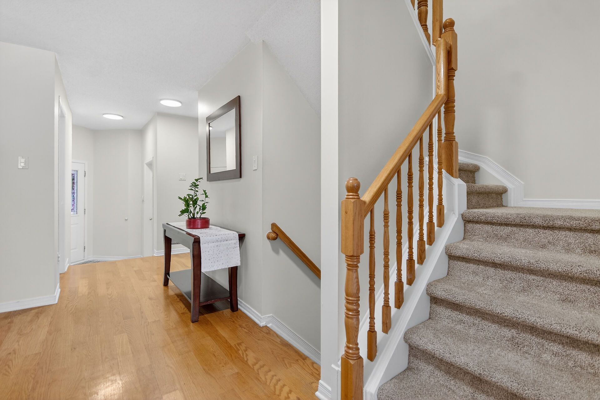Welcome to this move-in ready end-unit townhouse that backs on the albion park's walking path in the popular hunt club area! Offering 1,665 sq/ft + a finished basement, this home is conveniently located within walking distance to multiple parks, great schools, various shopping plazas, restaurants & both the albion & the jim durrell recreational centre. Walking into the open-concept main level you find a large foyer that connects to the mudroom with direct access to the garage. This bright level with hardwood floors showcases a private front office, an updated powder room, a dining room, a living room with cozy gas fireplace & a refreshed kitchen with new countertops, stainless steel appliances, gas stove, custom backsplash & eat-in area. The 2nd level has new hardwood floors and hosts 2 big secondary bedrooms, an updated main bathroom & a spacious primary bedroom with walk-in closet and private ensuite with soaker tub & stand-up shower. The lower level features a sizable family room with big windows, walk-in closet & new modern laminate floors. The large storage room has plenty of free area to expand & create more living space... Perfect for a future home gym or hobby room. This home is located on a quiet & low traffic street and backs on the walking path connected to albion park. The widened front driveway allows room to park 4 cars and the fully fenced backyard is zeroscaped with patio stones with a handy shed for extra storage. Great features and updates include: smart thermostat, custom privacy blinds, furnace & a/c (2022), freshly painted (2025), stair carpet (2025), 2nd level hardwood (2025), basement laminate flooring (2025), kitchen countertops (2025).