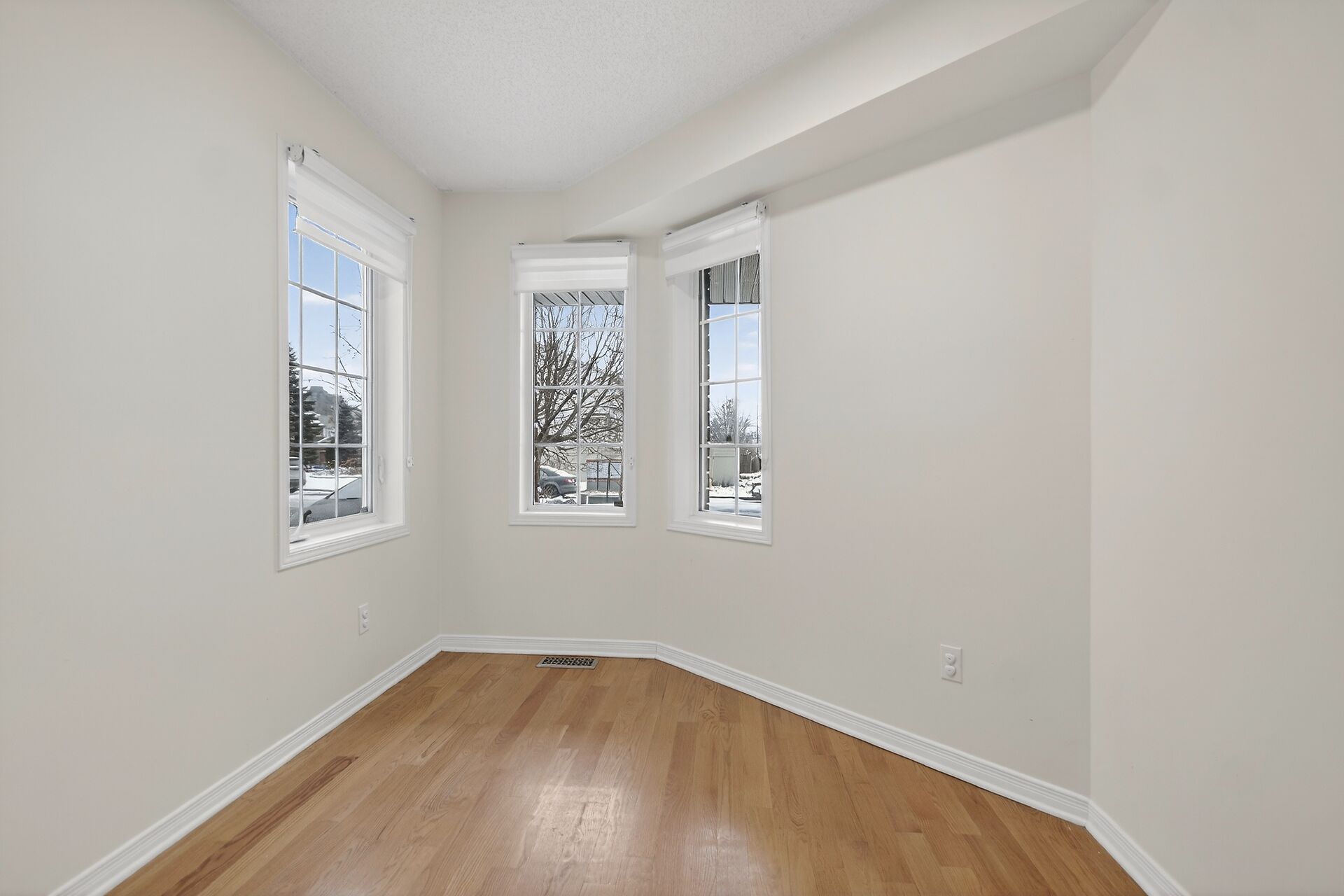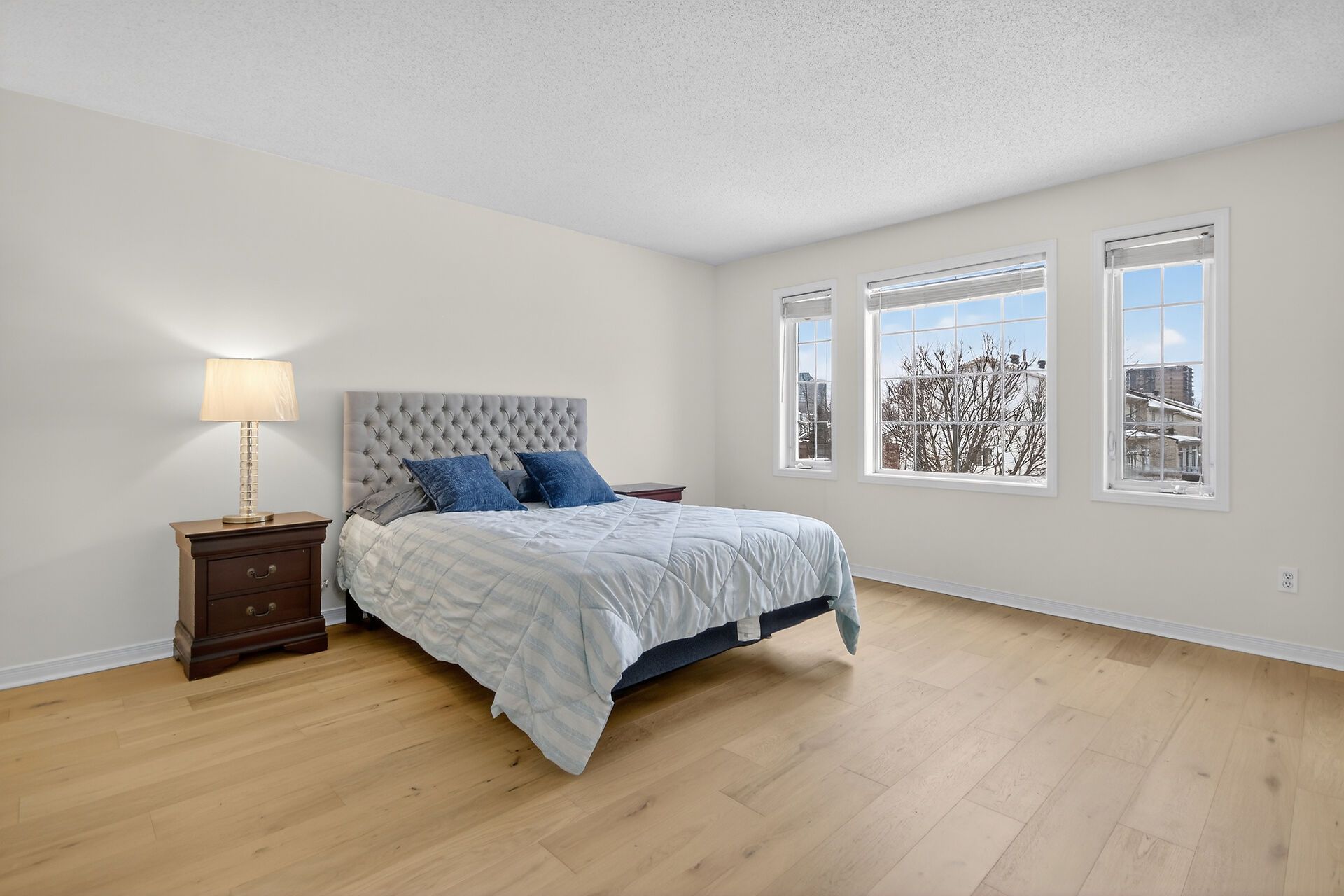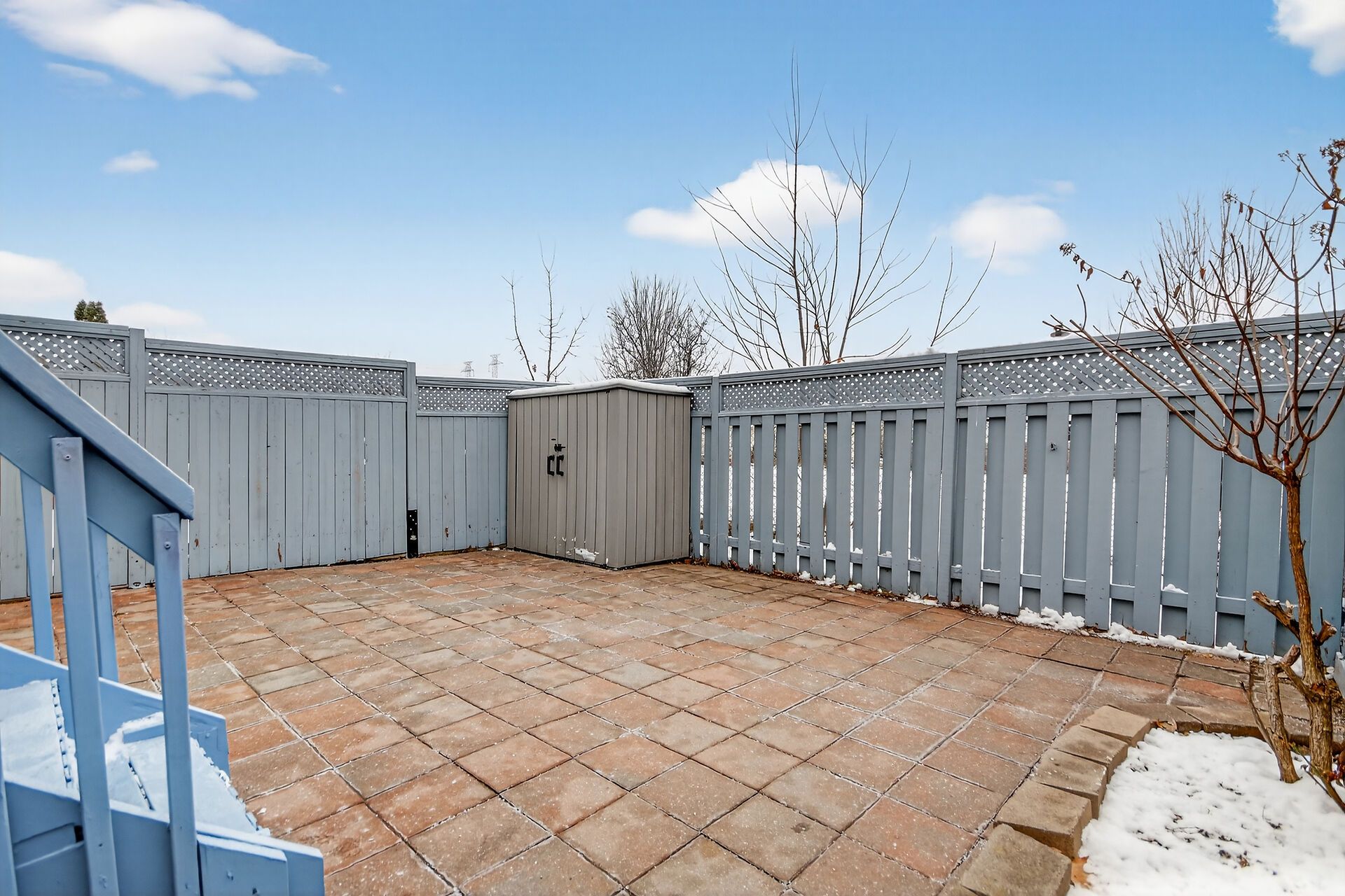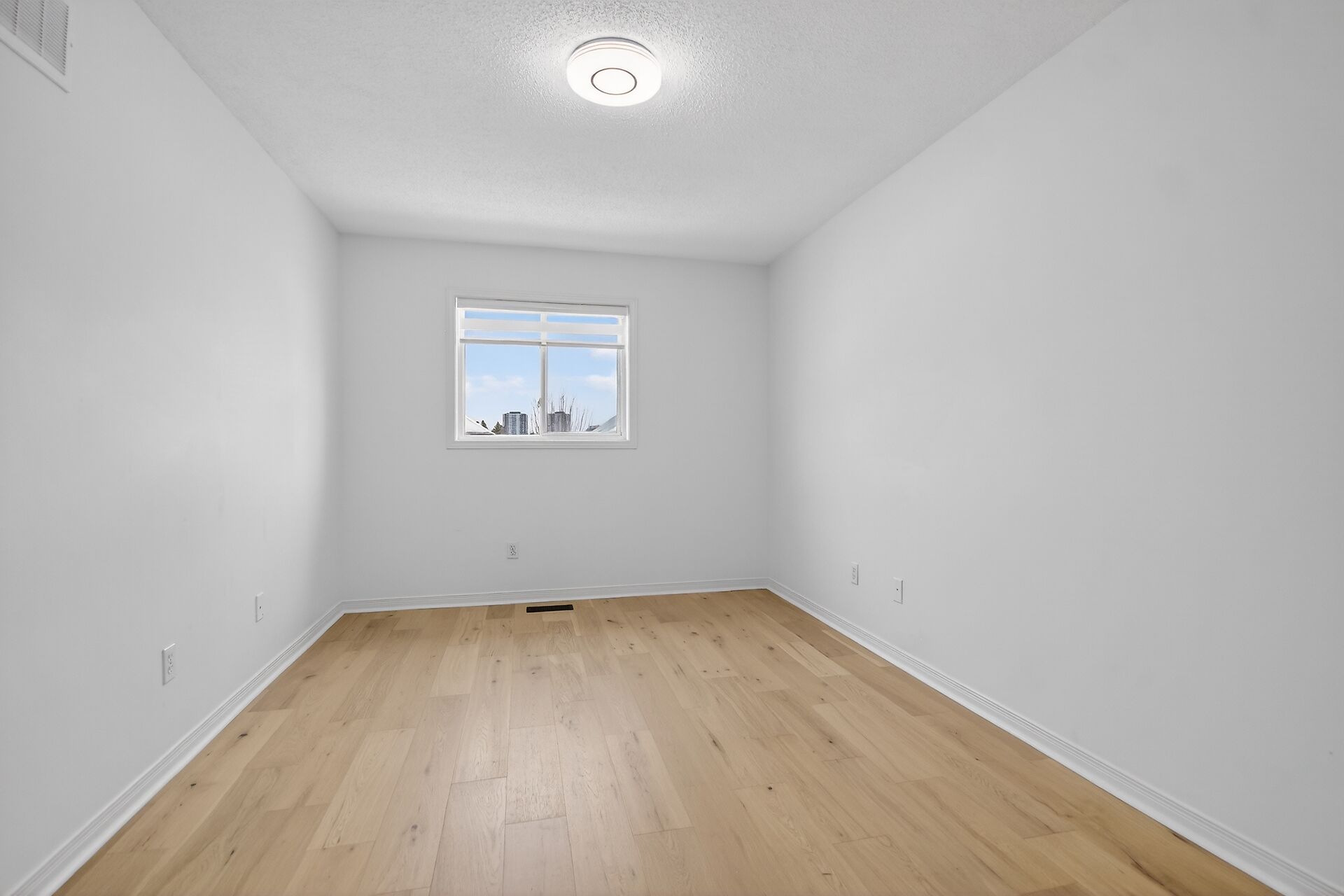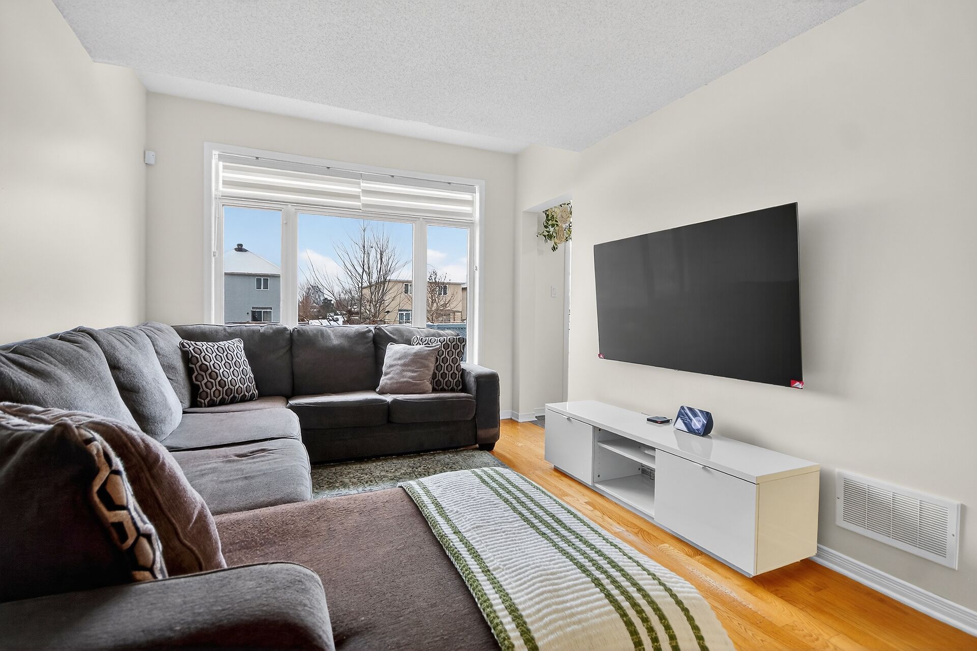Welcome to this move-in ready end-unit townhouse that backs on the albion park's walking path in the popular hunt club area! Offering 1,665 sq/ft + a finished basement, this home is conveniently located within walking distance to multiple parks, great schools, various shopping plazas, restaurants & both the albion & the jim durrell recreational centre. Walking into the open-concept main level you find a large foyer that connects to the mudroom with direct access to the garage. This bright level with hardwood floors showcases a private front office, an updated powder room, a dining room, a living room with cozy gas fireplace & a refreshed kitchen with new countertops, stainless steel appliances, gas stove, custom backsplash & eat-in area. The 2nd level has new hardwood floors and hosts 2 big secondary bedrooms, an updated main bathroom & a spacious primary bedroom with walk-in closet and private ensuite with soaker tub & stand-up shower. The lower level features a sizable family room with big windows, walk-in closet & new modern laminate floors. The large storage room has plenty of free area to expand & create more living space... Perfect for a future home gym or hobby room. This home is located on a quiet & low traffic street and backs on the walking path connected to albion park. The widened front driveway allows room to park 4 cars and the fully fenced backyard is zeroscaped with patio stones with a handy shed for extra storage. Great features and updates include: smart thermostat, custom privacy blinds, furnace & a/c (2022), freshly painted (2025), stair carpet (2025), 2nd level hardwood (2025), basement laminate flooring (2025), kitchen countertops (2025).