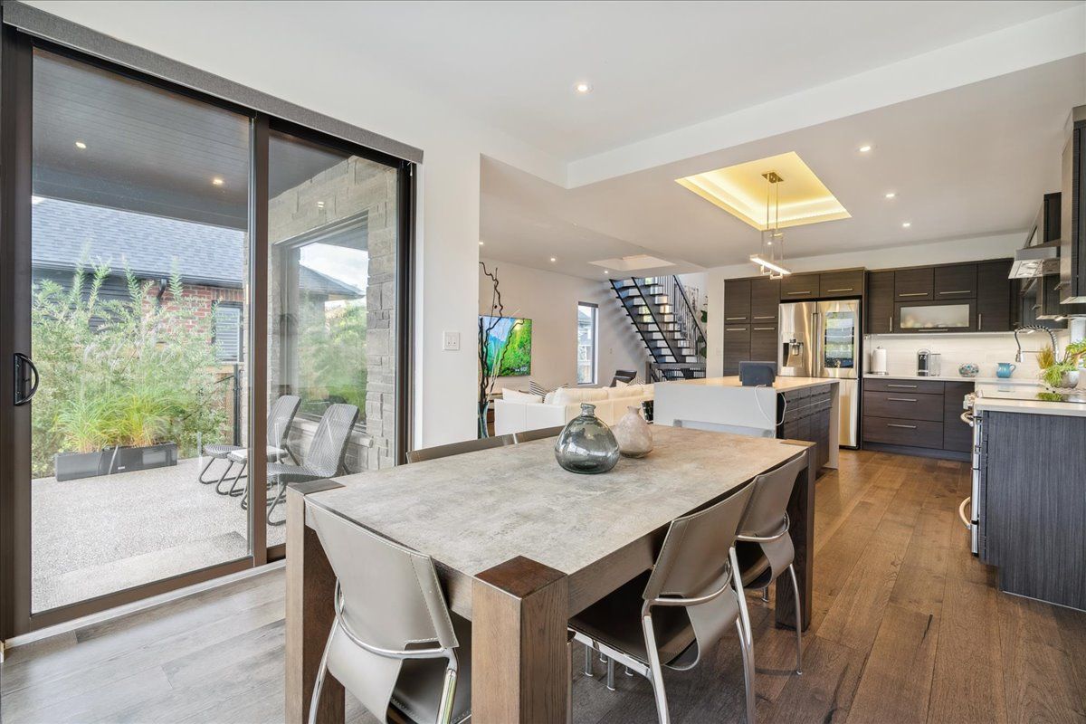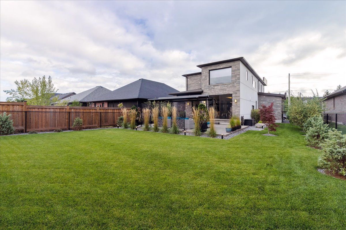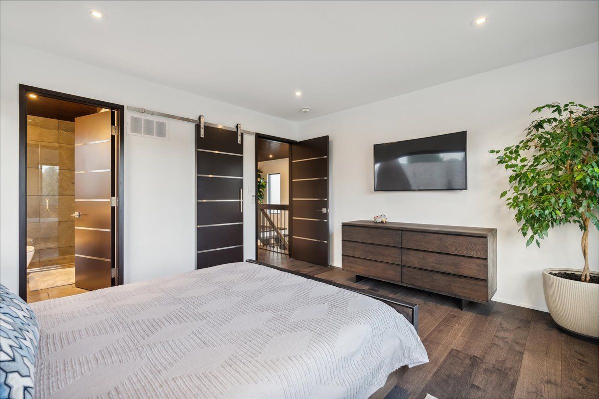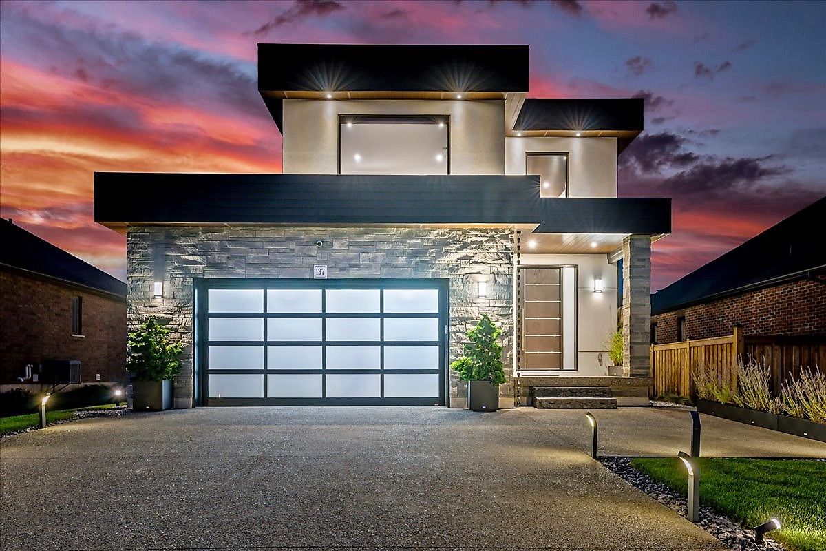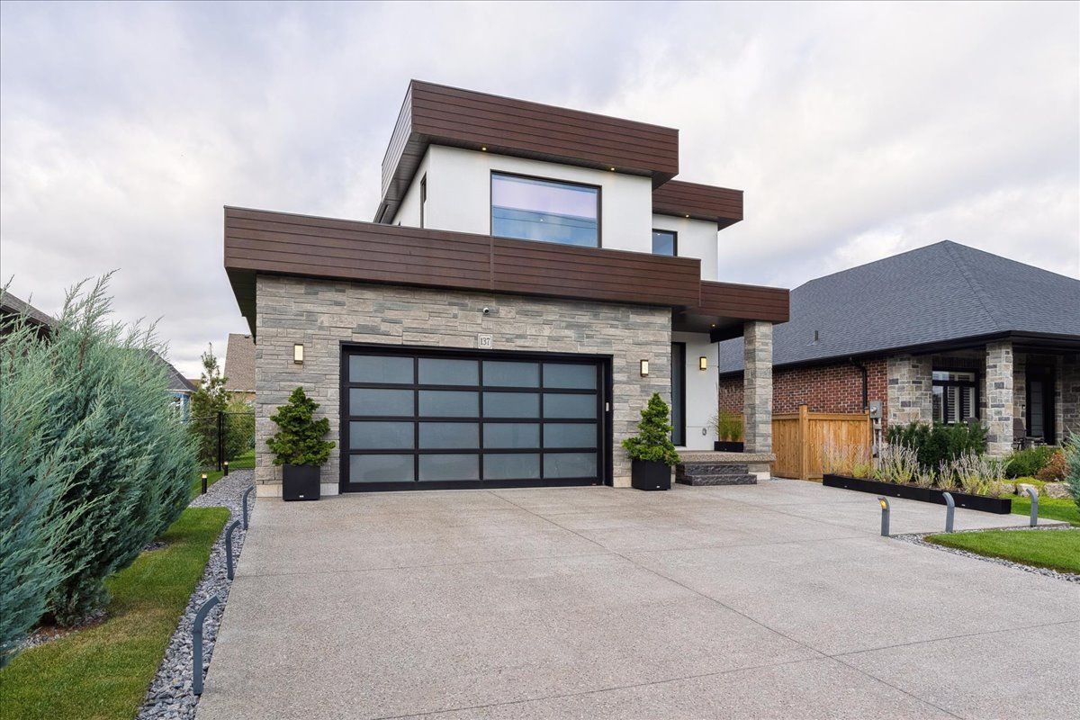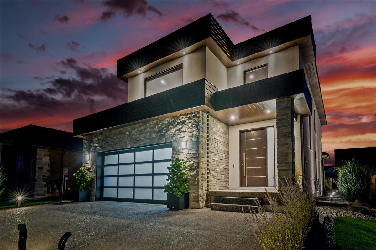 Custom contemporary home offering over 3,000 sq ft of finished living space with quality craftsmanship and smart home features throughout. Striking exterior with exposed aggregate concrete driveway, stone and stucco accents, glass garage door, and extensive exterior lighting. Dramatic two-storey foyer with open riser staircase and modern railings. Open concept main level featuring living, dining and kitchen areas ideal for entertaining, with walkout to a covered porch and spacious rear patio. Kitchen showcases quartz countertops, waterfall island, hardwood flooring, and smart appliances. Featuring two large primary bedrooms, both with ensuite privileges, plus a loft with a distinctive glass floor feature. Spa-inspired ensuite includes a jetted tub with ambient lighting. Fully finished lower level offers flexible space ideal for a home office, theatre room, or recreation area. Additional features include solid core interior and barn doors, composite ceiling details, and numerous custom finishes throughout.