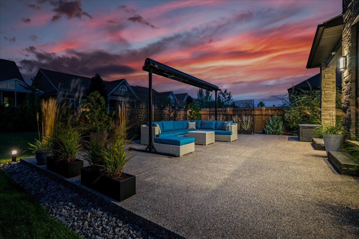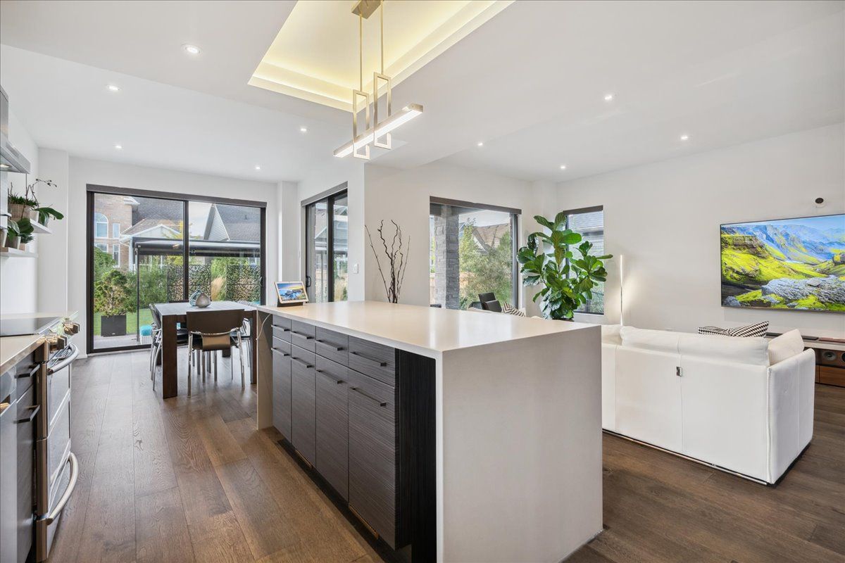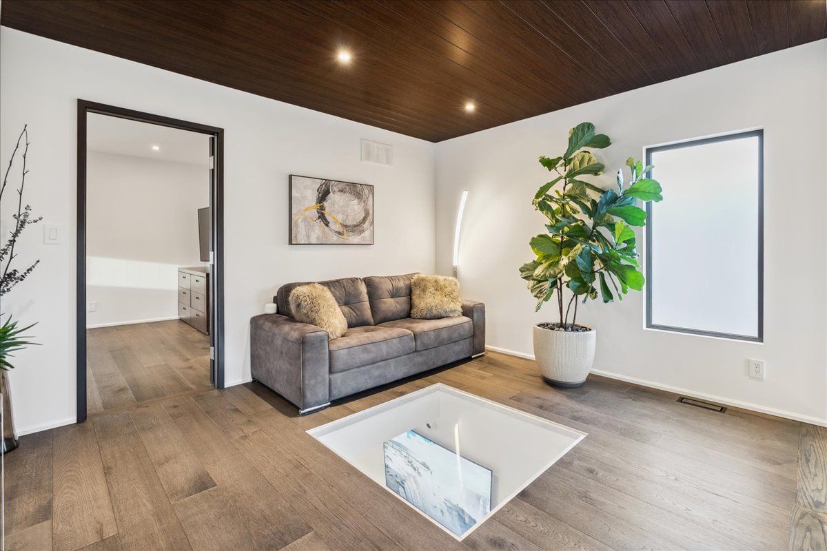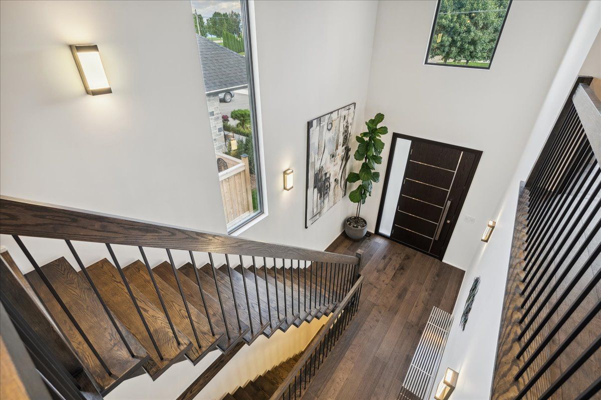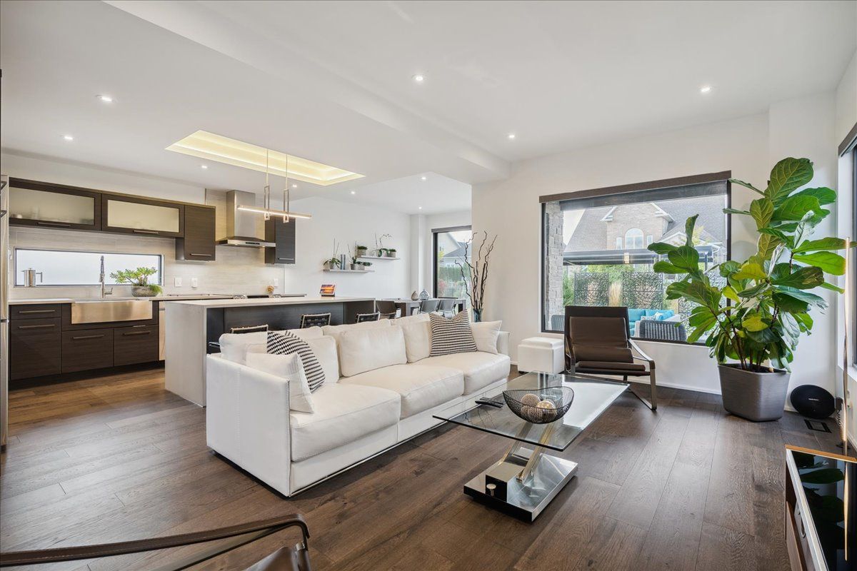 Custom contemporary home offering over 3,000 sq ft of finished living space with quality craftsmanship and smart home features throughout. Striking exterior with exposed aggregate concrete driveway, stone and stucco accents, glass garage door, and extensive exterior lighting. Dramatic two-storey foyer with open riser staircase and modern railings. Open concept main level featuring living, dining and kitchen areas ideal for entertaining, with walkout to a covered porch and spacious rear patio. Kitchen showcases quartz countertops, waterfall island, hardwood flooring, and smart appliances. Featuring two large primary bedrooms, both with ensuite privileges, plus a loft with a distinctive glass floor feature. Spa-inspired ensuite includes a jetted tub with ambient lighting. Fully finished lower level offers flexible space ideal for a home office, theatre room, or recreation area. Additional features include solid core interior and barn doors, composite ceiling details, and numerous custom finishes throughout.