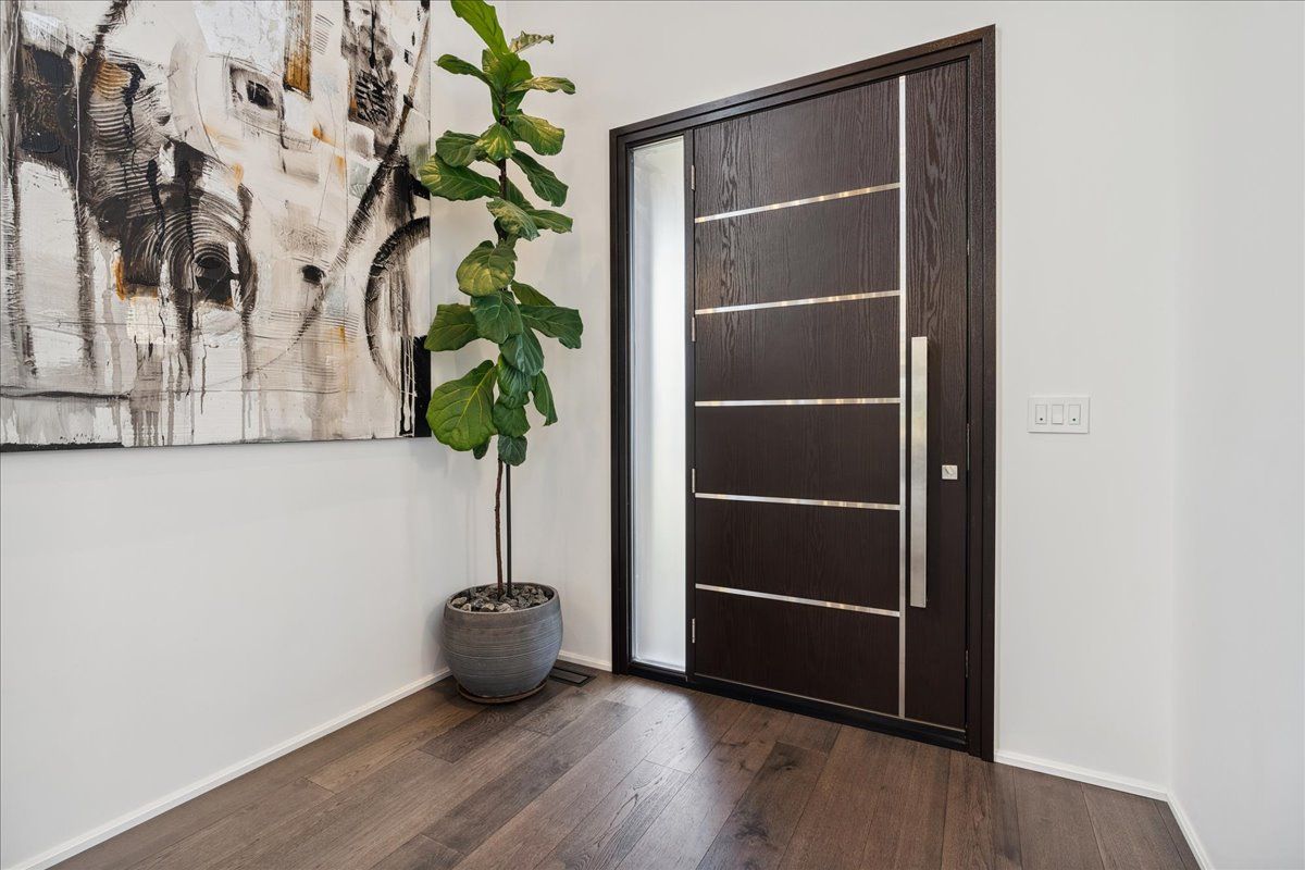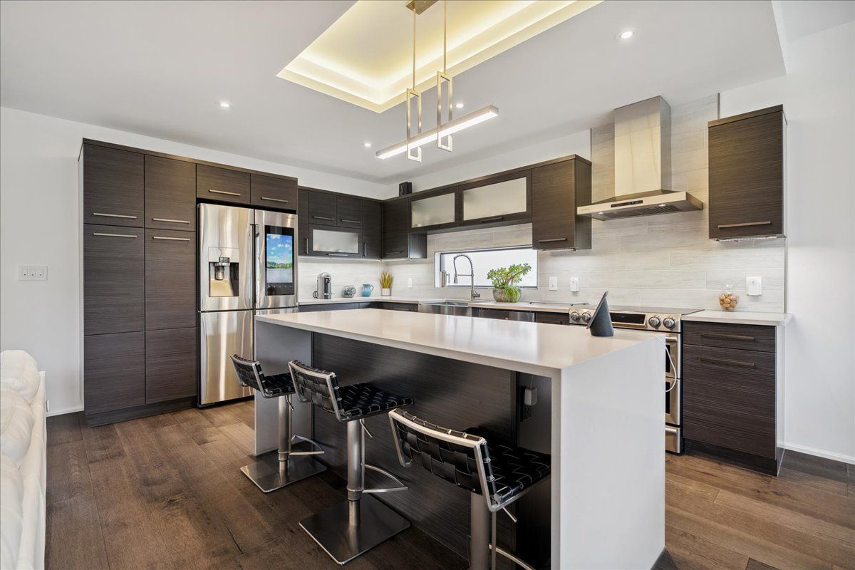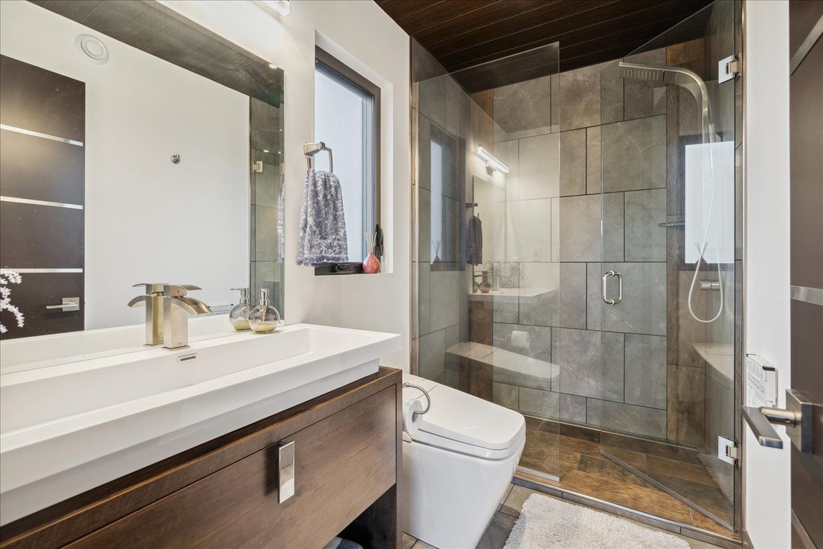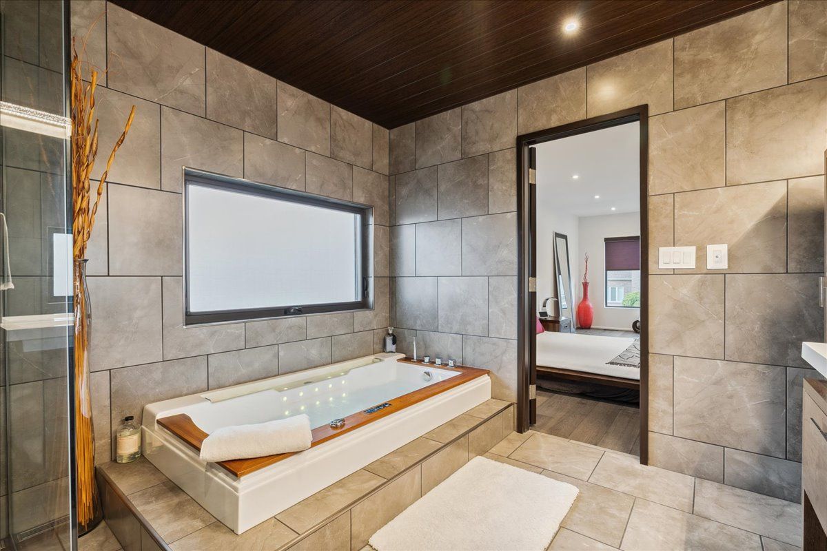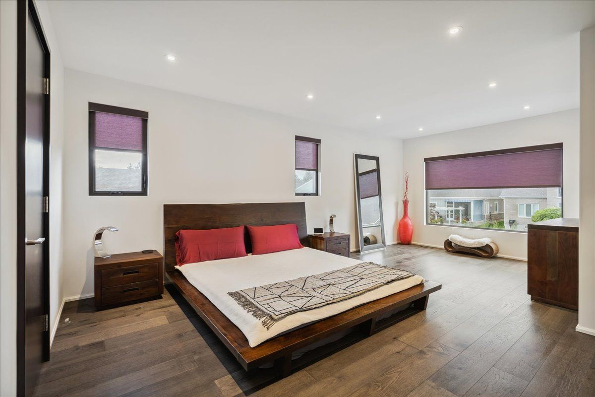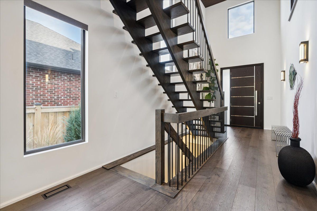 Custom contemporary home offering over 3,000 sq ft of finished living space with quality craftsmanship and smart home features throughout. Striking exterior with exposed aggregate concrete driveway, stone and stucco accents, glass garage door, and extensive exterior lighting. Dramatic two-storey foyer with open riser staircase and modern railings. Open concept main level featuring living, dining and kitchen areas ideal for entertaining, with walkout to a covered porch and spacious rear patio. Kitchen showcases quartz countertops, waterfall island, hardwood flooring, and smart appliances. Featuring two large primary bedrooms, both with ensuite privileges, plus a loft with a distinctive glass floor feature. Spa-inspired ensuite includes a jetted tub with ambient lighting. Fully finished lower level offers flexible space ideal for a home office, theatre room, or recreation area. Additional features include solid core interior and barn doors, composite ceiling details, and numerous custom finishes throughout.