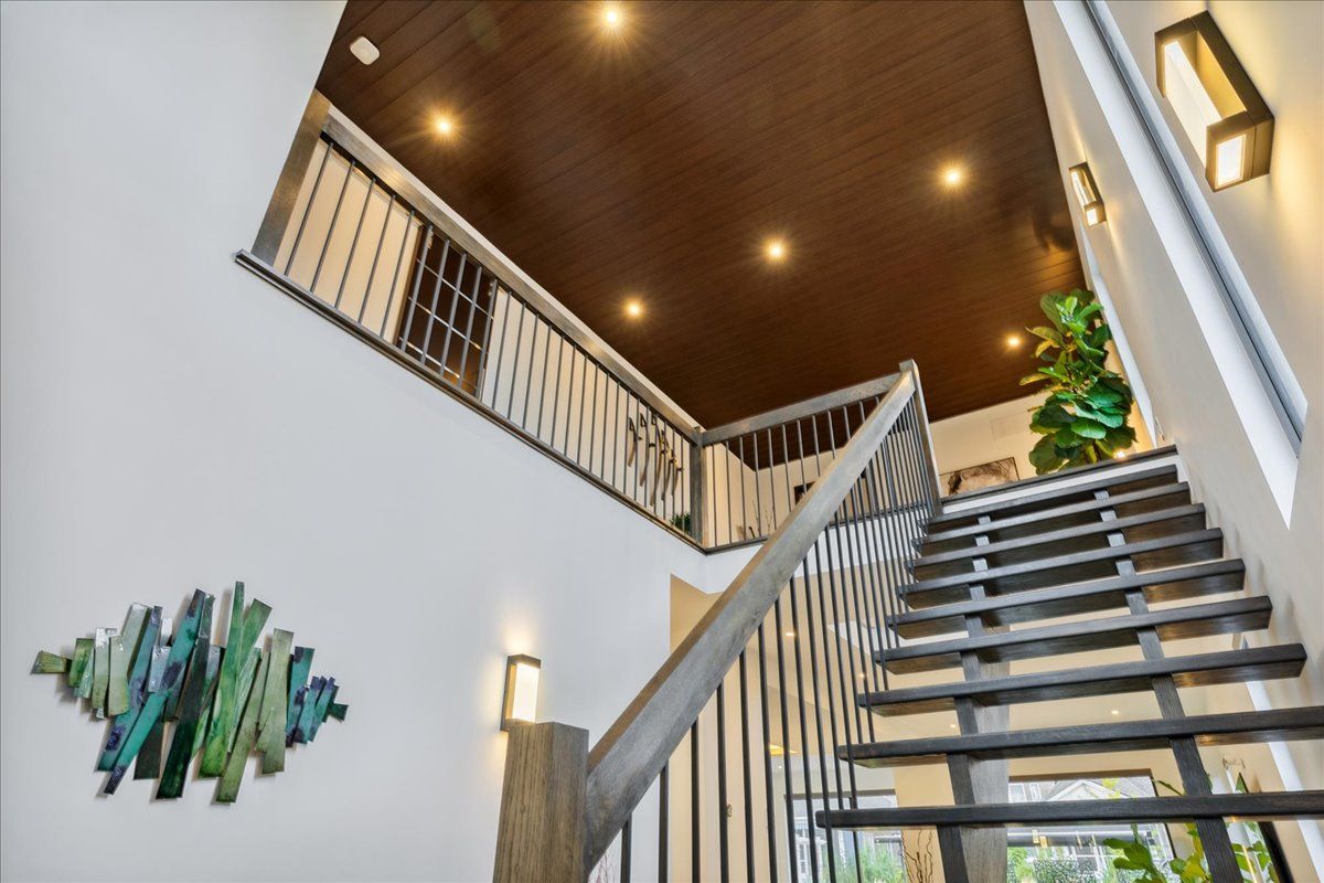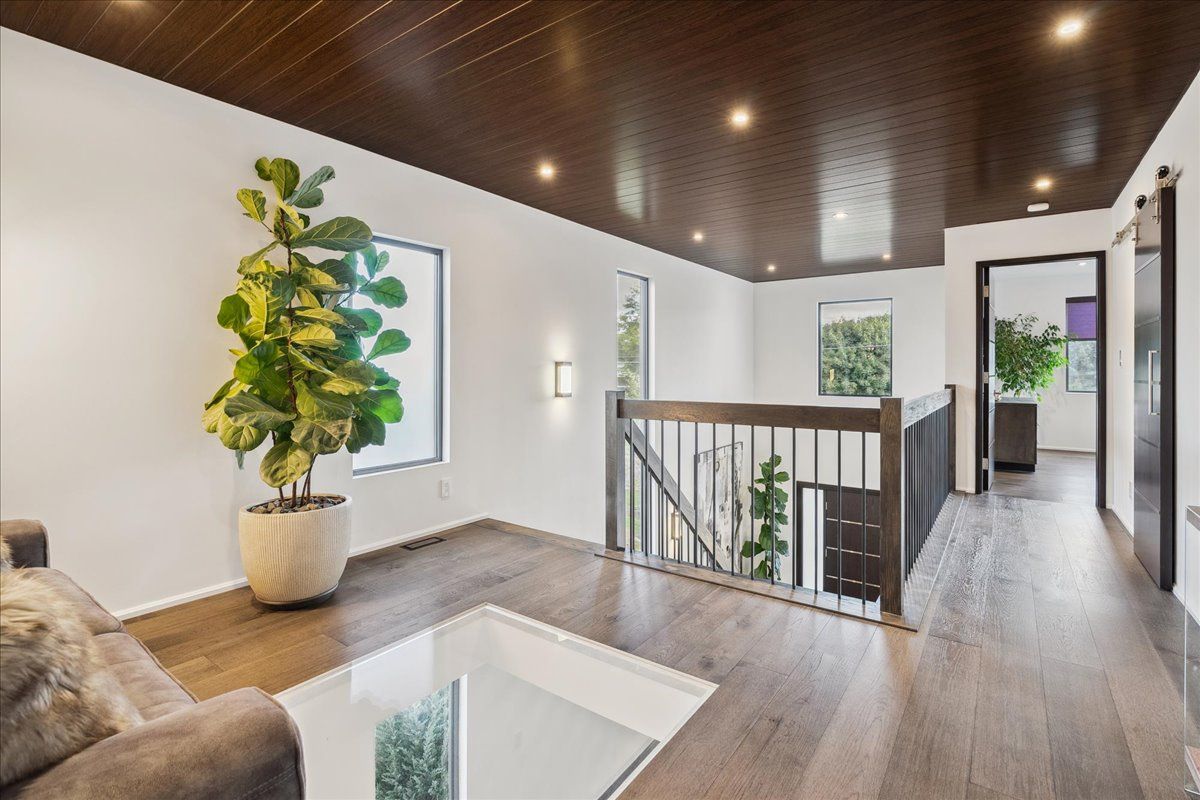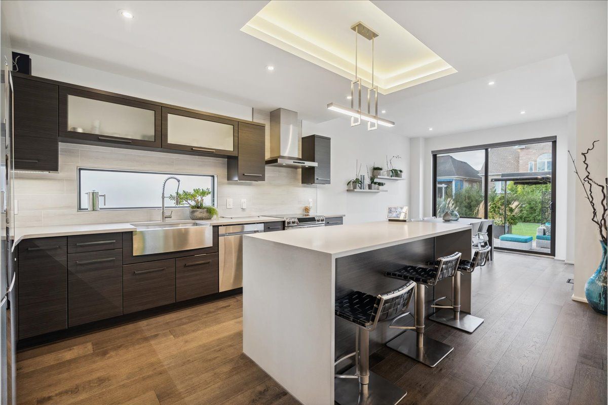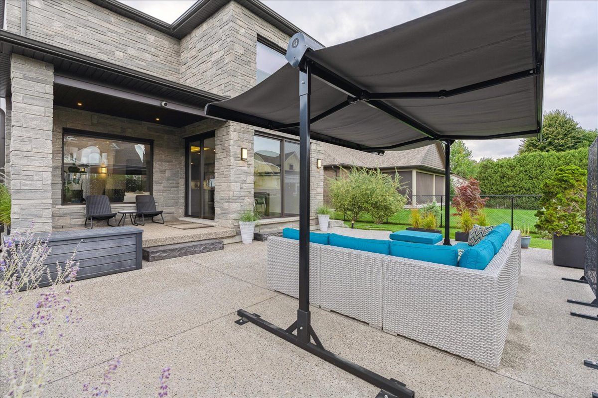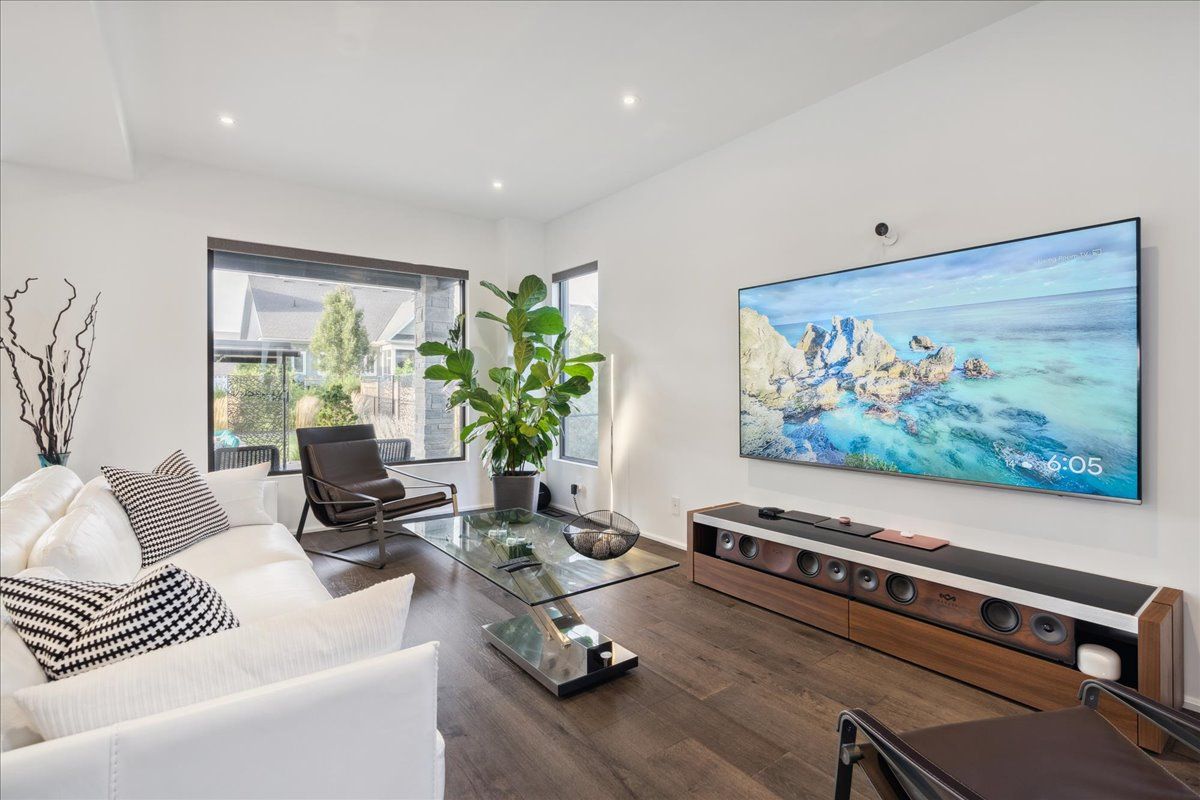 Custom contemporary home offering over 3,000 sq ft of finished living space with quality craftsmanship and smart home features throughout. Striking exterior with exposed aggregate concrete driveway, stone and stucco accents, glass garage door, and extensive exterior lighting. Dramatic two-storey foyer with open riser staircase and modern railings. Open concept main level featuring living, dining and kitchen areas ideal for entertaining, with walkout to a covered porch and spacious rear patio. Kitchen showcases quartz countertops, waterfall island, hardwood flooring, and smart appliances. Featuring two large primary bedrooms, both with ensuite privileges, plus a loft with a distinctive glass floor feature. Spa-inspired ensuite includes a jetted tub with ambient lighting. Fully finished lower level offers flexible space ideal for a home office, theatre room, or recreation area. Additional features include solid core interior and barn doors, composite ceiling details, and numerous custom finishes throughout.