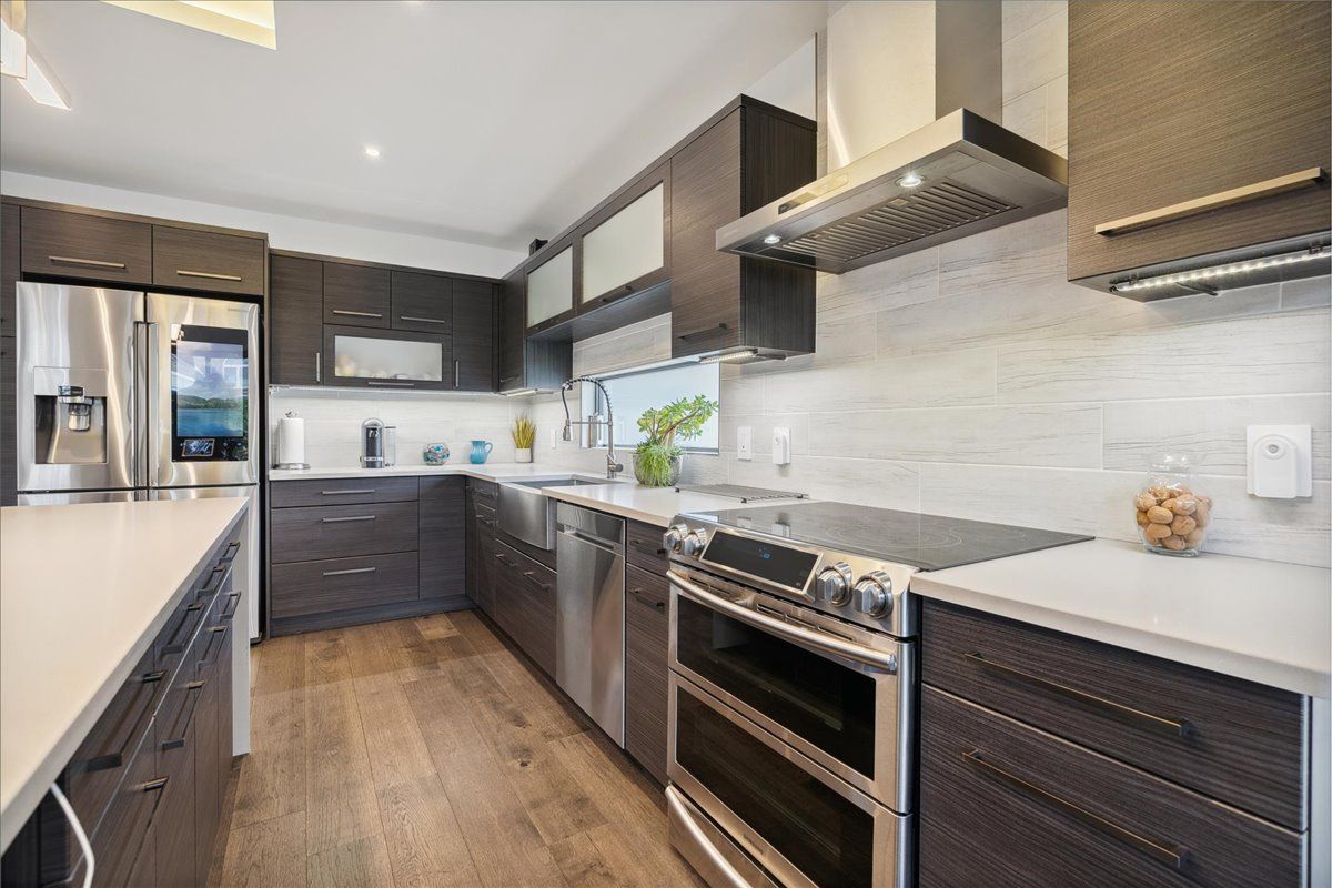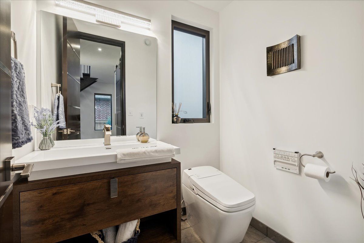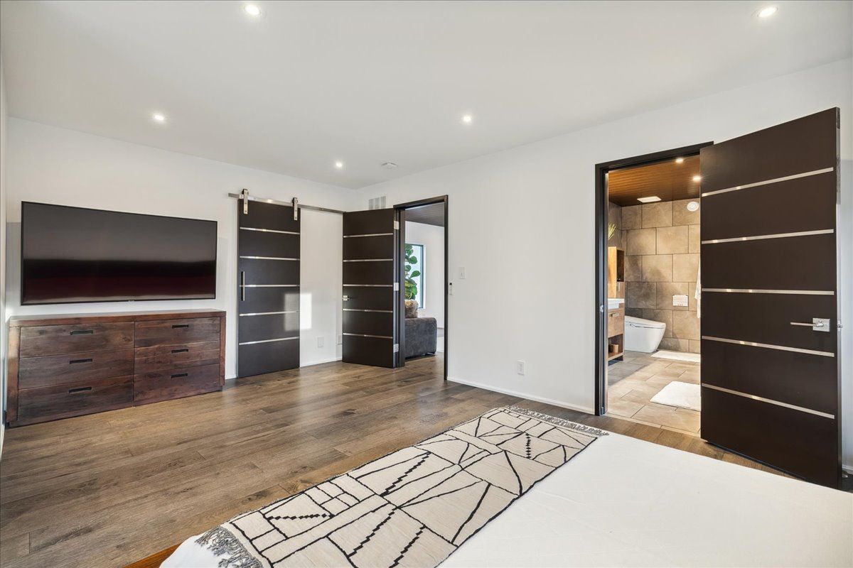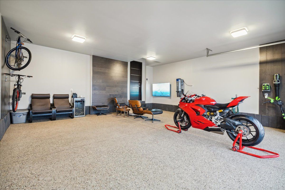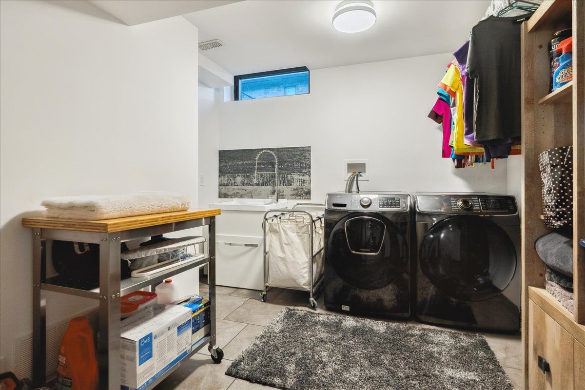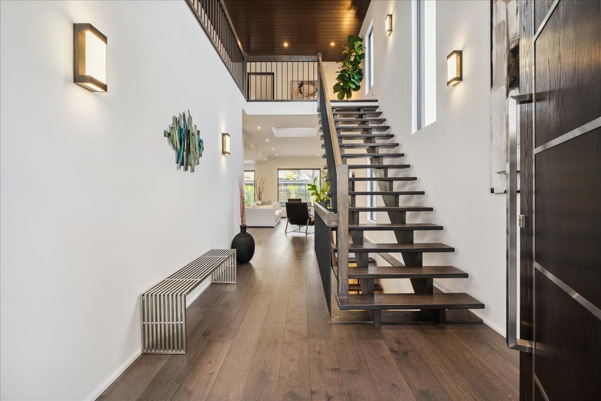 Custom contemporary home offering over 3,000 sq ft of finished living space with quality craftsmanship and smart home features throughout. Striking exterior with exposed aggregate concrete driveway, stone and stucco accents, glass garage door, and extensive exterior lighting. Dramatic two-storey foyer with open riser staircase and modern railings. Open concept main level featuring living, dining and kitchen areas ideal for entertaining, with walkout to a covered porch and spacious rear patio. Kitchen showcases quartz countertops, waterfall island, hardwood flooring, and smart appliances. Featuring two large primary bedrooms, both with ensuite privileges, plus a loft with a distinctive glass floor feature. Spa-inspired ensuite includes a jetted tub with ambient lighting. Fully finished lower level offers flexible space ideal for a home office, theatre room, or recreation area. Additional features include solid core interior and barn doors, composite ceiling details, and numerous custom finishes throughout.
